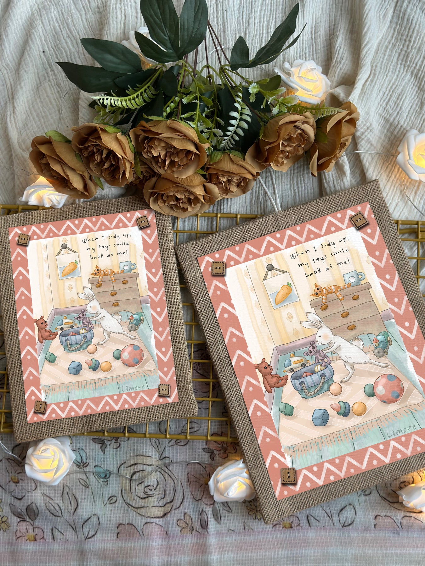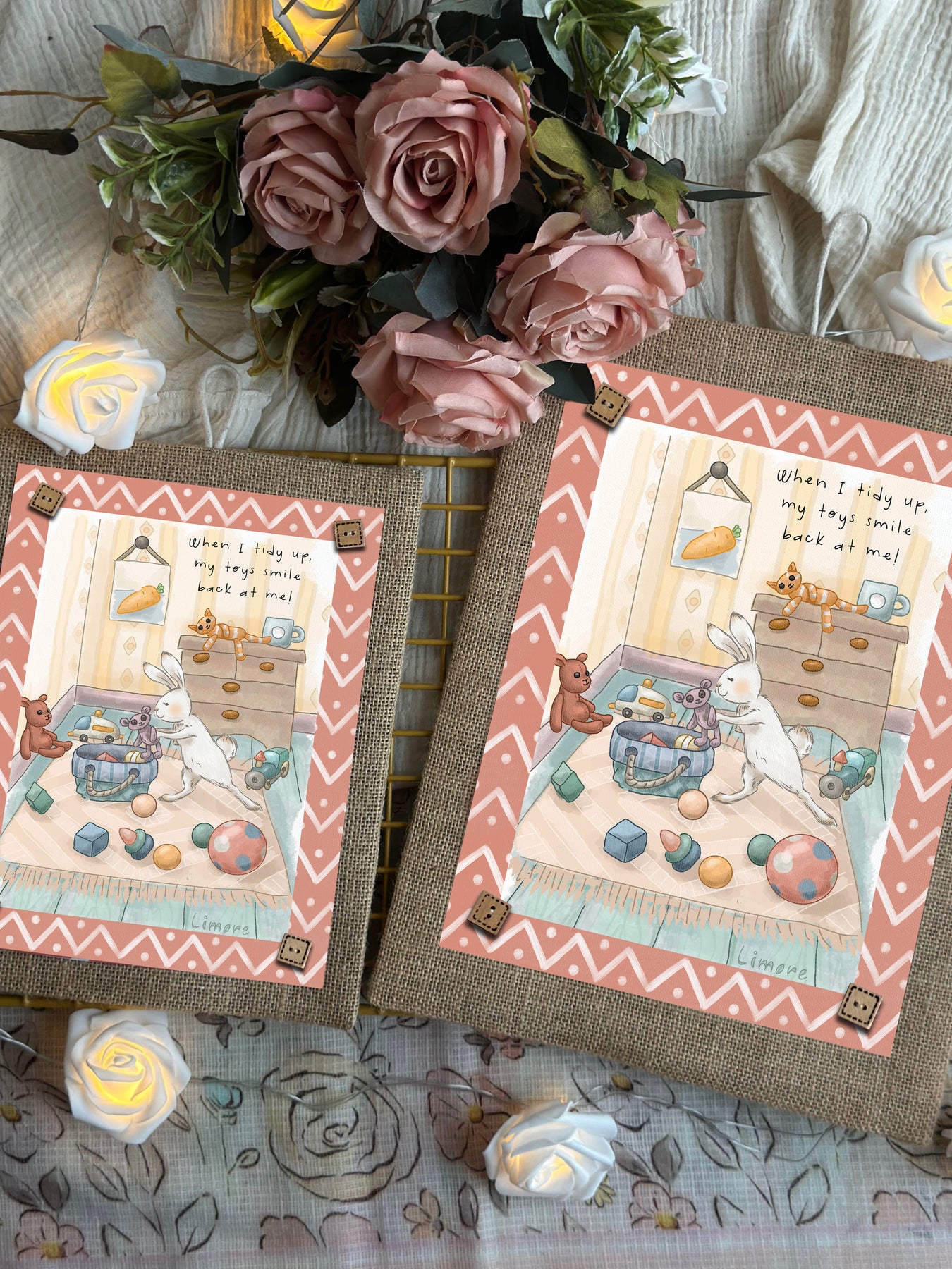 This sweet illustration from our Bunny’s Good Habits collection features Bunny tidying up and organizing toys with a smile. The quote reads: “When I tidy up, my toys smile back at me.”
