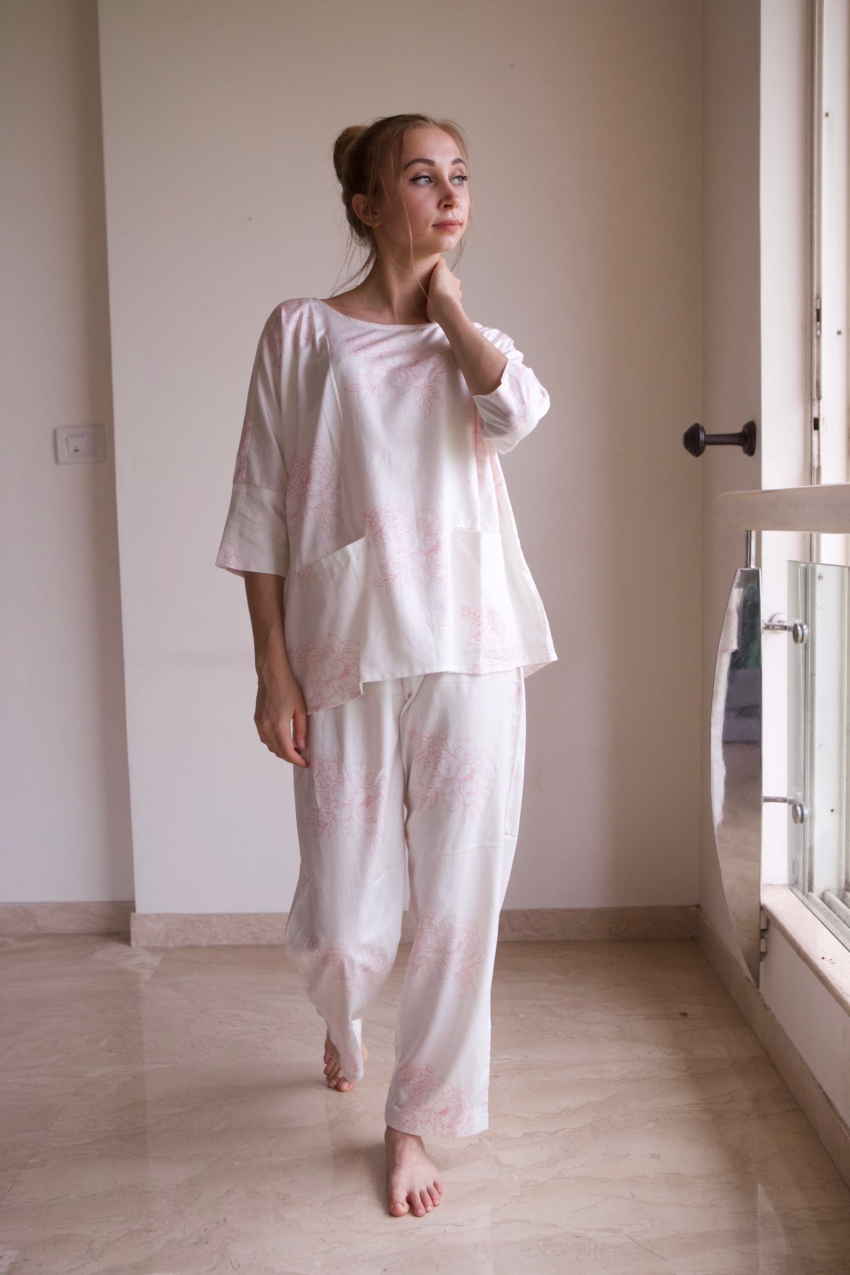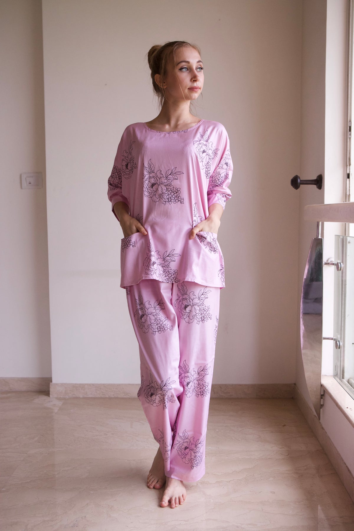This pajama set features an oversized, relaxed shirt with a drop-shoulder style, short sleeves, and convenient front pockets.