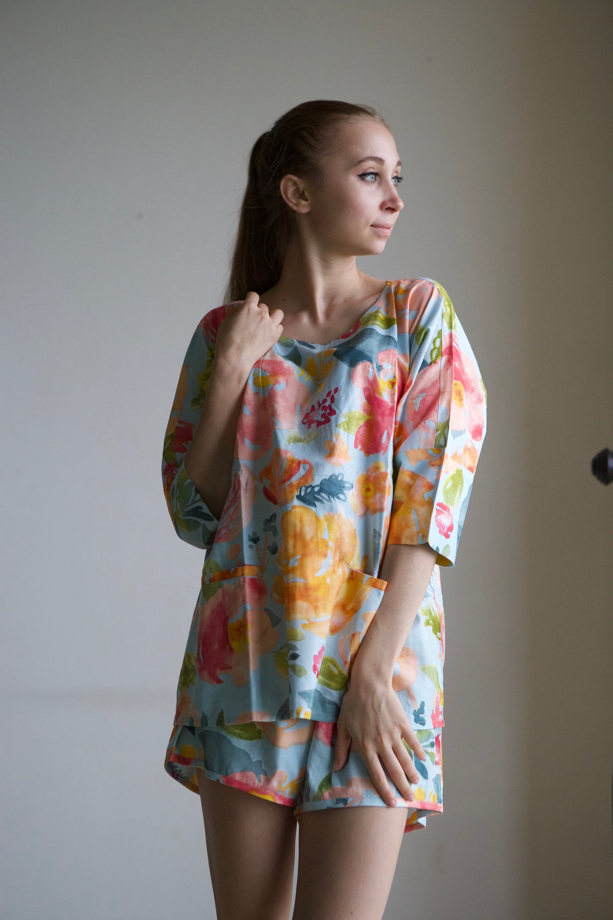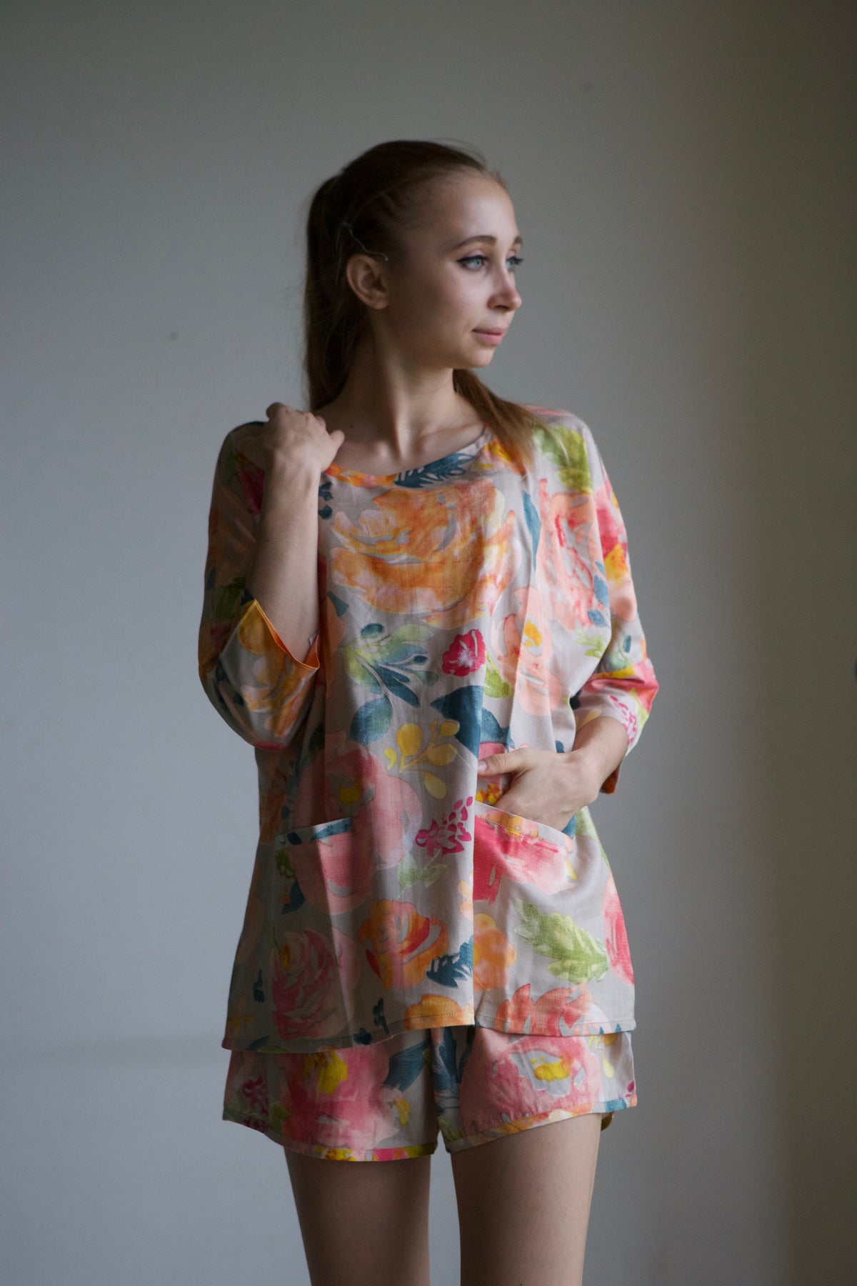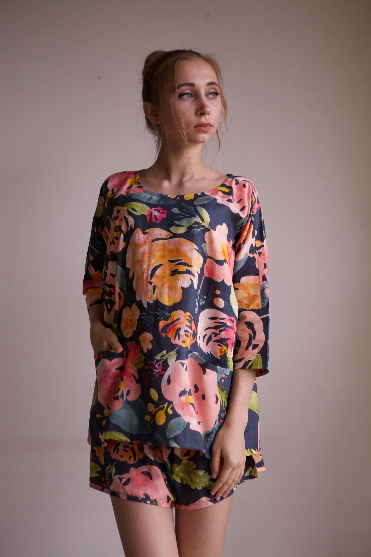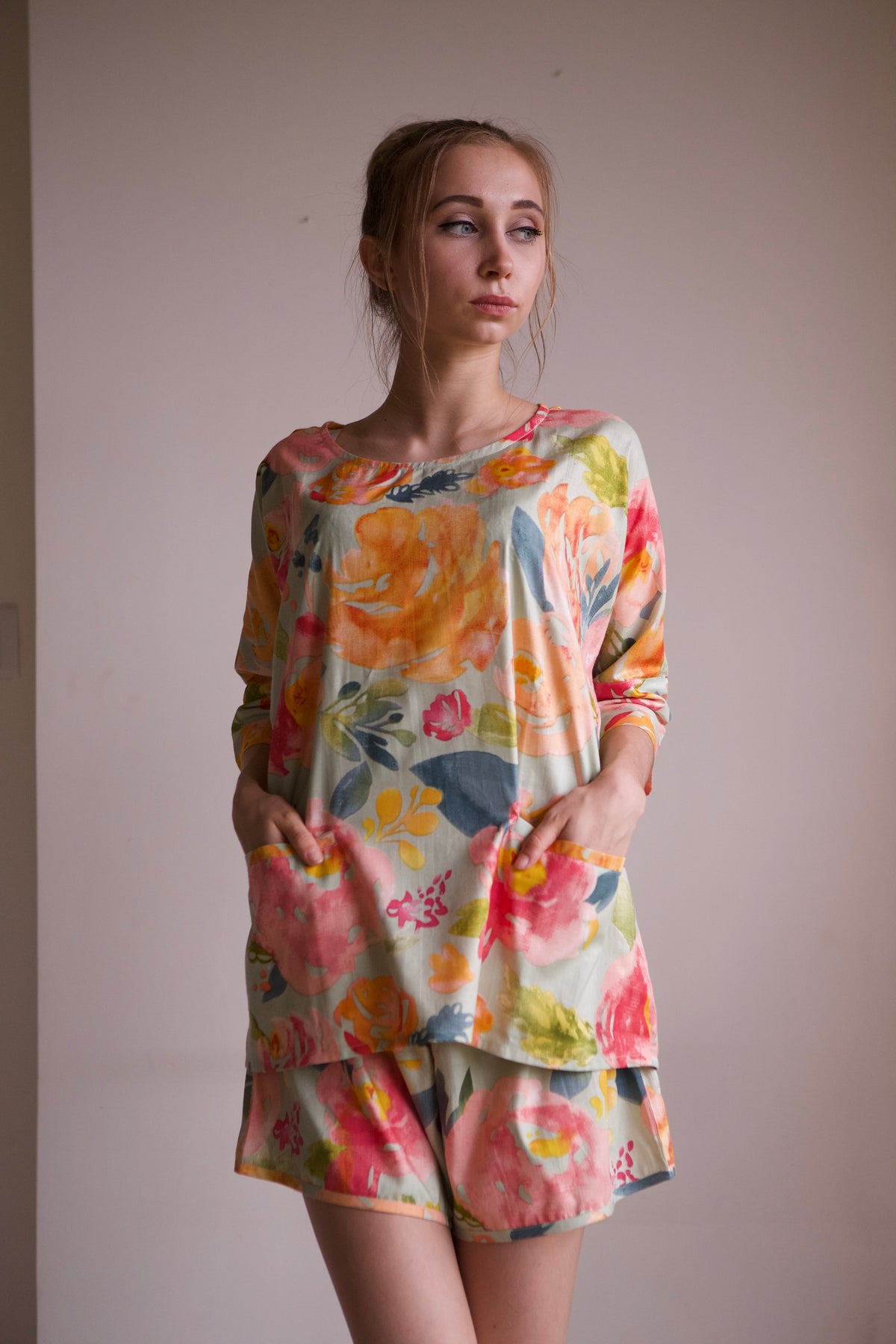 This pajama set features an oversized, relaxed shirt with a drop-shoulder style, short sleeves, and convenient front pockets.