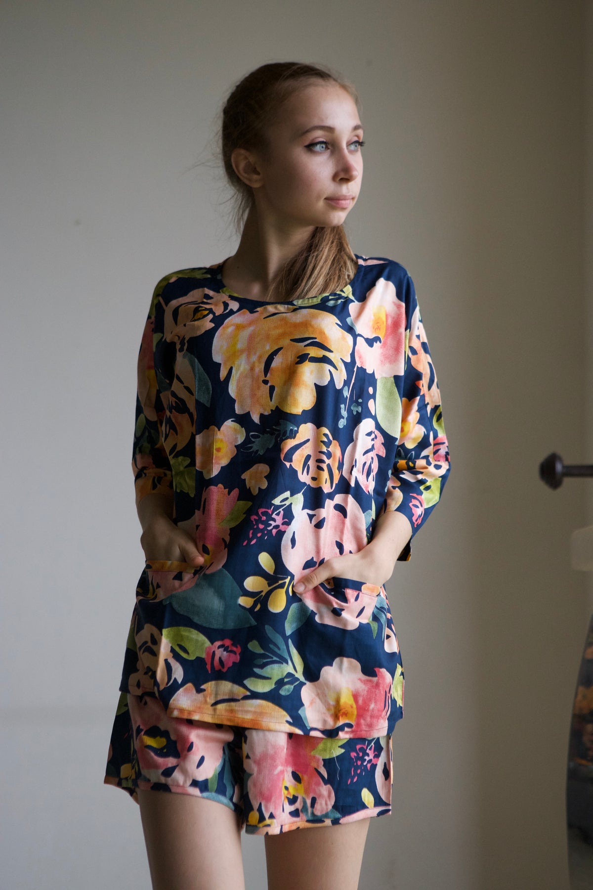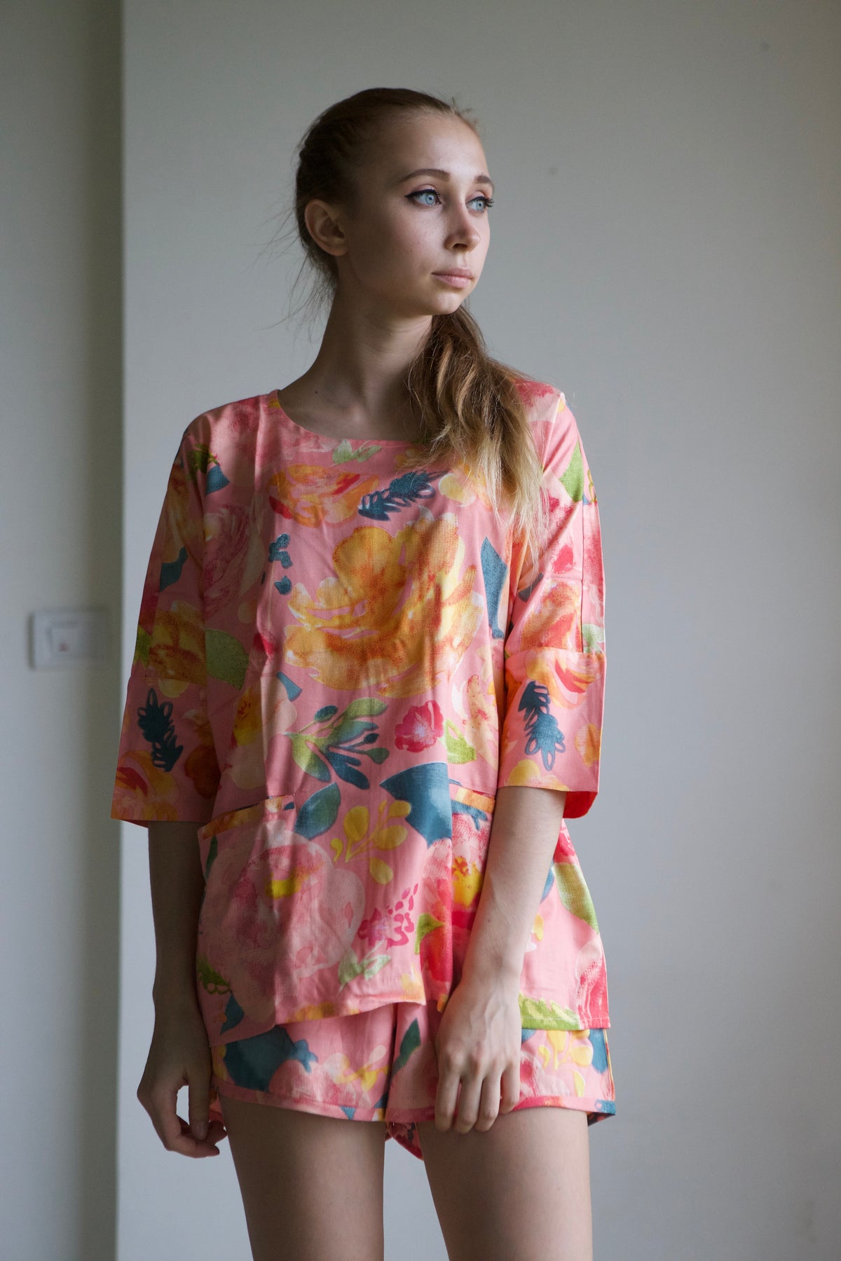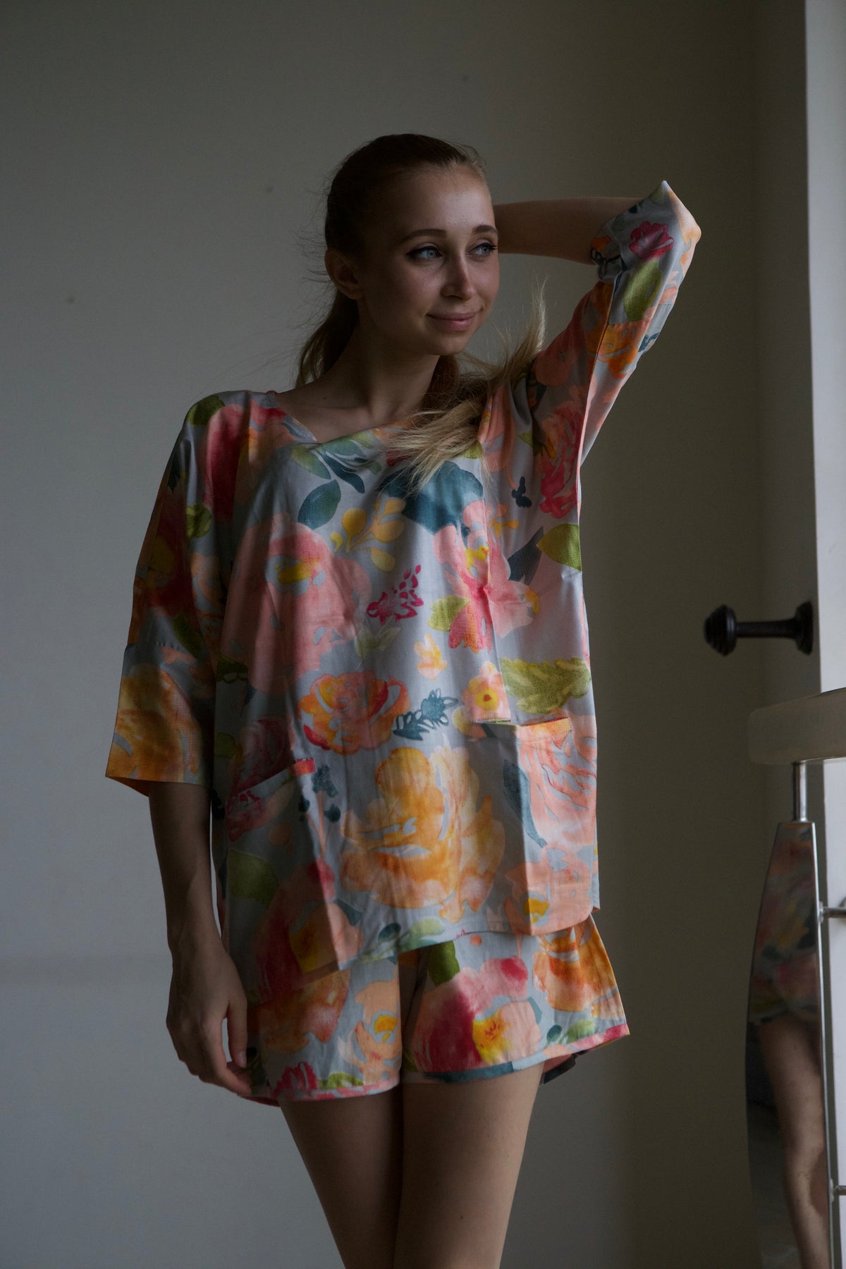 This pajama set features an oversized, relaxed shirt with a drop-shoulder style, short sleeves, and convenient front pockets.