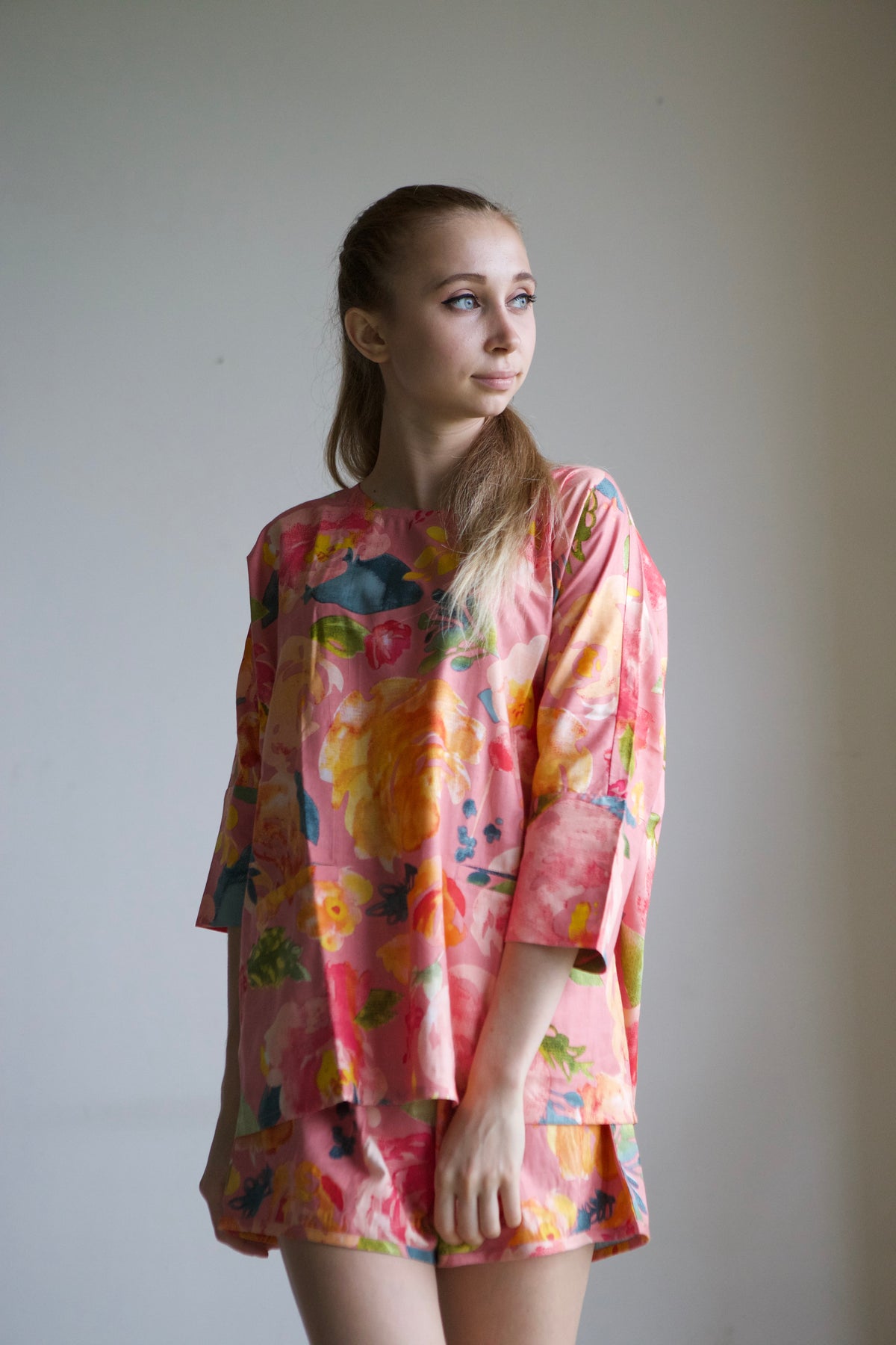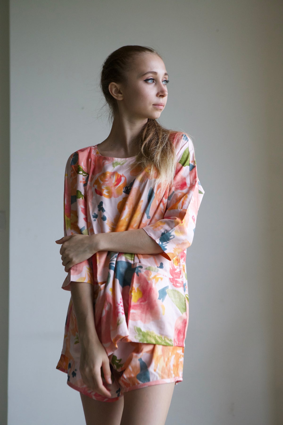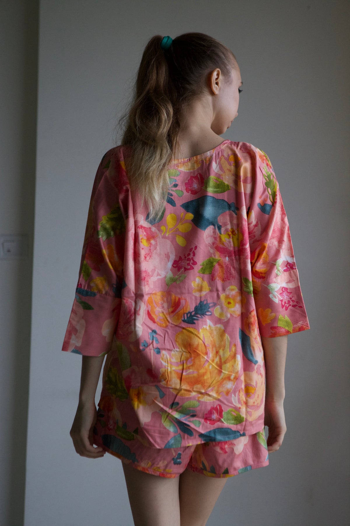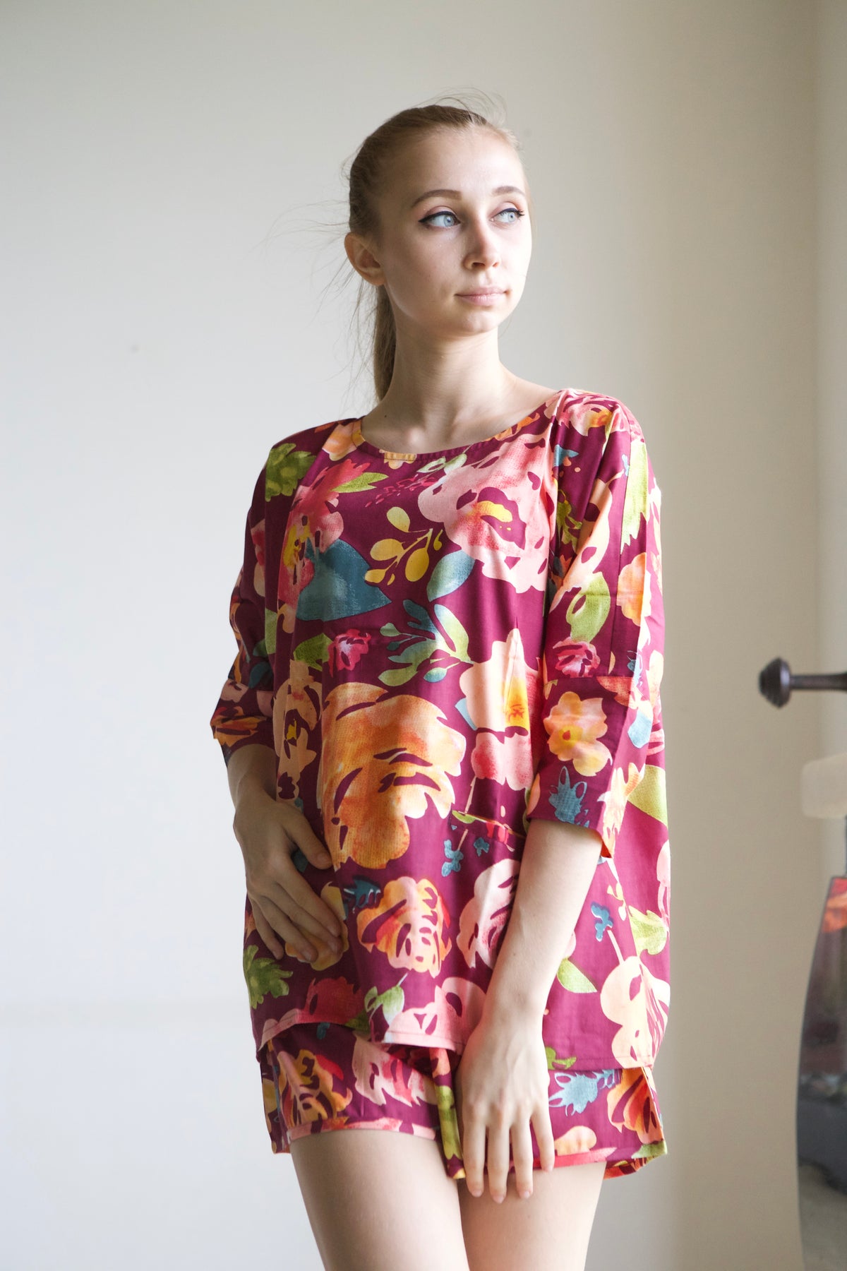 This pajama set features an oversized, relaxed shirt with a drop-shoulder style, short sleeves, and convenient front pockets.