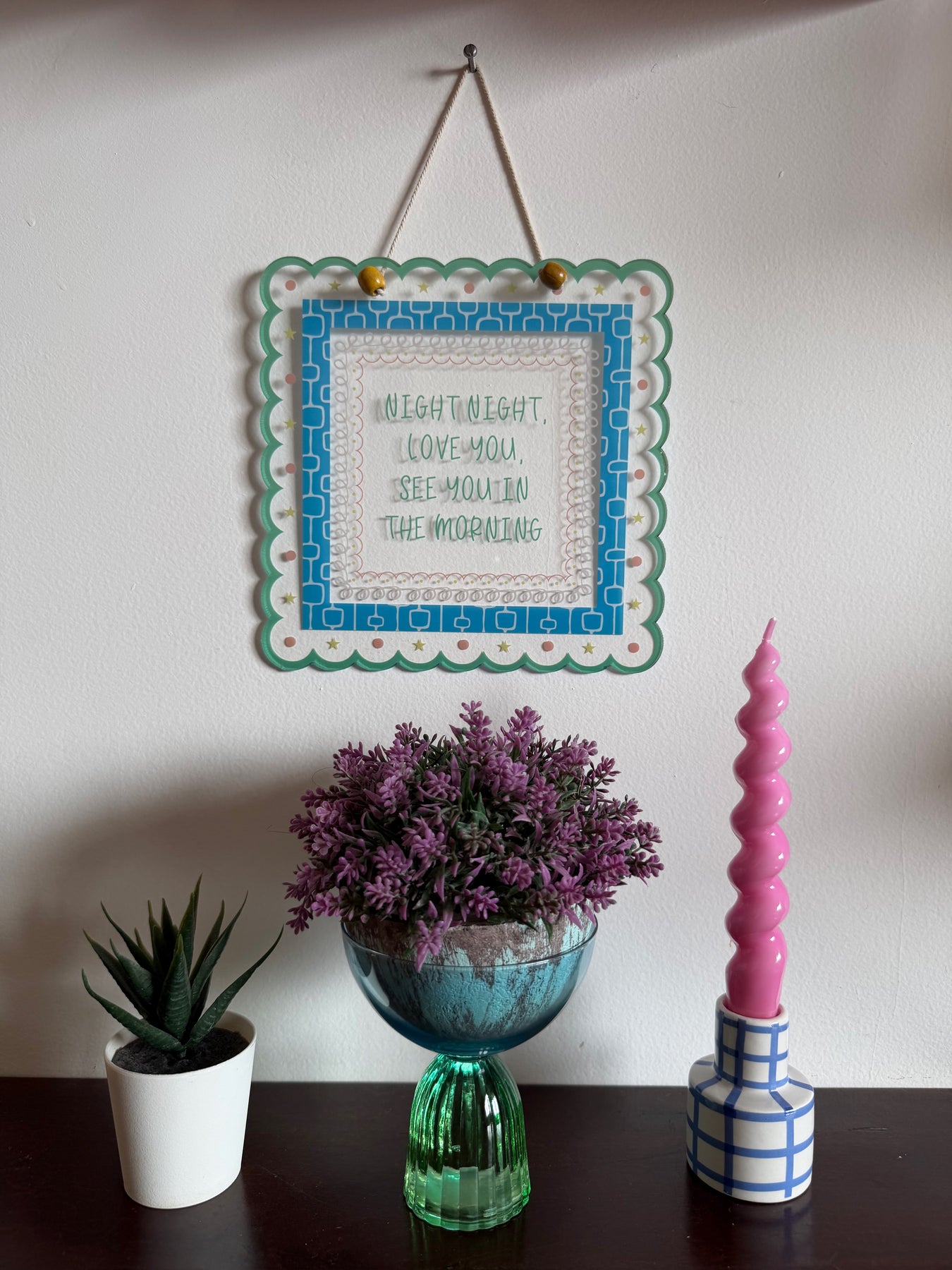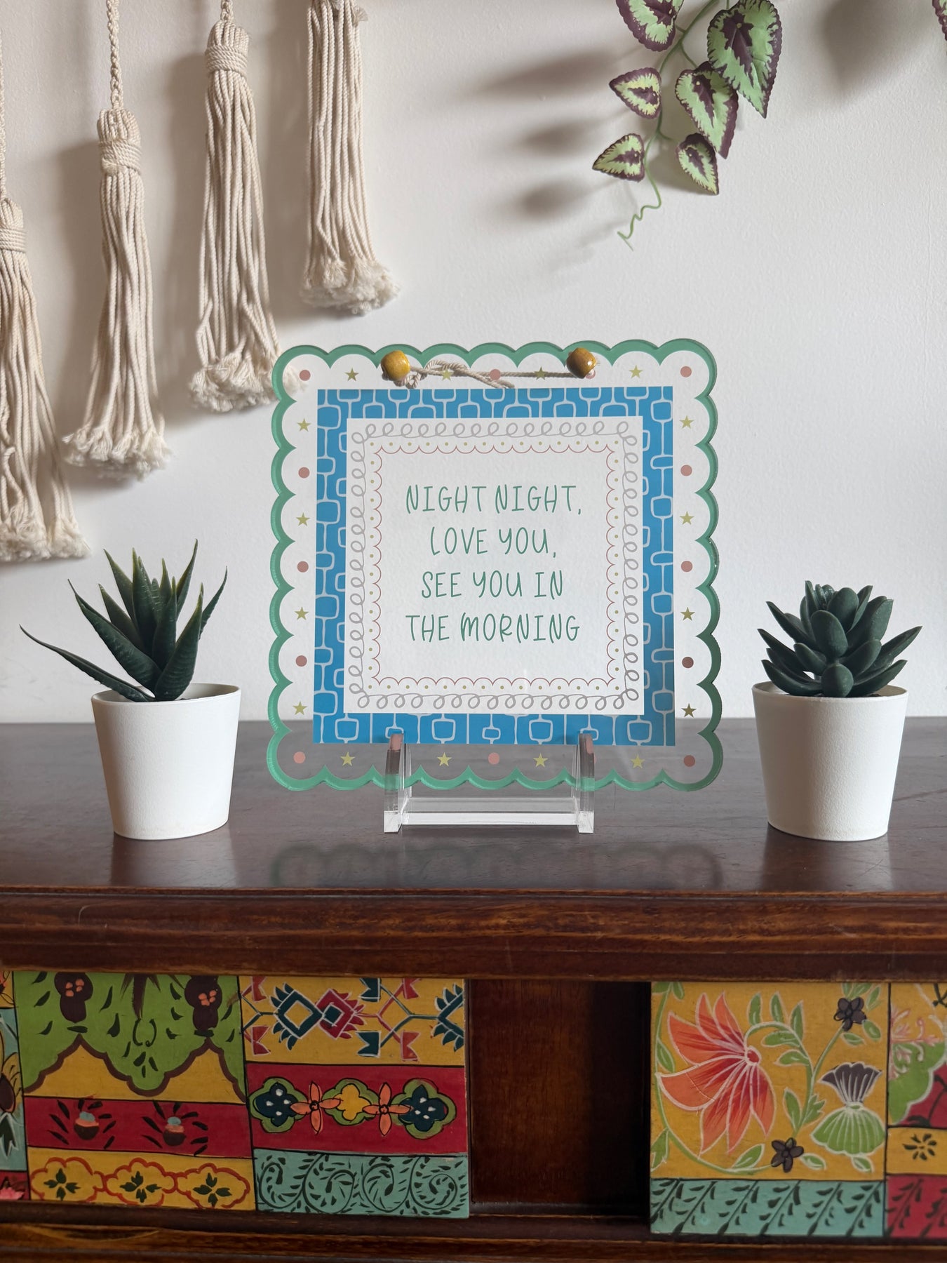 This square design features a soft green scalloped border with blue patterned edges, adding a tender, cozy feel. The quote “Night night, love you, see you in the morning” captures a comforting bedtime ritual — a quiet reminder of love, warmth, and connection before rest.