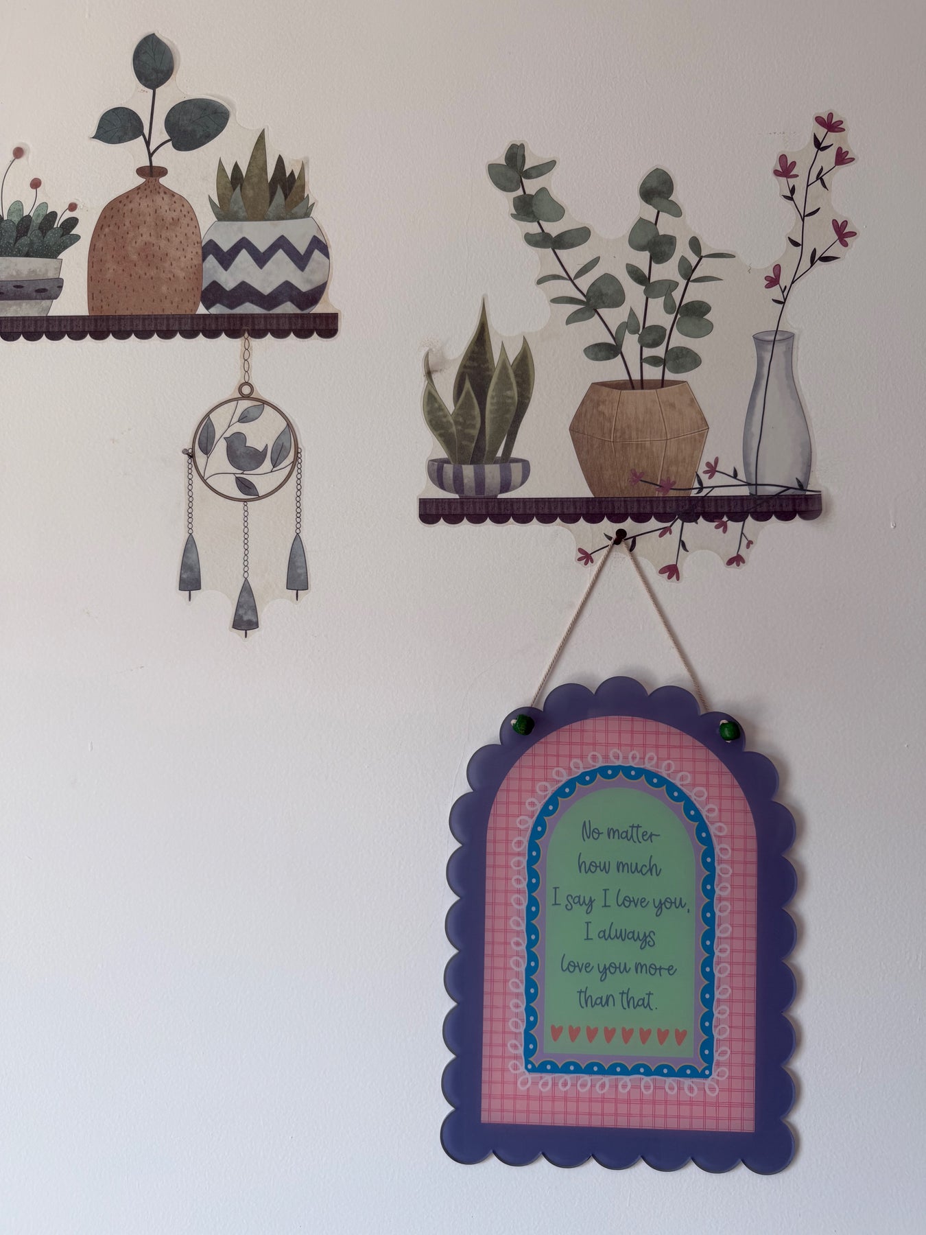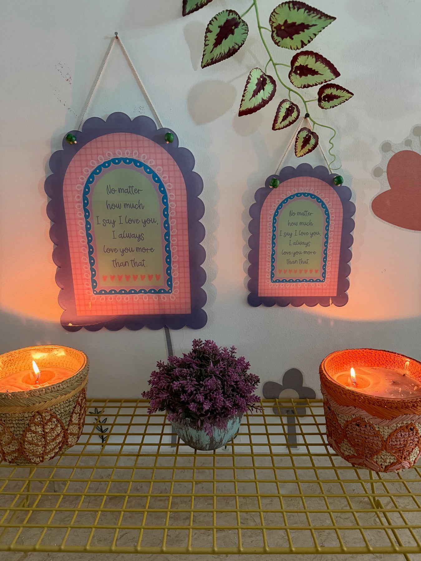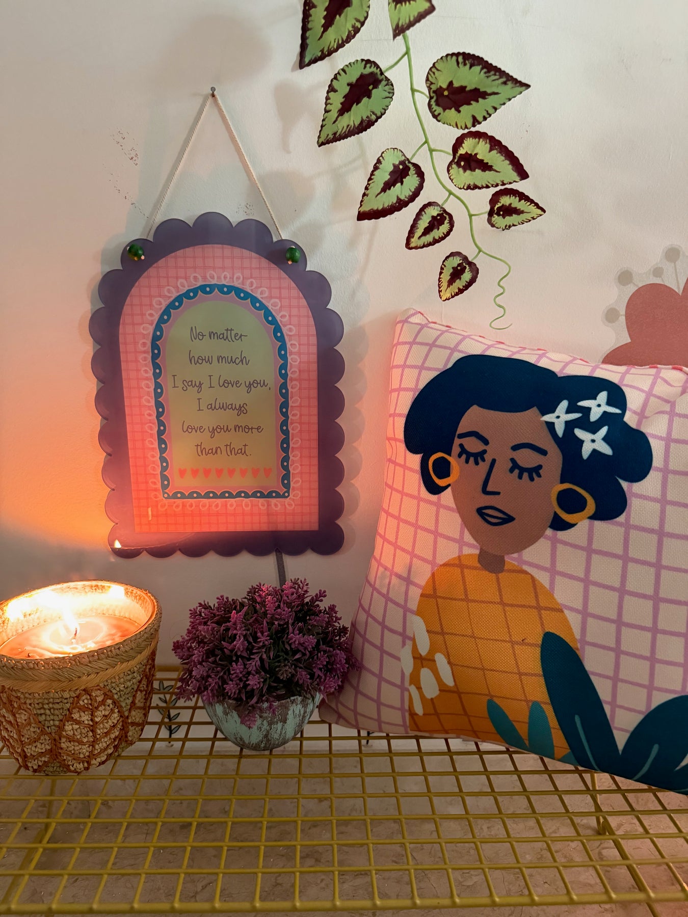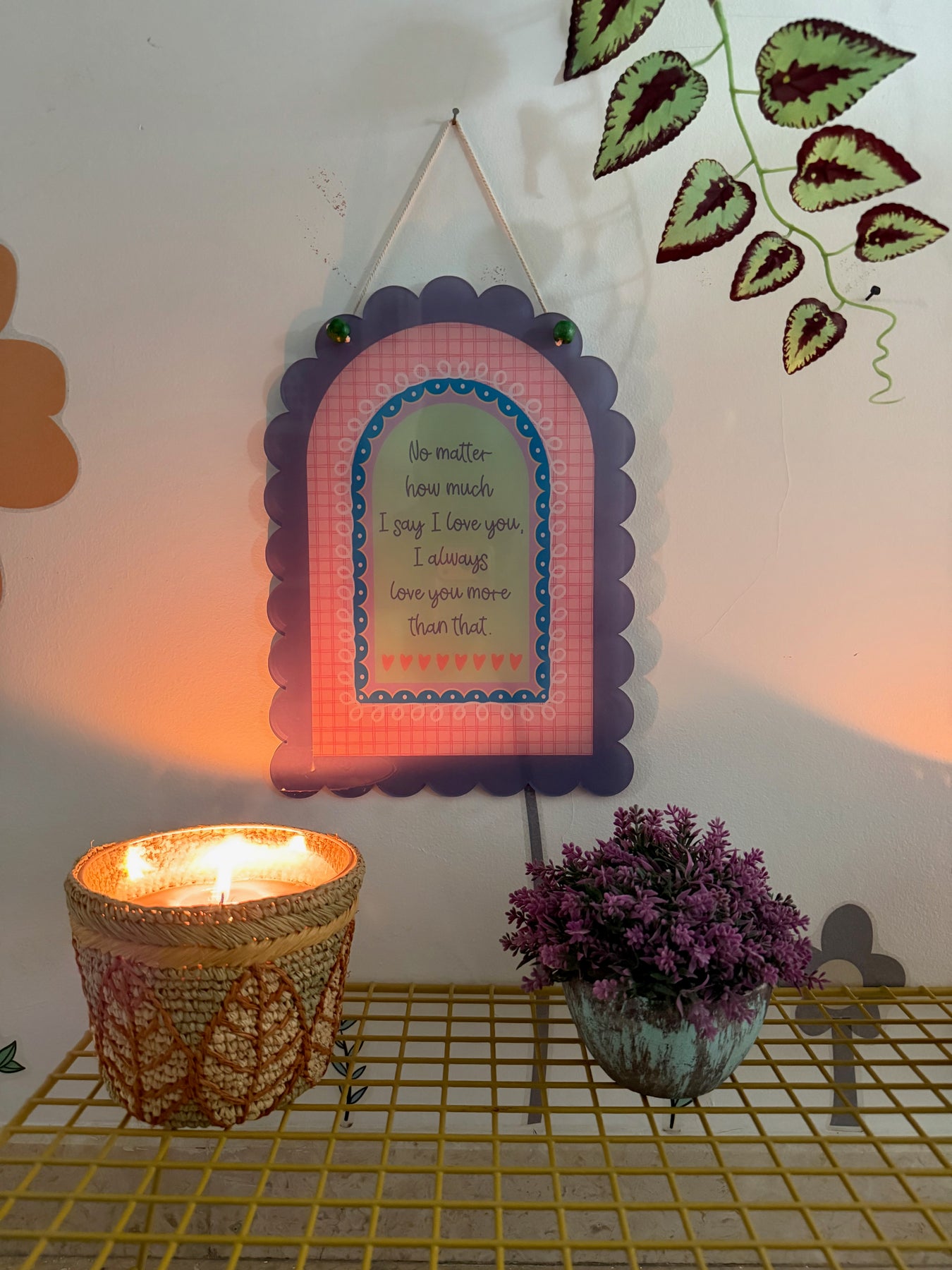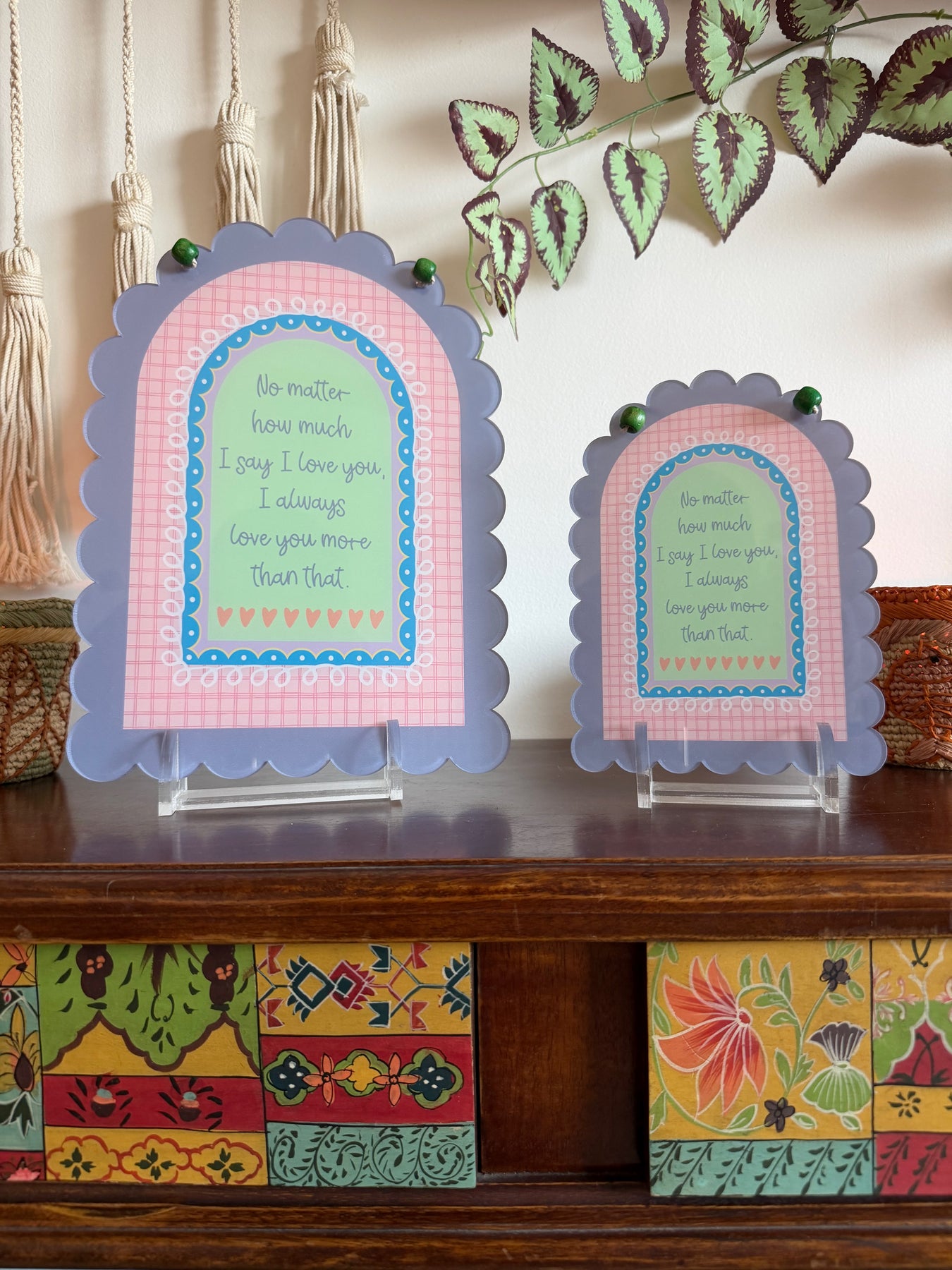 This design features an arch with purple scalloped borders and soft pink checks. Inside, a smaller arch with smooth borders is decorated with delicate red hearts, framing the heartfelt quote - “No matter how much I say I love you, I always love you more than that.” A simple and heartfelt way to show deep love.