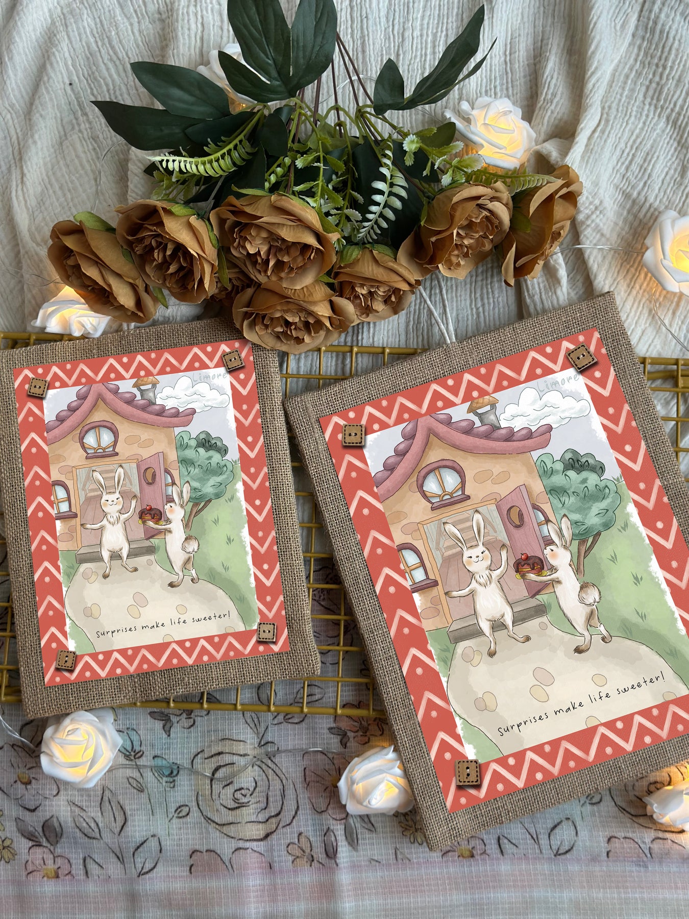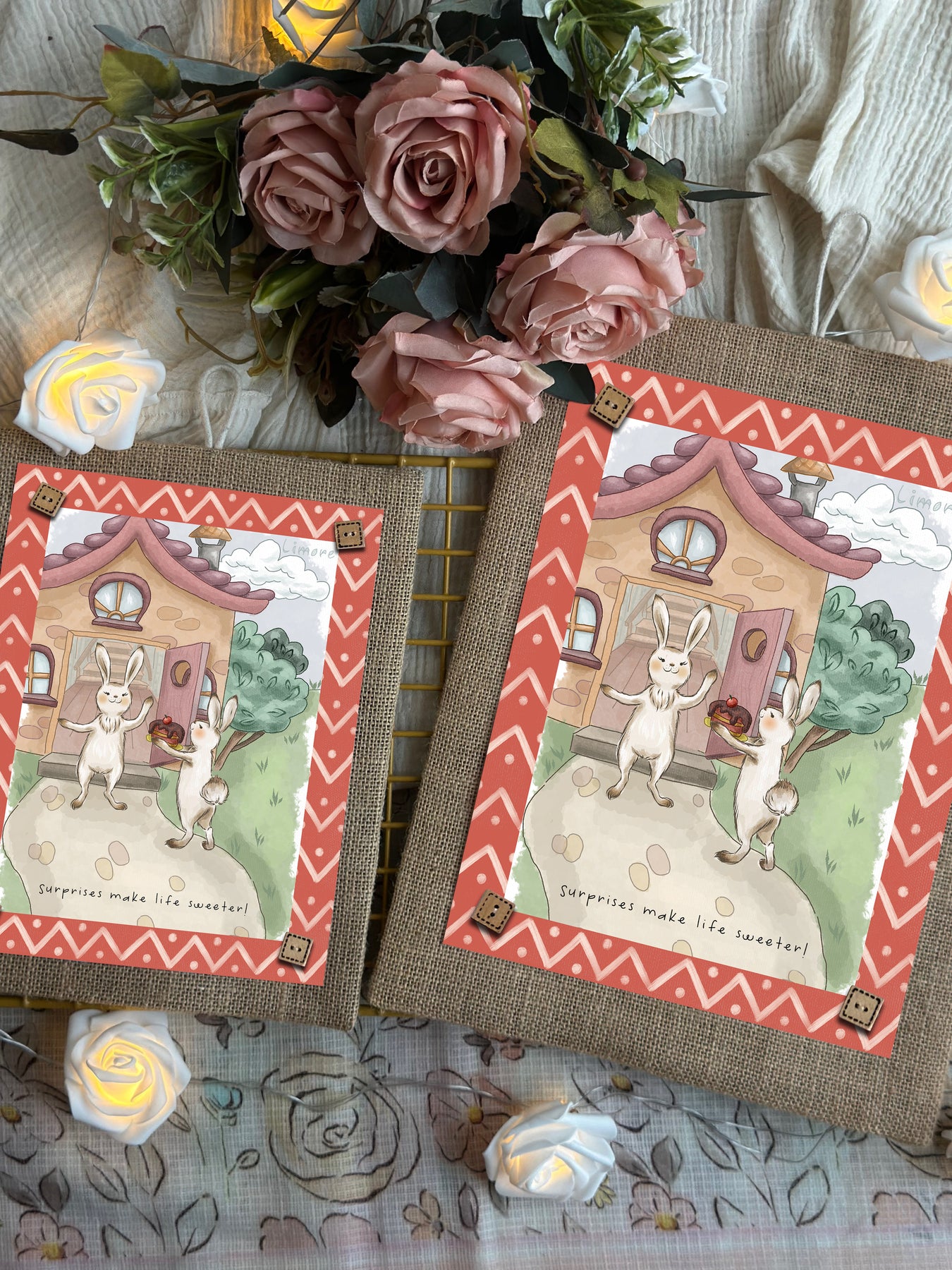 This charming piece from our Bunny Gets Curious collection shows Bunny delighting a friend with a cake. The quote reads: “Surprises make life sweeter.”