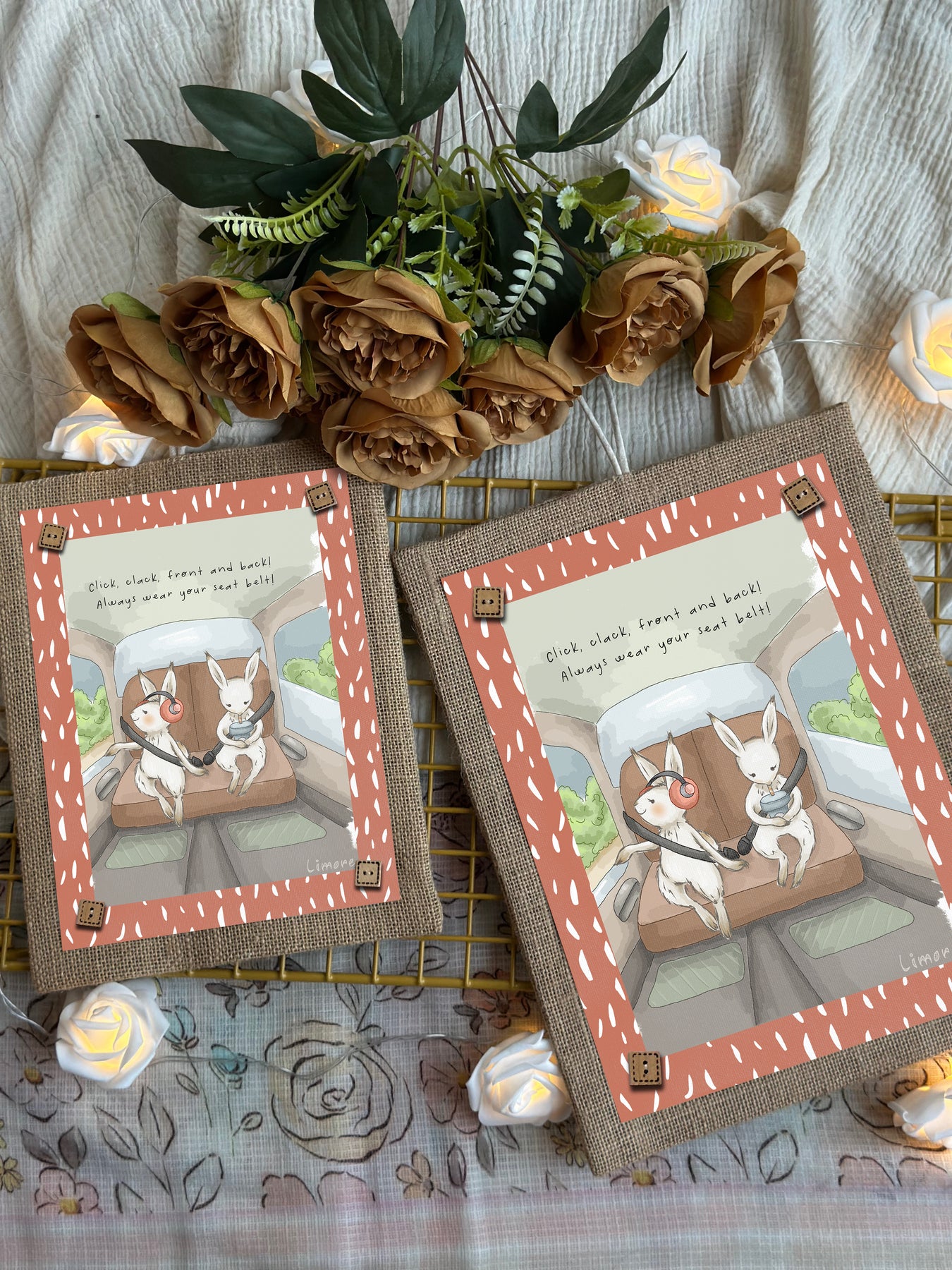 This charming artwork from our Bunny’s Good Habits collection features bunnies as careful little passengers, buckled up for their journey. The quote reads: “Click clack, front and back! Always wear your seat belt.”