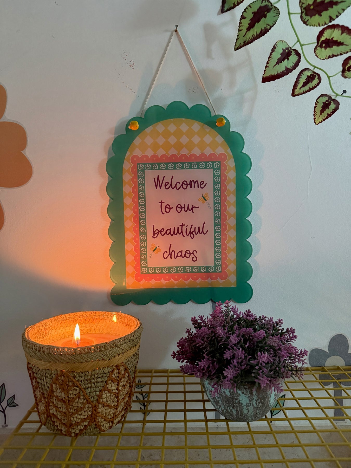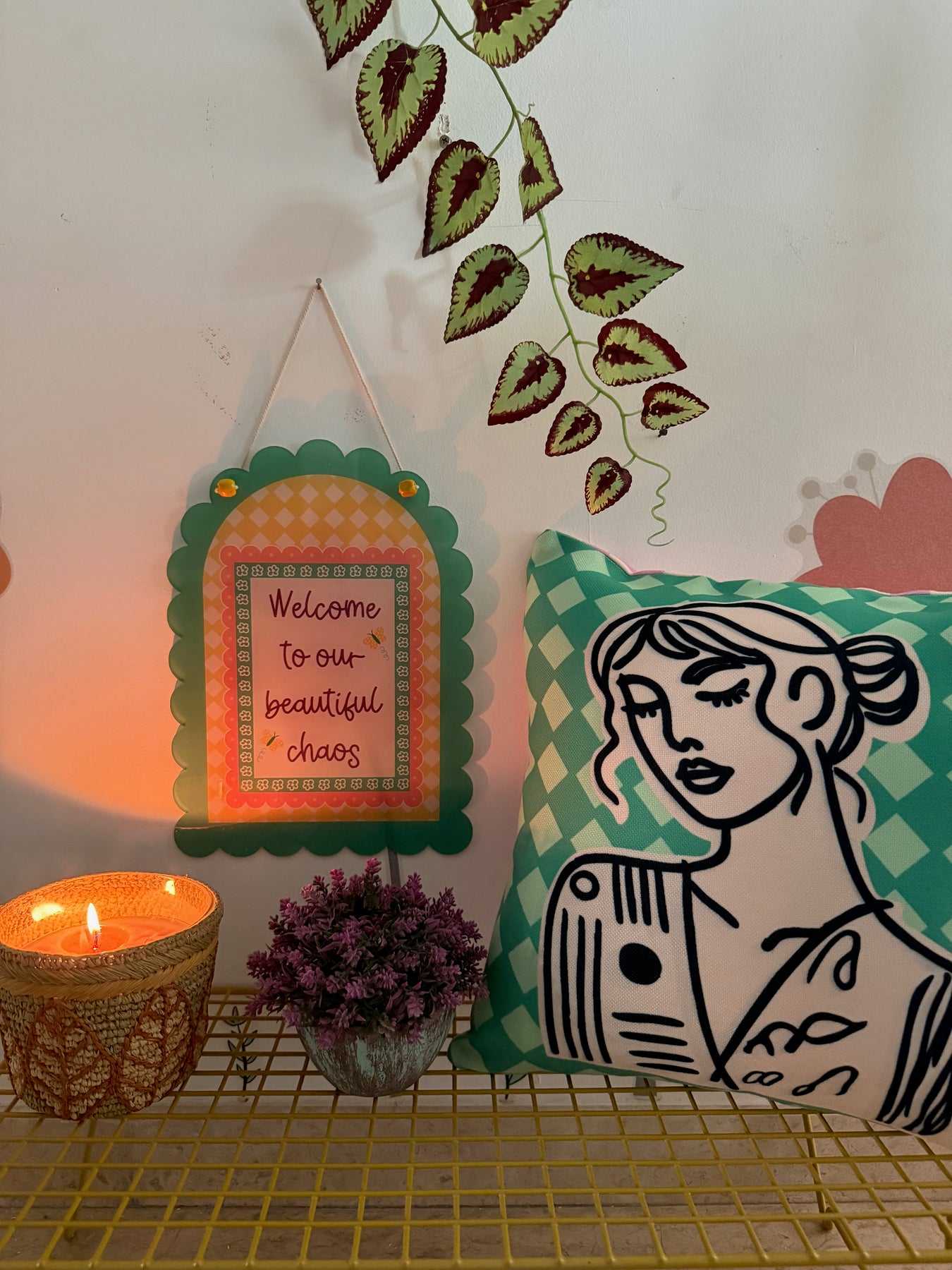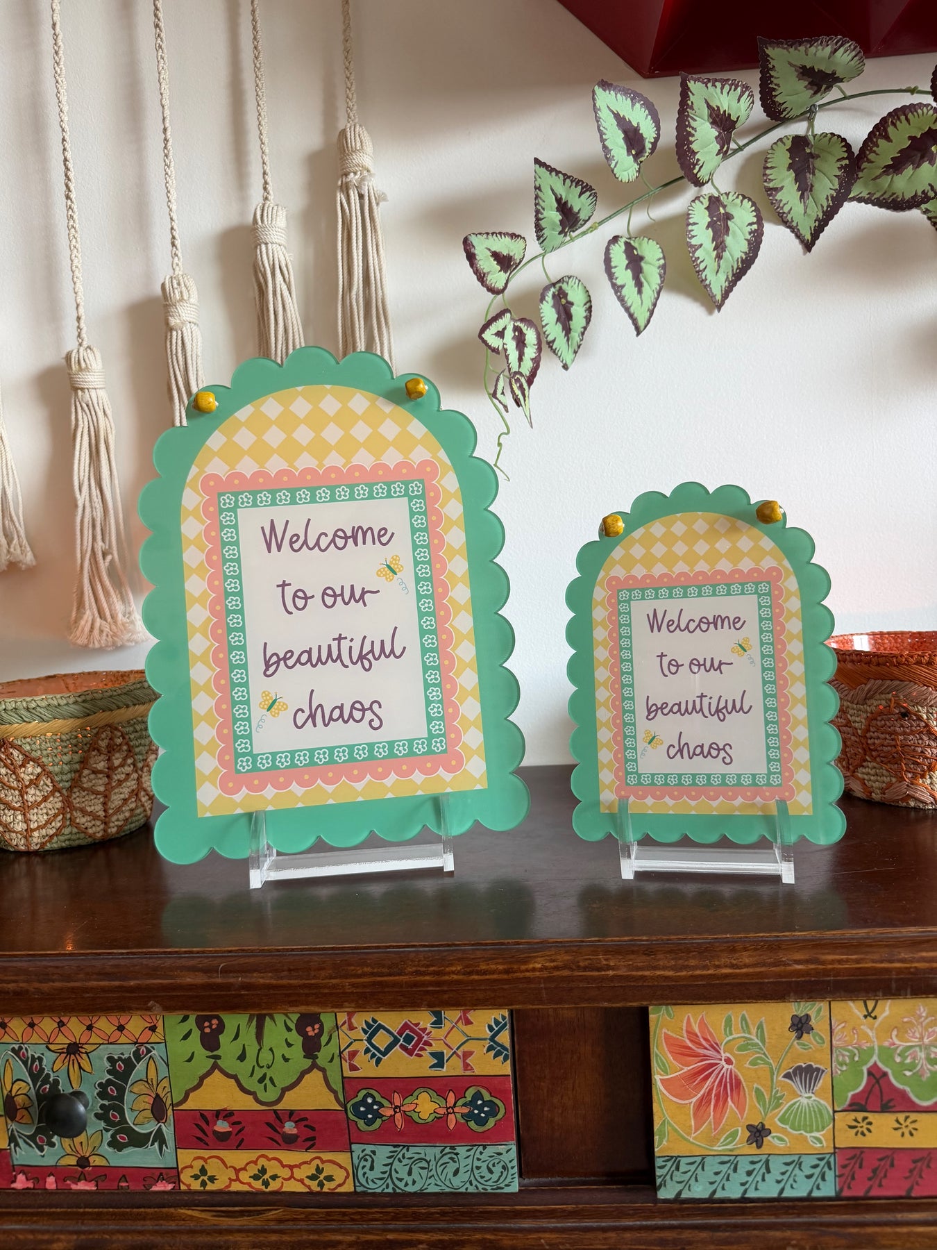 This arch-shaped wall art features green scalloped borders and a lightly tilted checkered design that adds movement and charm. The central rectangle, bordered with delicate designs and butterflies, carries the quote “Welcome to our beautiful chaos” — a lighthearted reminder that love thrives even in the most imperfect moments.