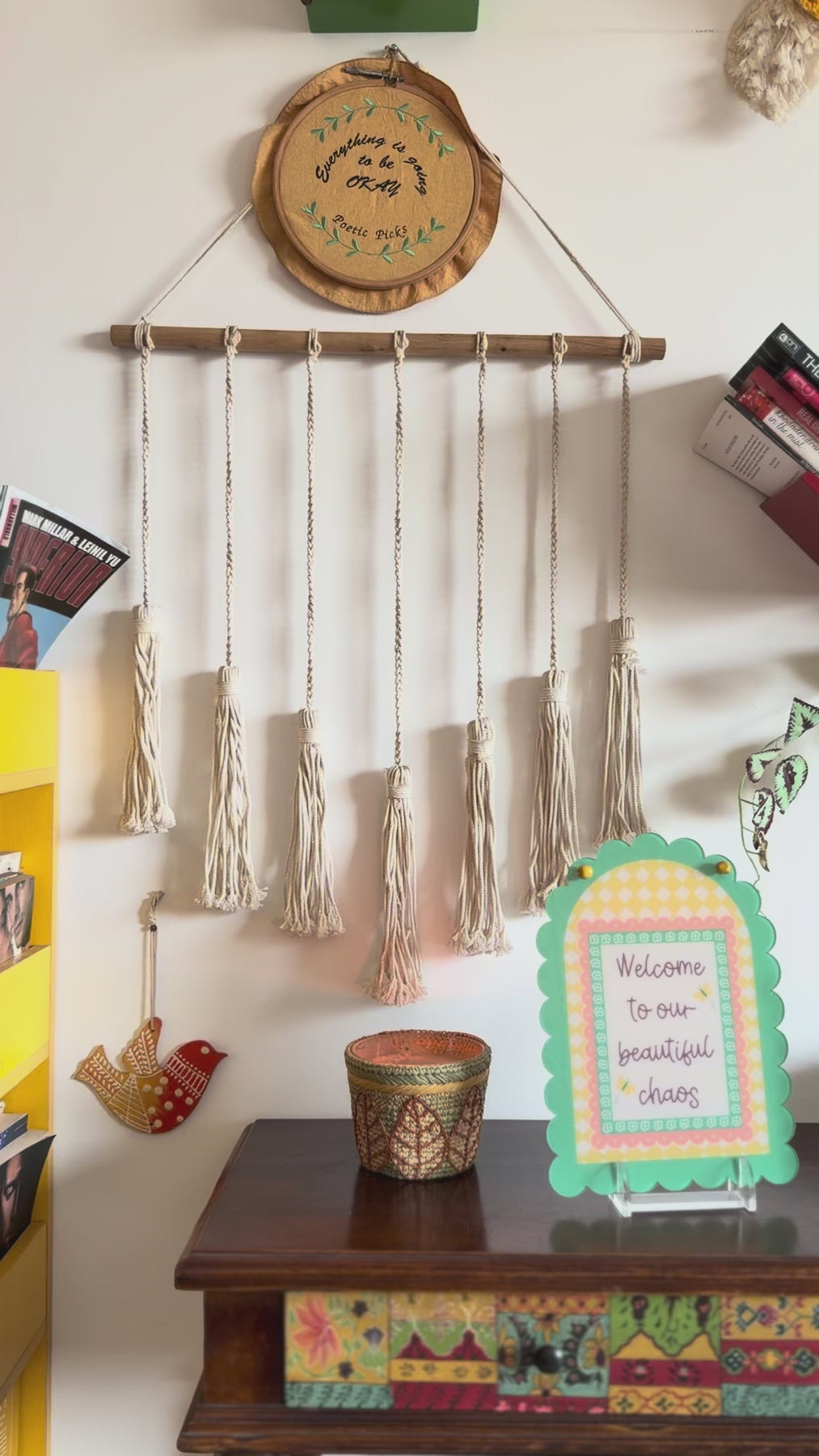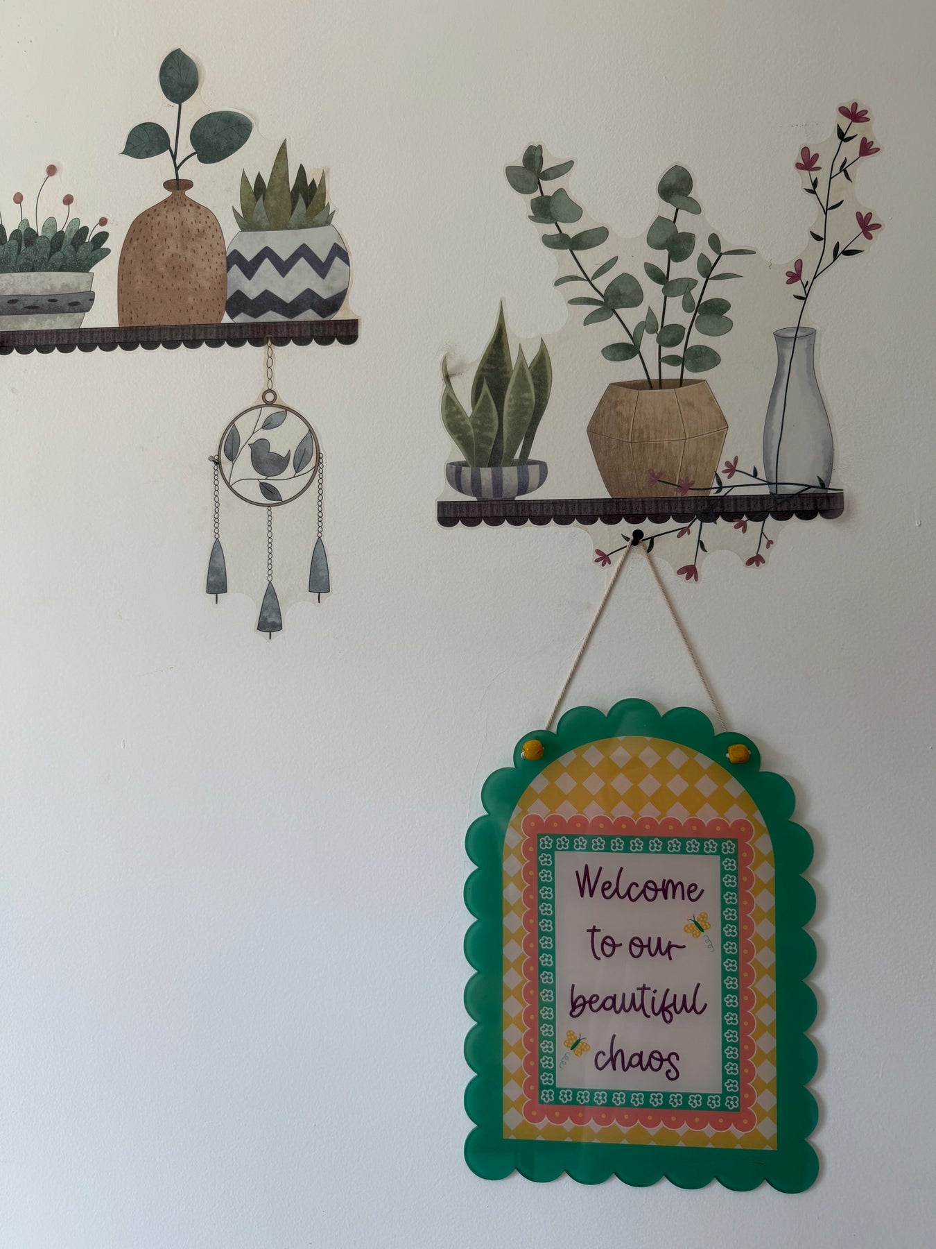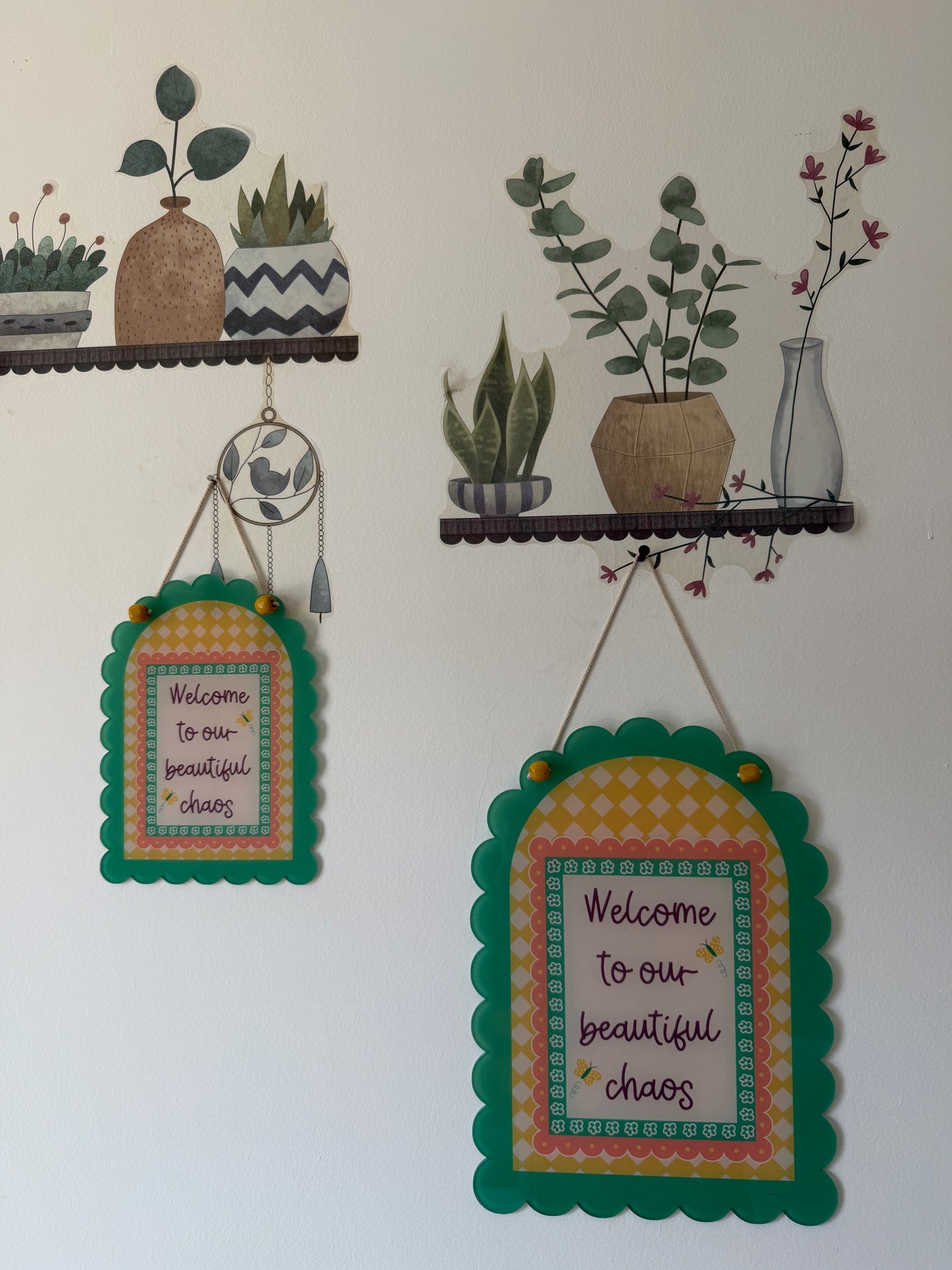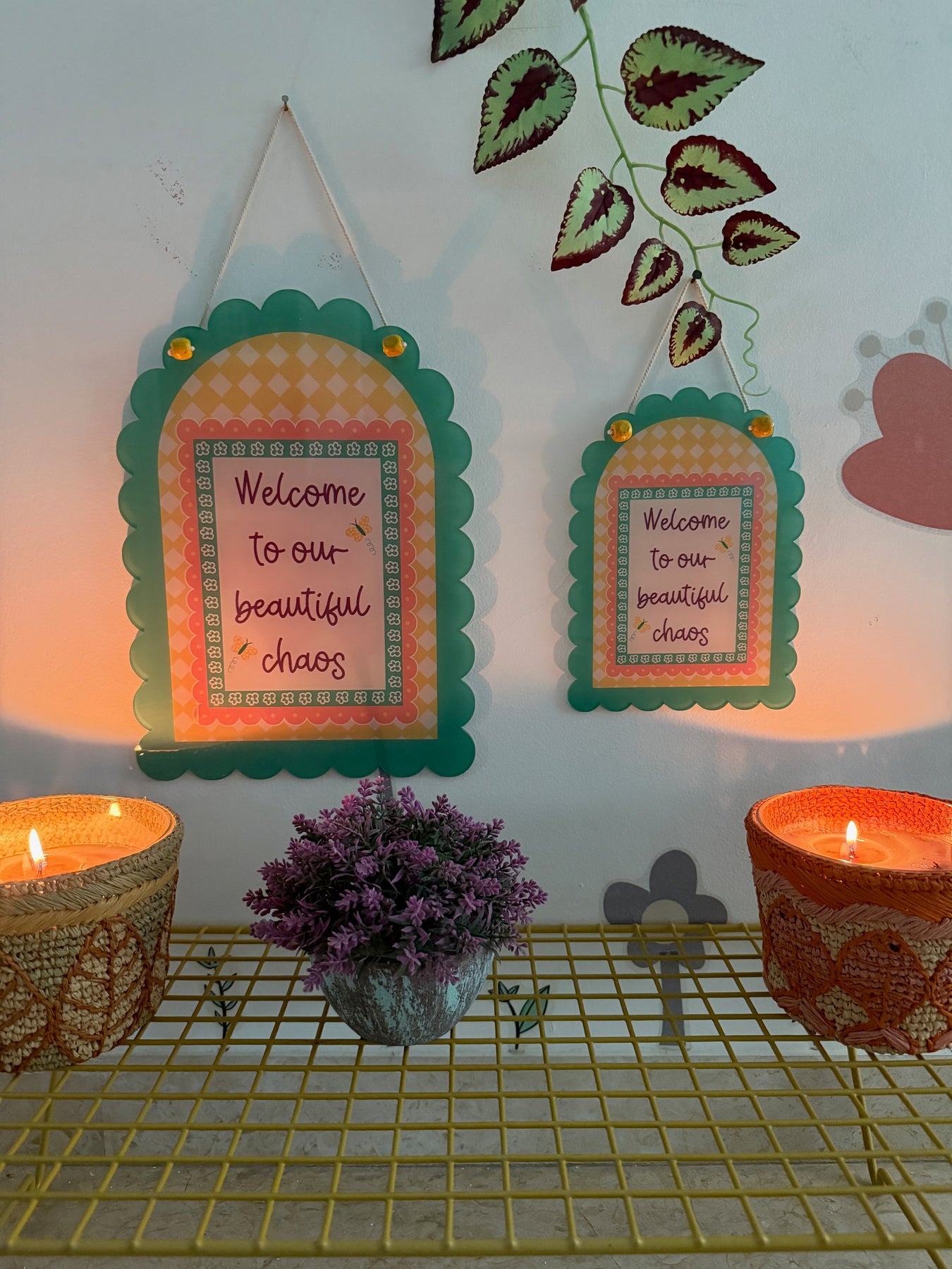 This arch-shaped wall art features green scalloped borders and a lightly tilted checkered design that adds movement and charm. The central rectangle, bordered with delicate designs and butterflies, carries the quote “Welcome to our beautiful chaos” — a lighthearted reminder that love thrives even in the most imperfect moments.