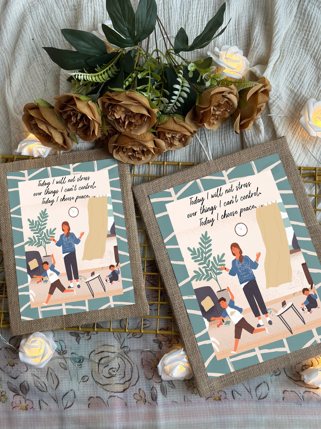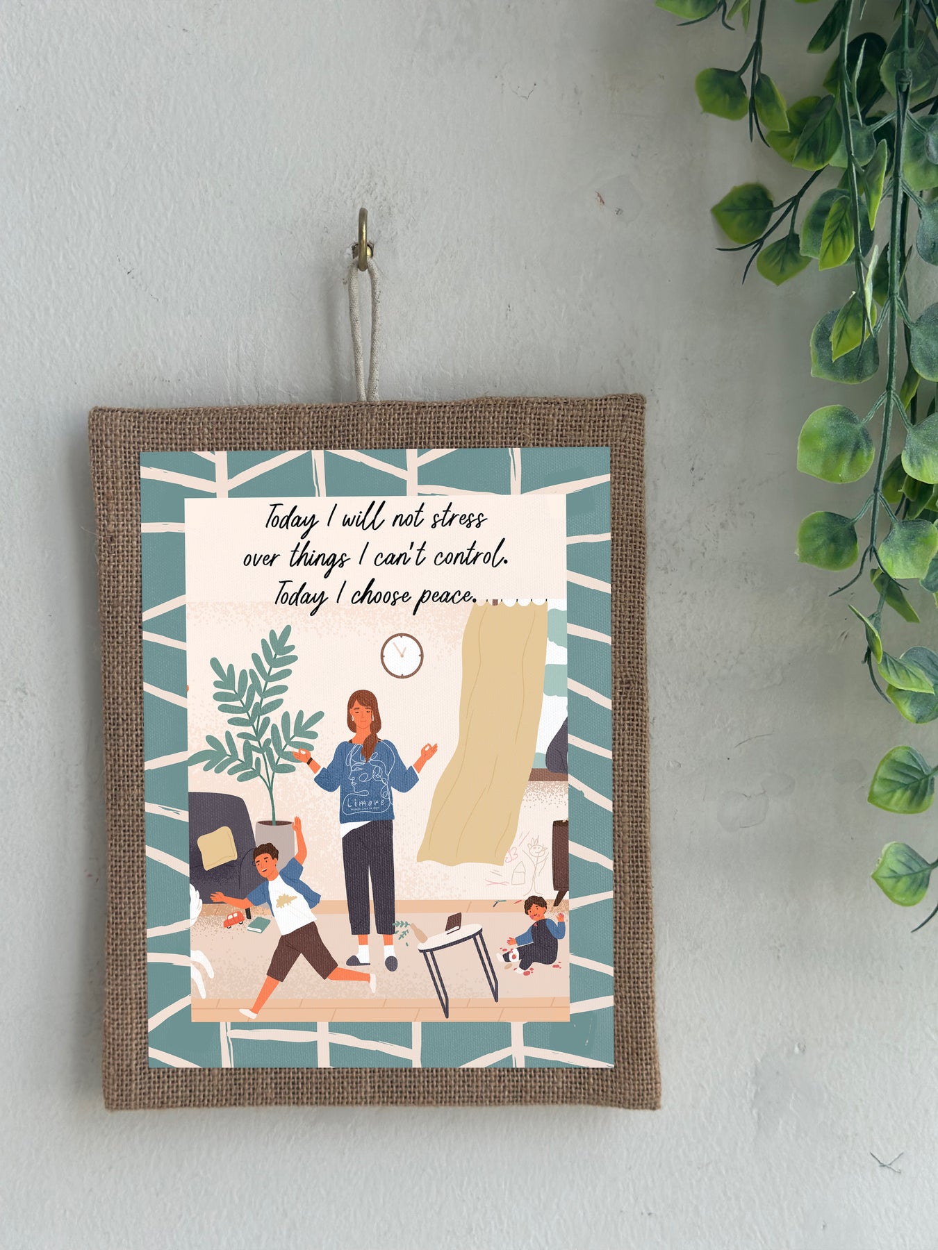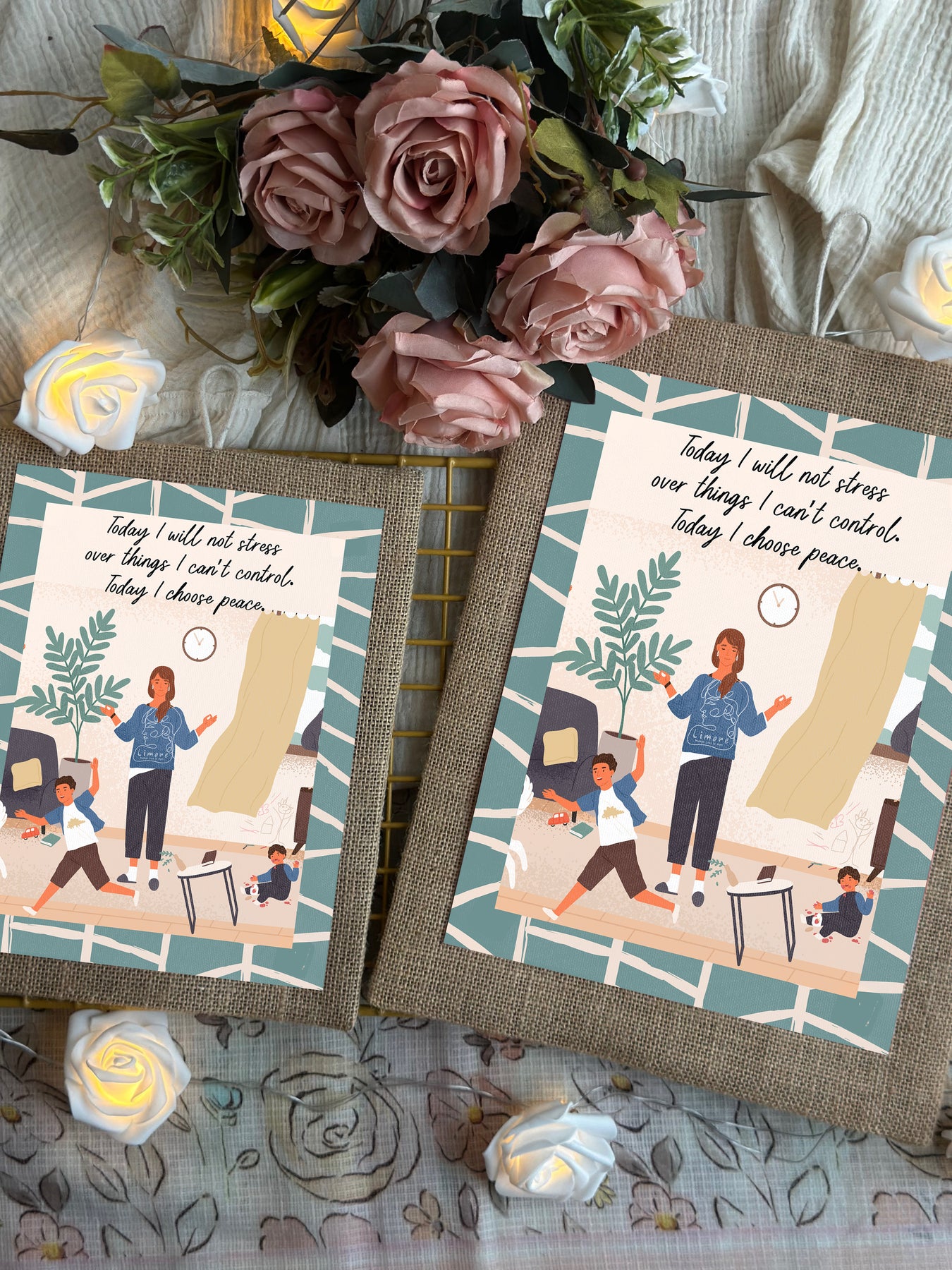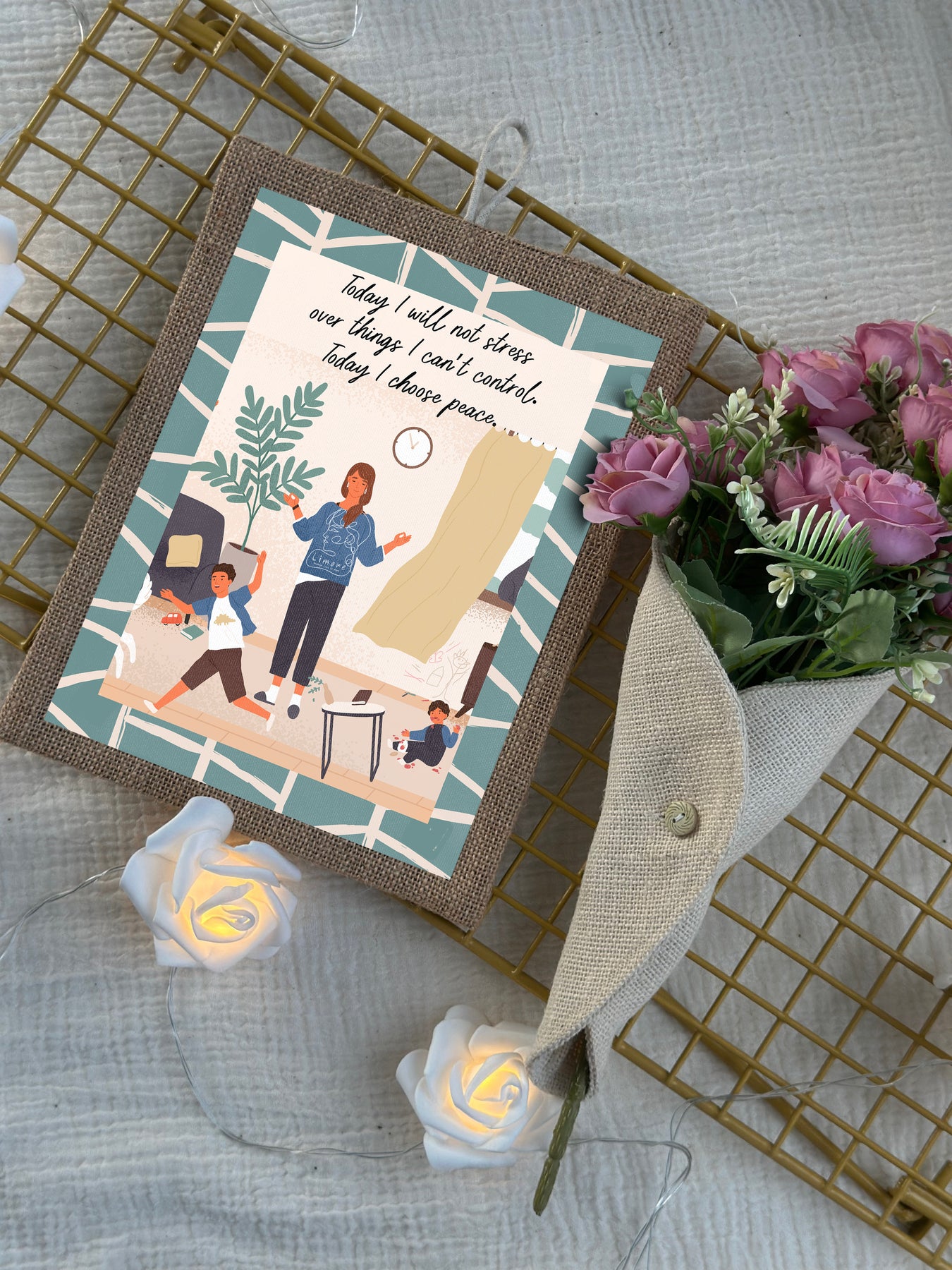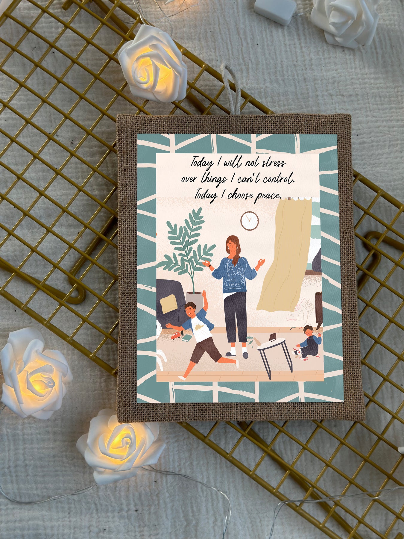 This artwork captures a playful family moment — two children creating a joyful mess in the room while their mother stands calmly, embracing the moment. The quote, “Today I will not stress over things I can’t control. Today I choose peace,” celebrates mindfulness, letting go, and finding calm amidst the joyful chaos of family life.