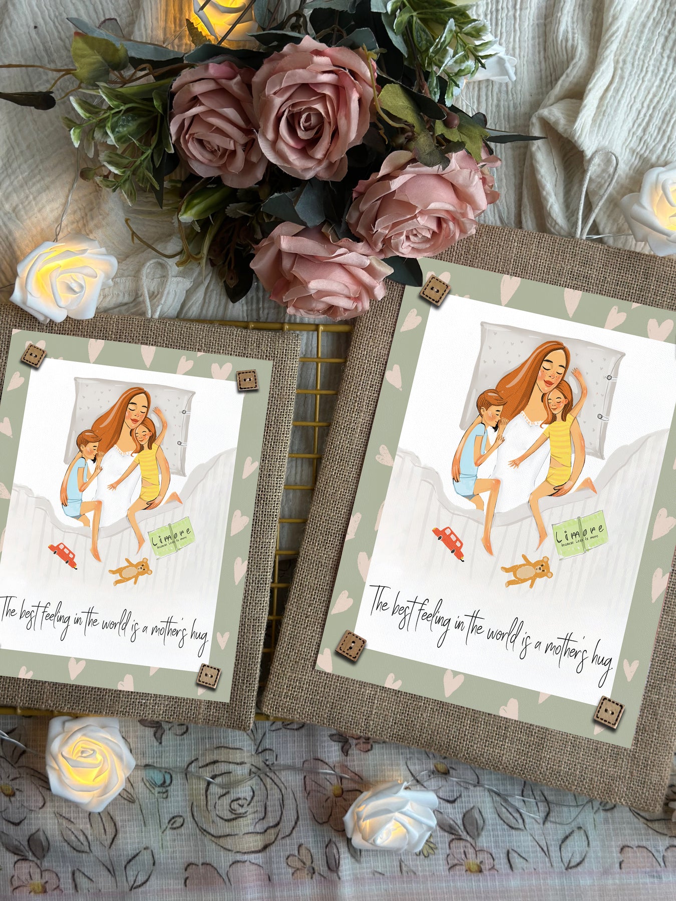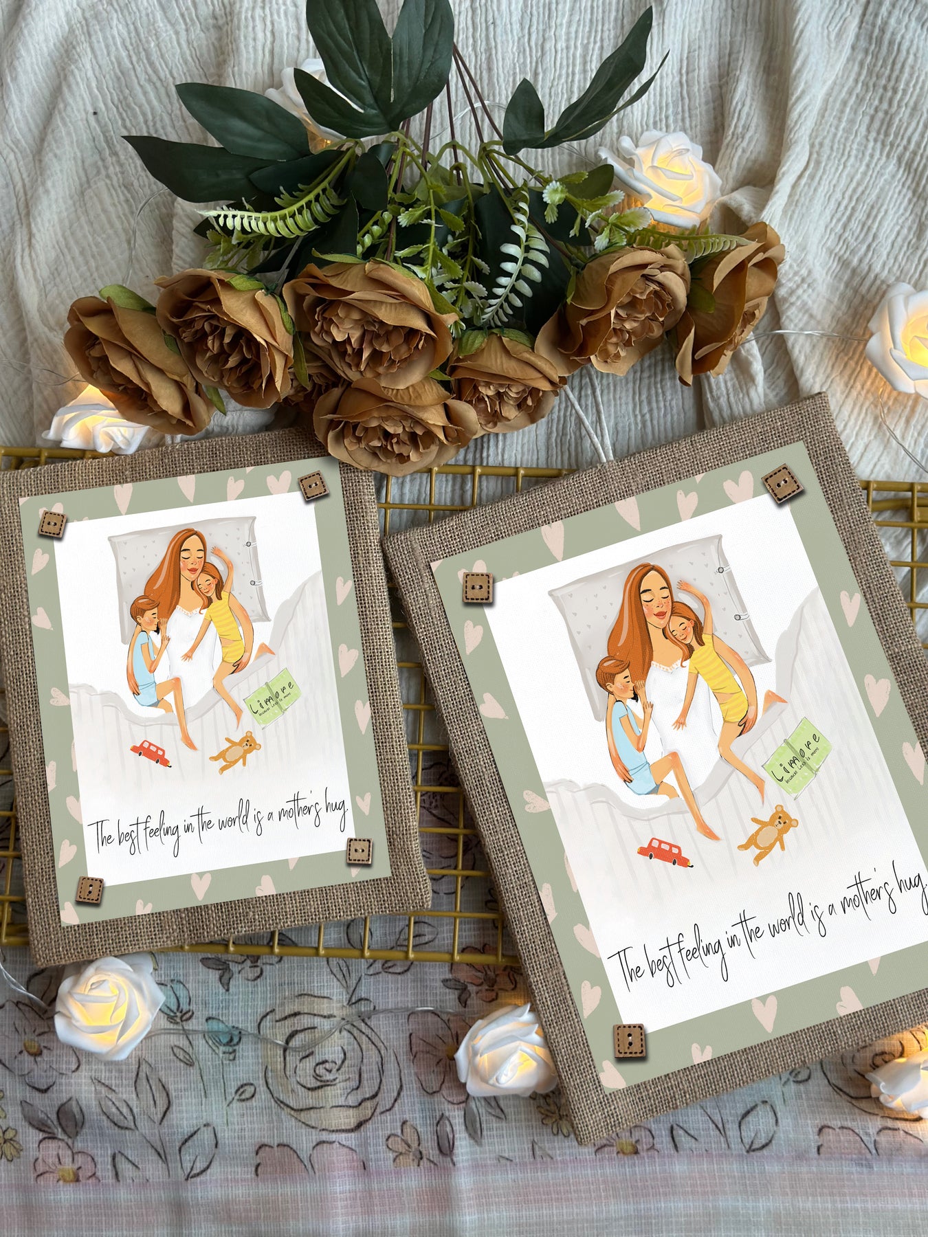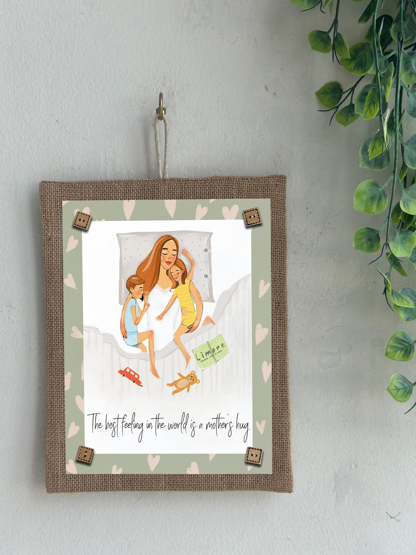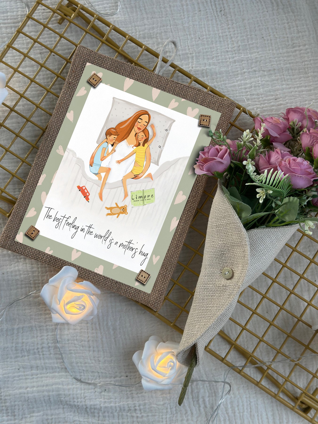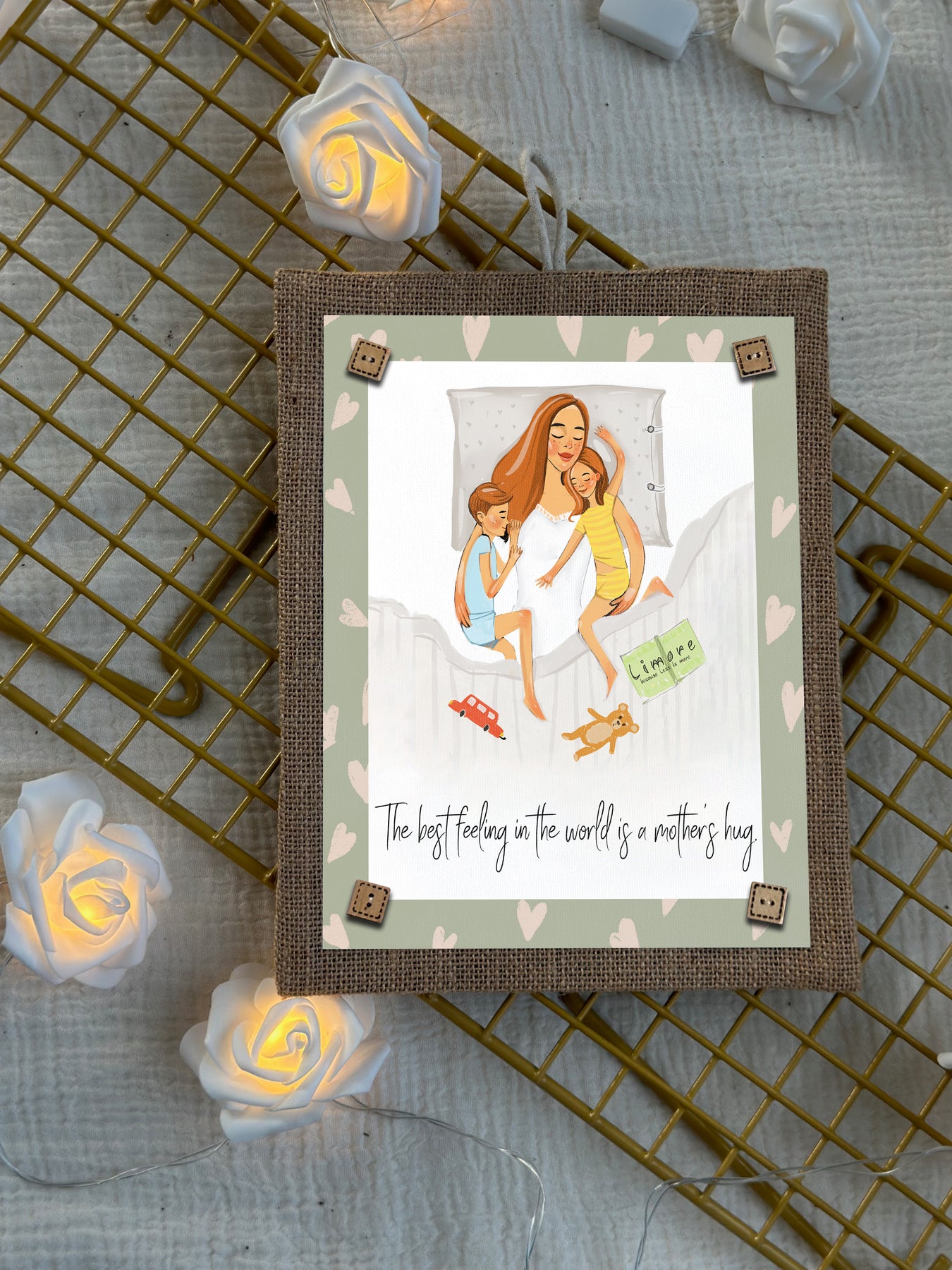 This artwork captures a tender moment between a mother and her children, the mother at the center hugging her little ones as they sleep peacefully. The quote, “The best feeling in the world is a mother’s hug" beautifully celebrates the warmth, love, and comfort that only a mother’s embrace can bring.