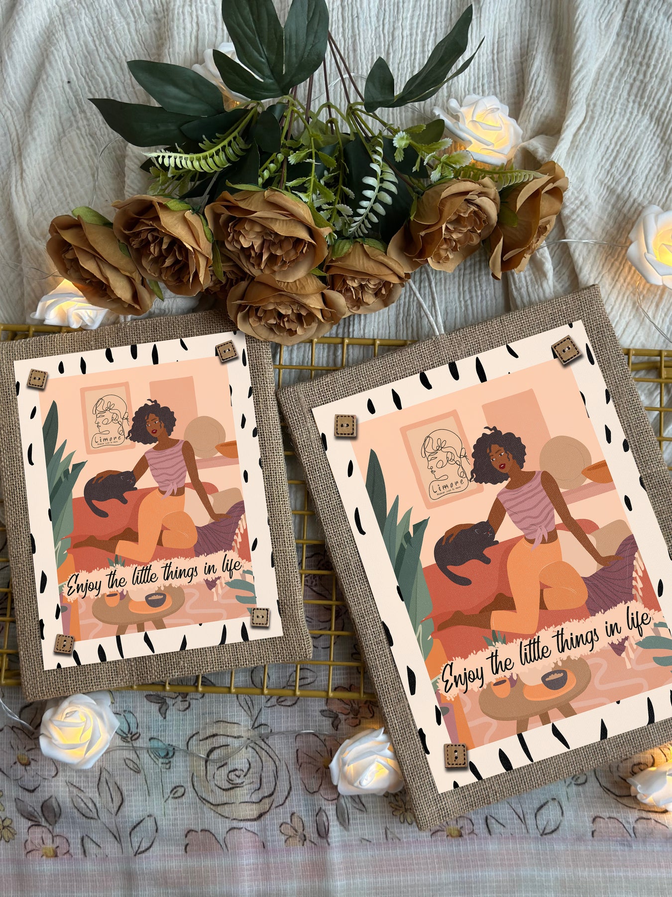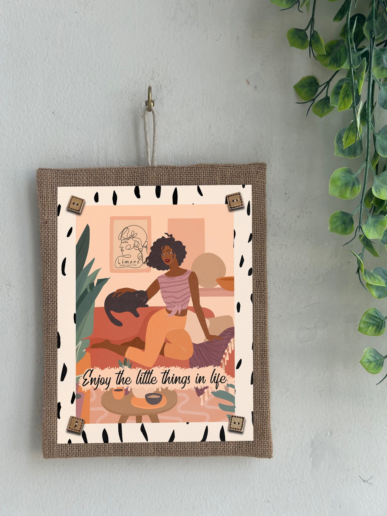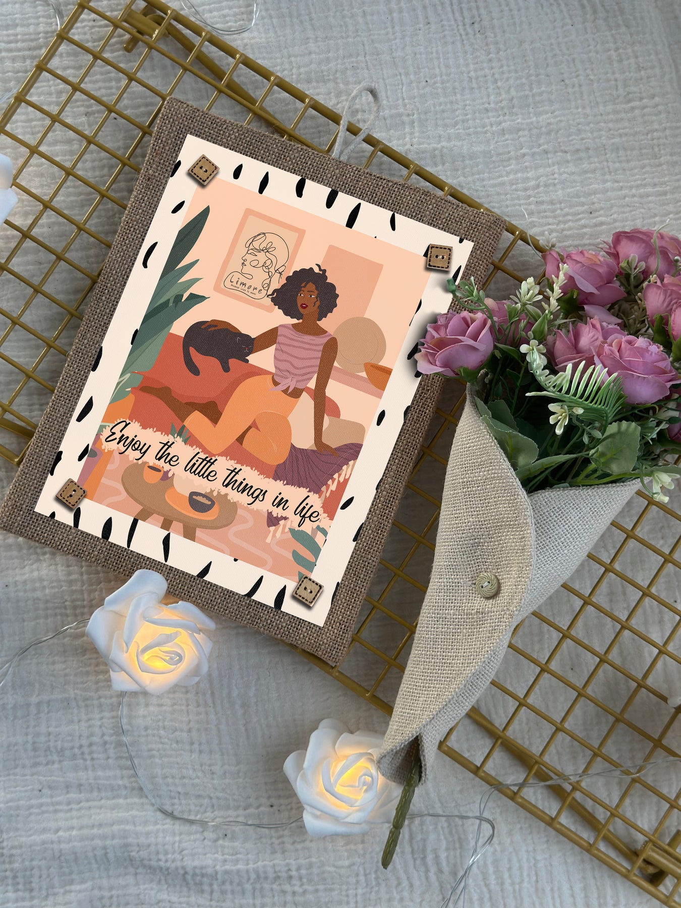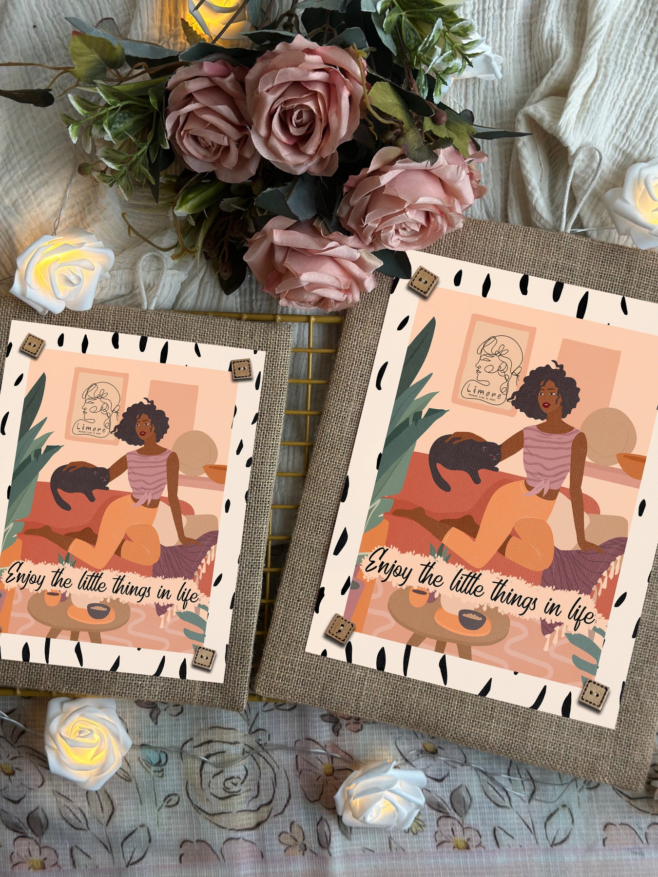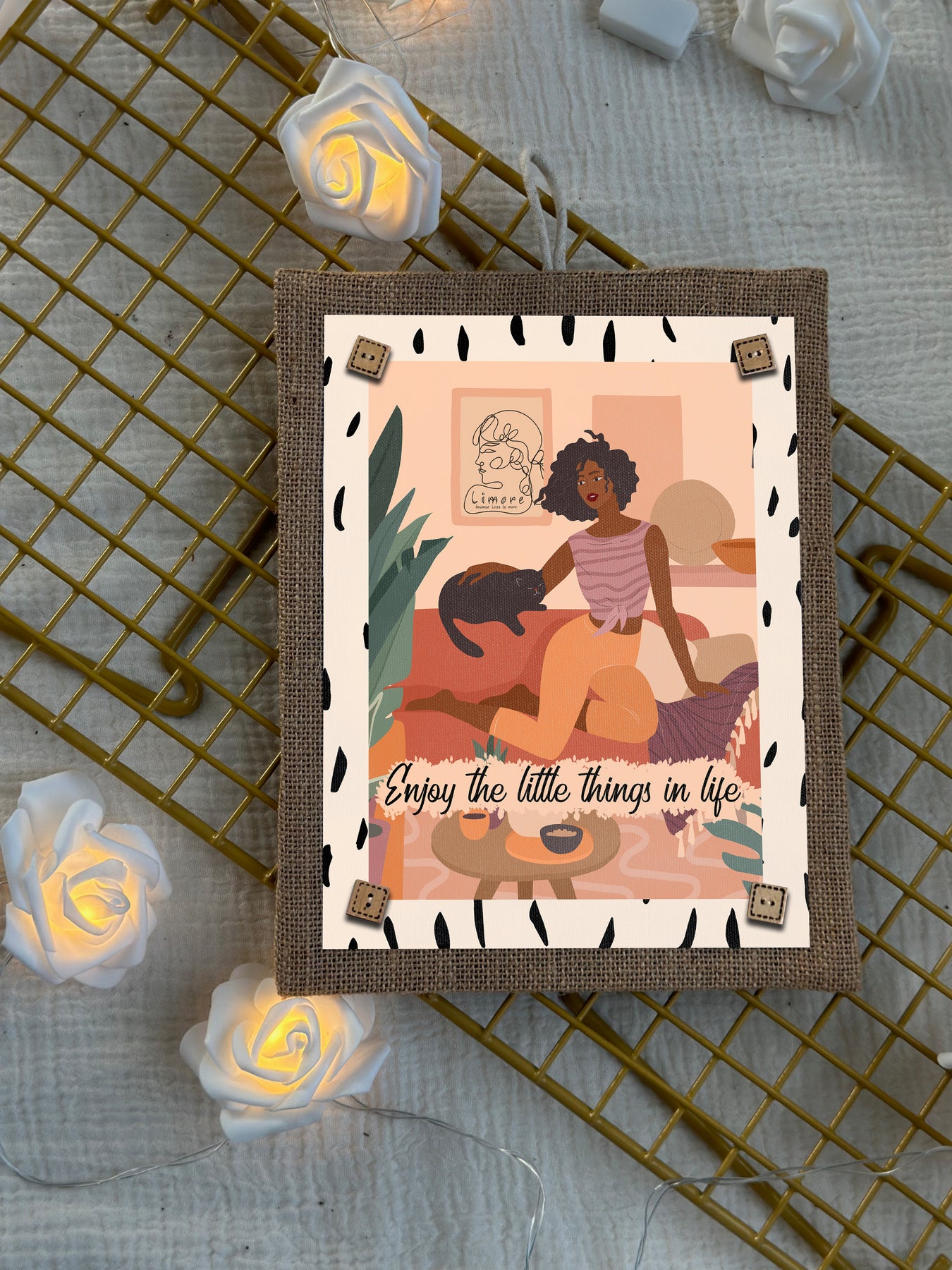 This artwork captures a moment of simple, mindful joy — a woman patting her black cat, fully present in a small yet meaningful gesture. The quote, “Enjoy the little things in life,” gently encourages us to pause, notice, and find happiness in everyday moments.