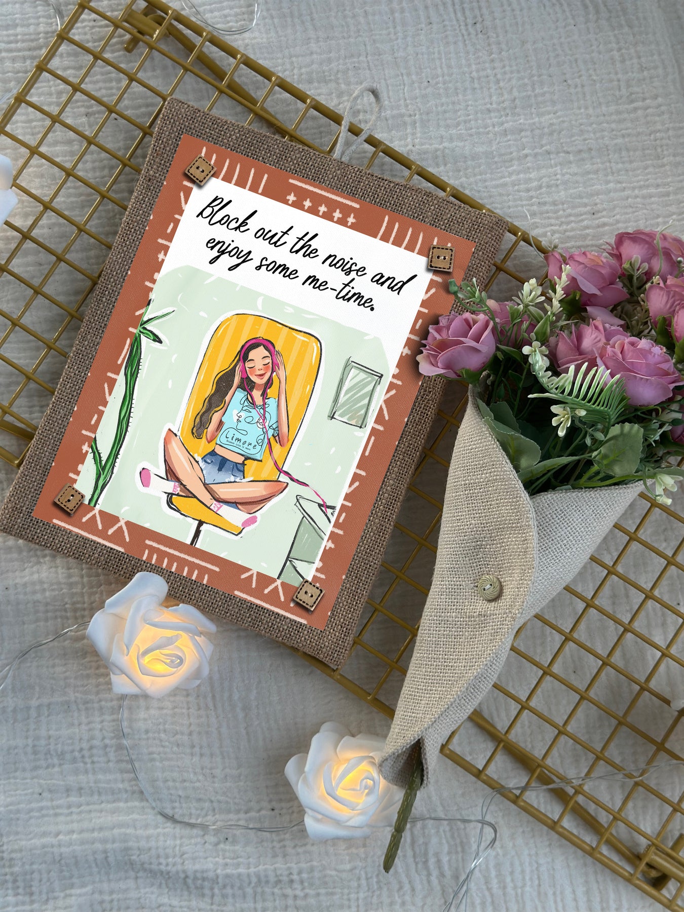 This piece celebrates the beauty of quiet moments. The illustration shows a woman with her headphones on, immersed in music and gentle thought. The message reads, "Block out the noise and enjoy some me-time."