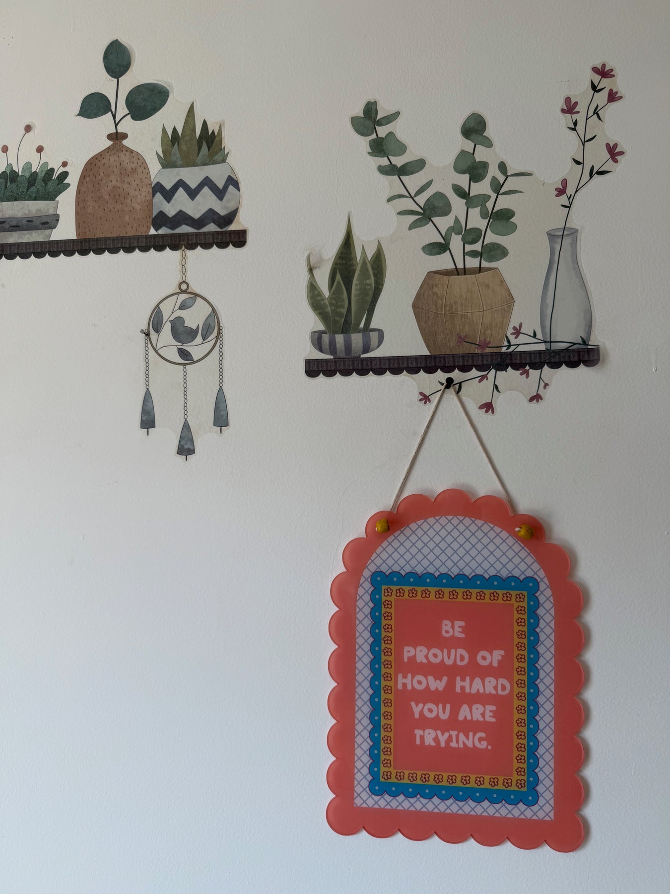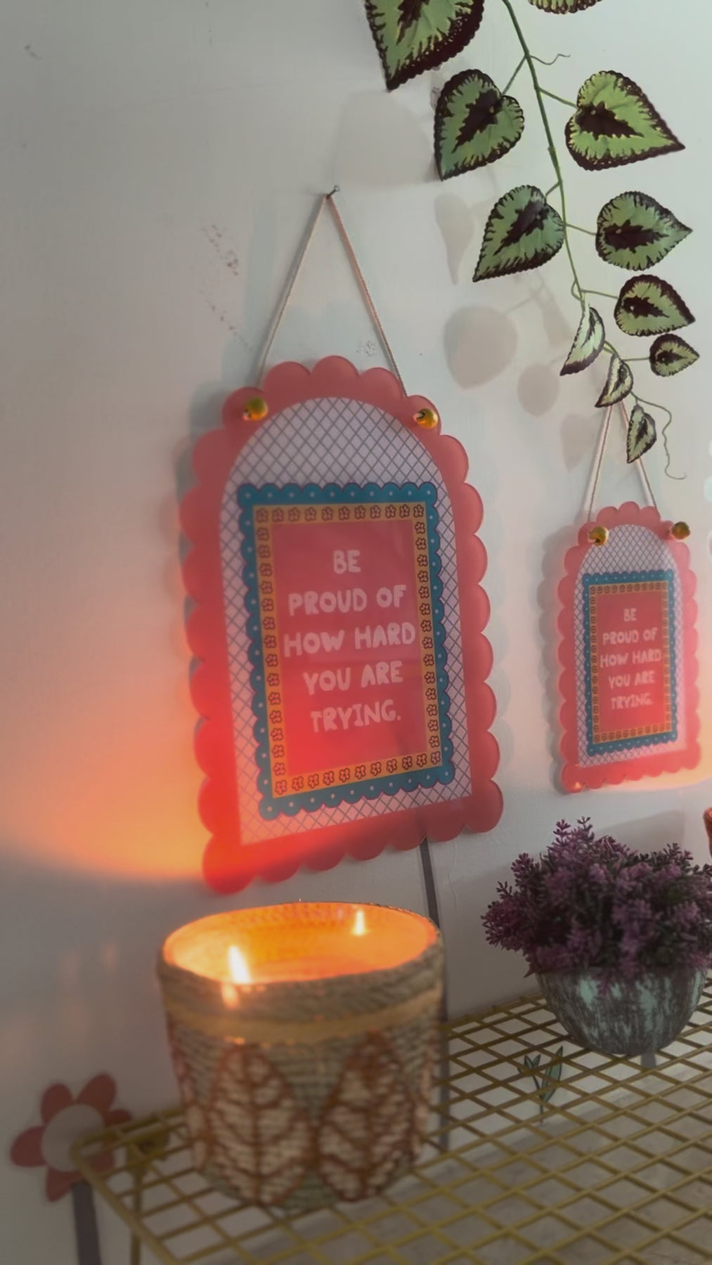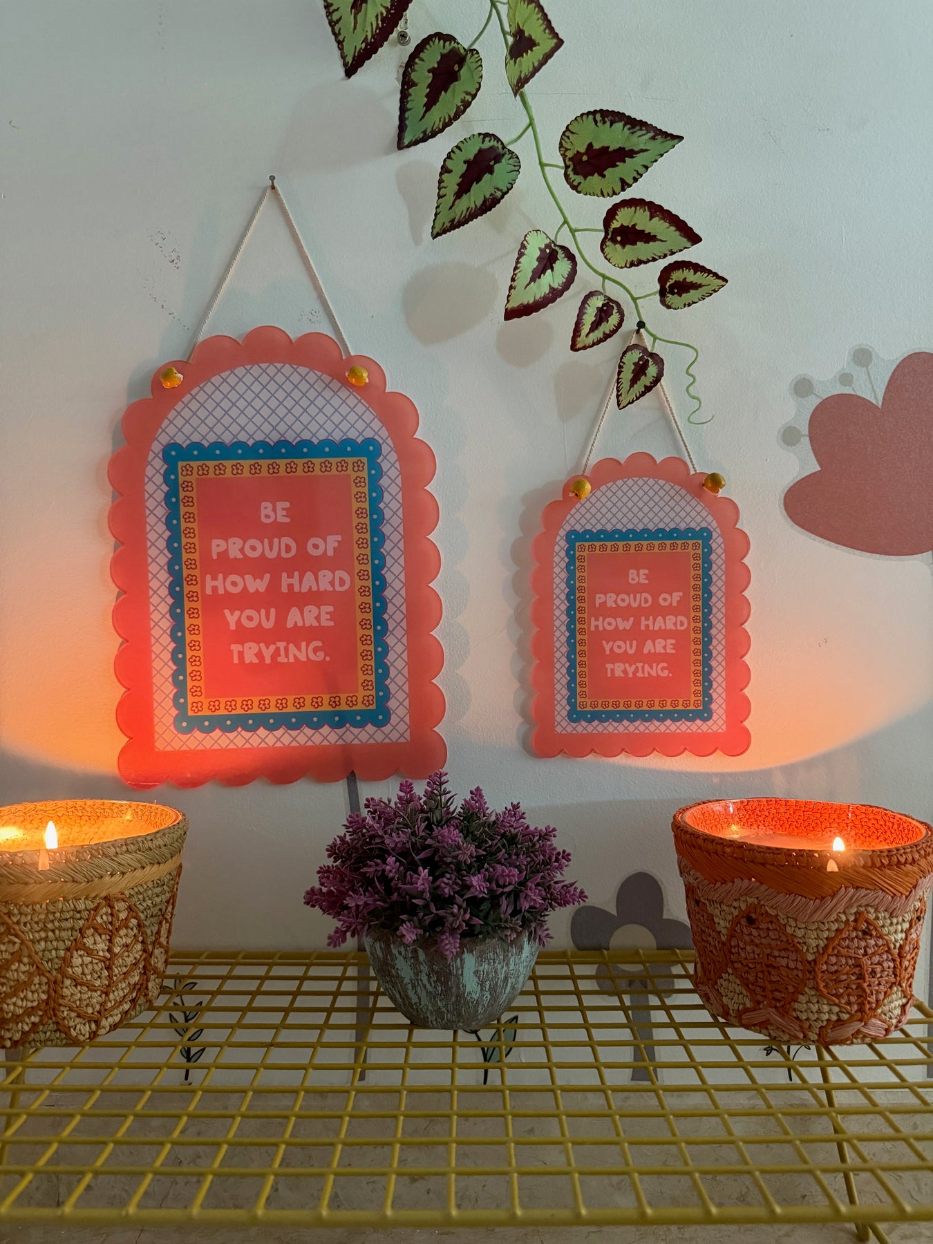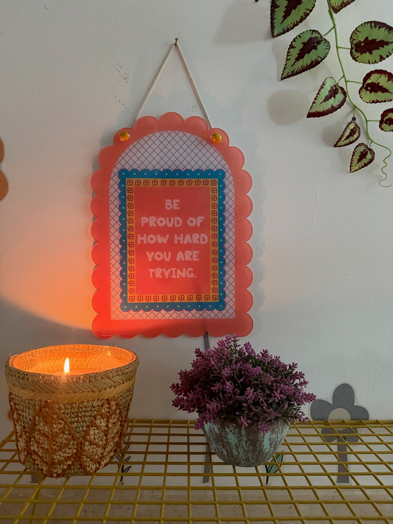 This design features an arch shape with coral scalloped borders and a soft white checkered background. At the center sits a rectangle with blue and yellow borders, carrying the heartfelt message “Be proud of how hard you are trying.” A simple and comforting reminder that effort itself is something to celebrate.
