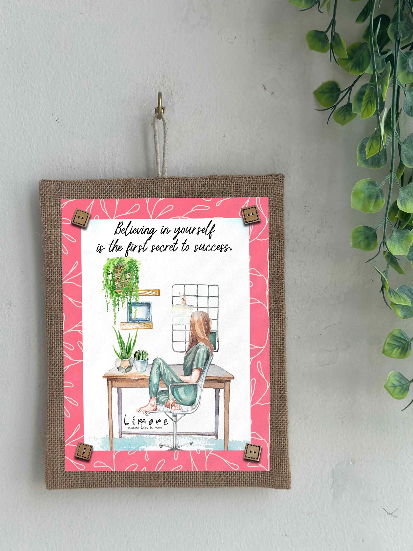 It’s a gentle reminder that confidence starts within — before the plans, before the goals, before everything else. The warm tones, textured burlap base, and hand-drawn style bring a sense of calm encouragement to any space, making it perfect for work nooks, reading corners, or cozy studios.