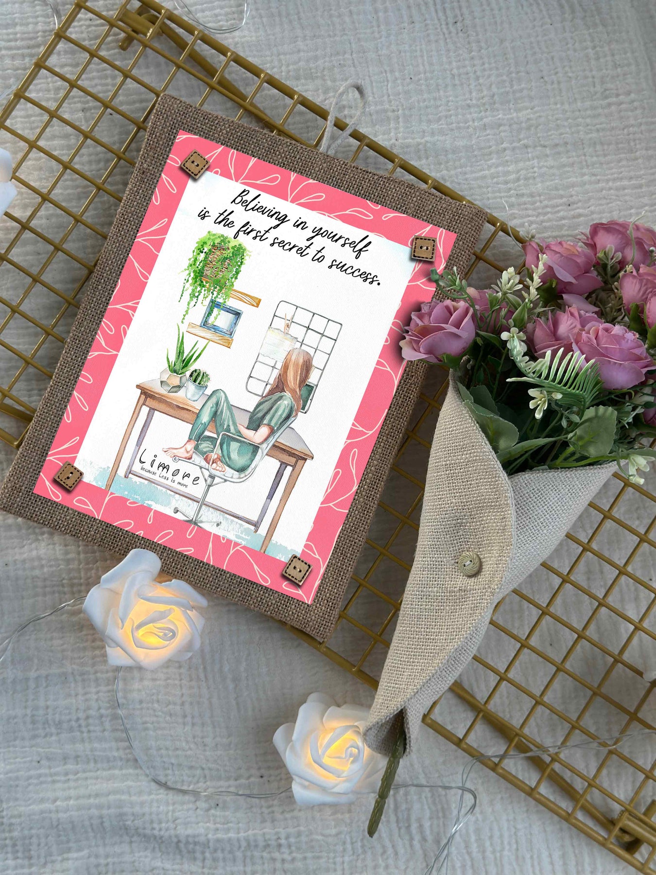This piece captures a quiet yet powerful moment — a woman pausing by her desk, reading a simple note that holds a big truth. The message reads, "Believing in yourself is the first secret of success."
