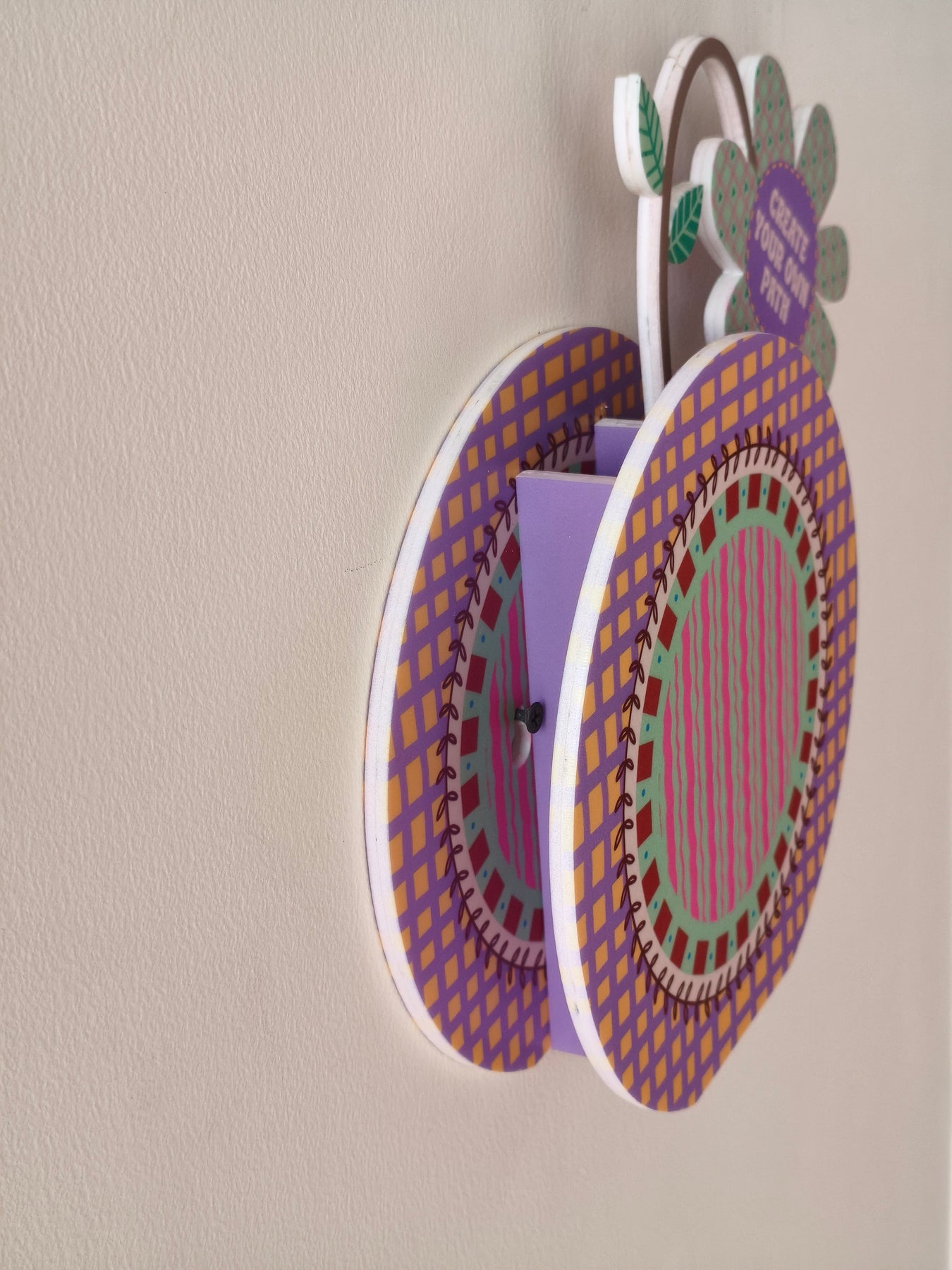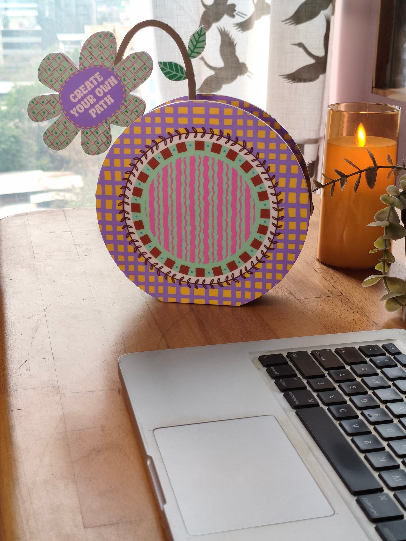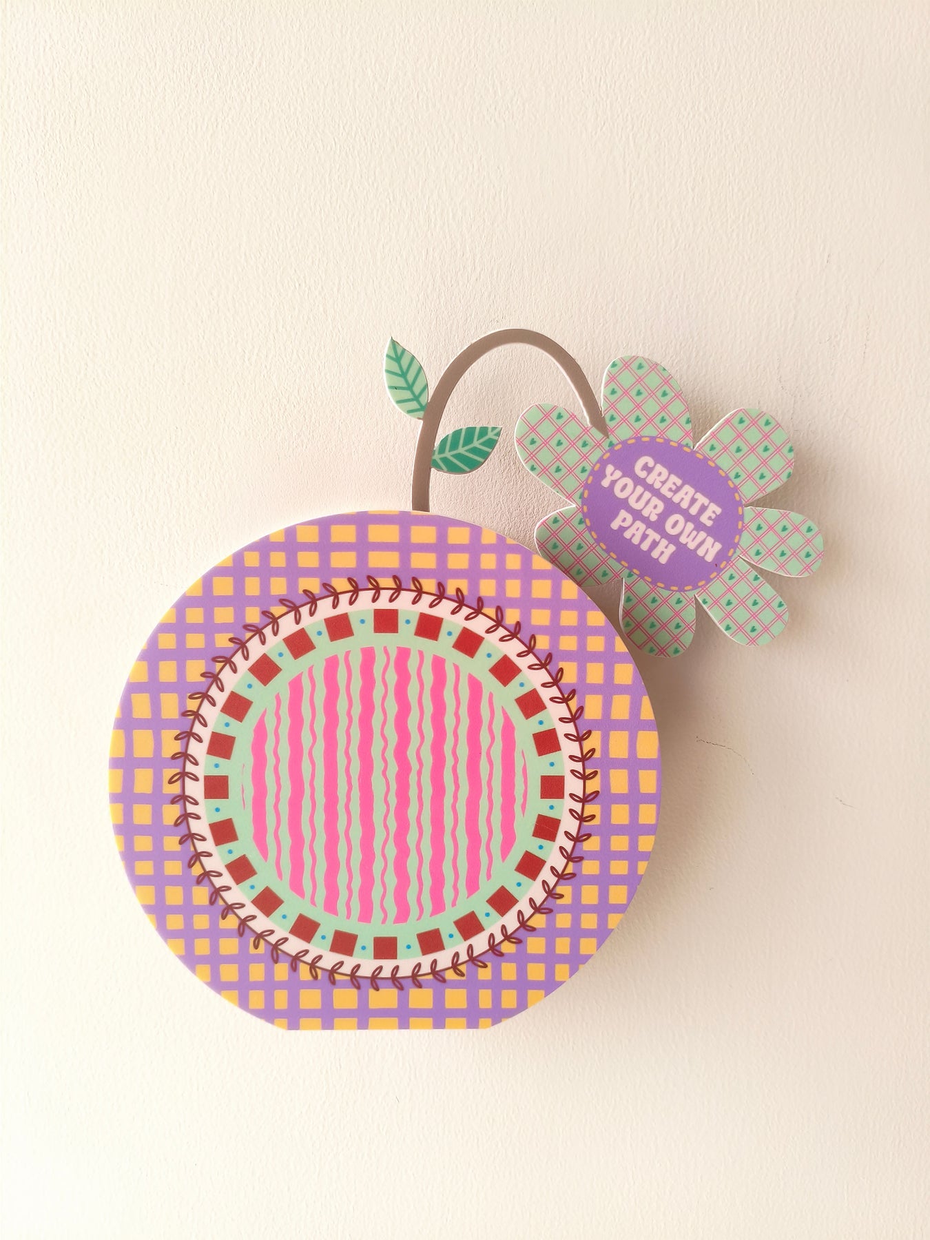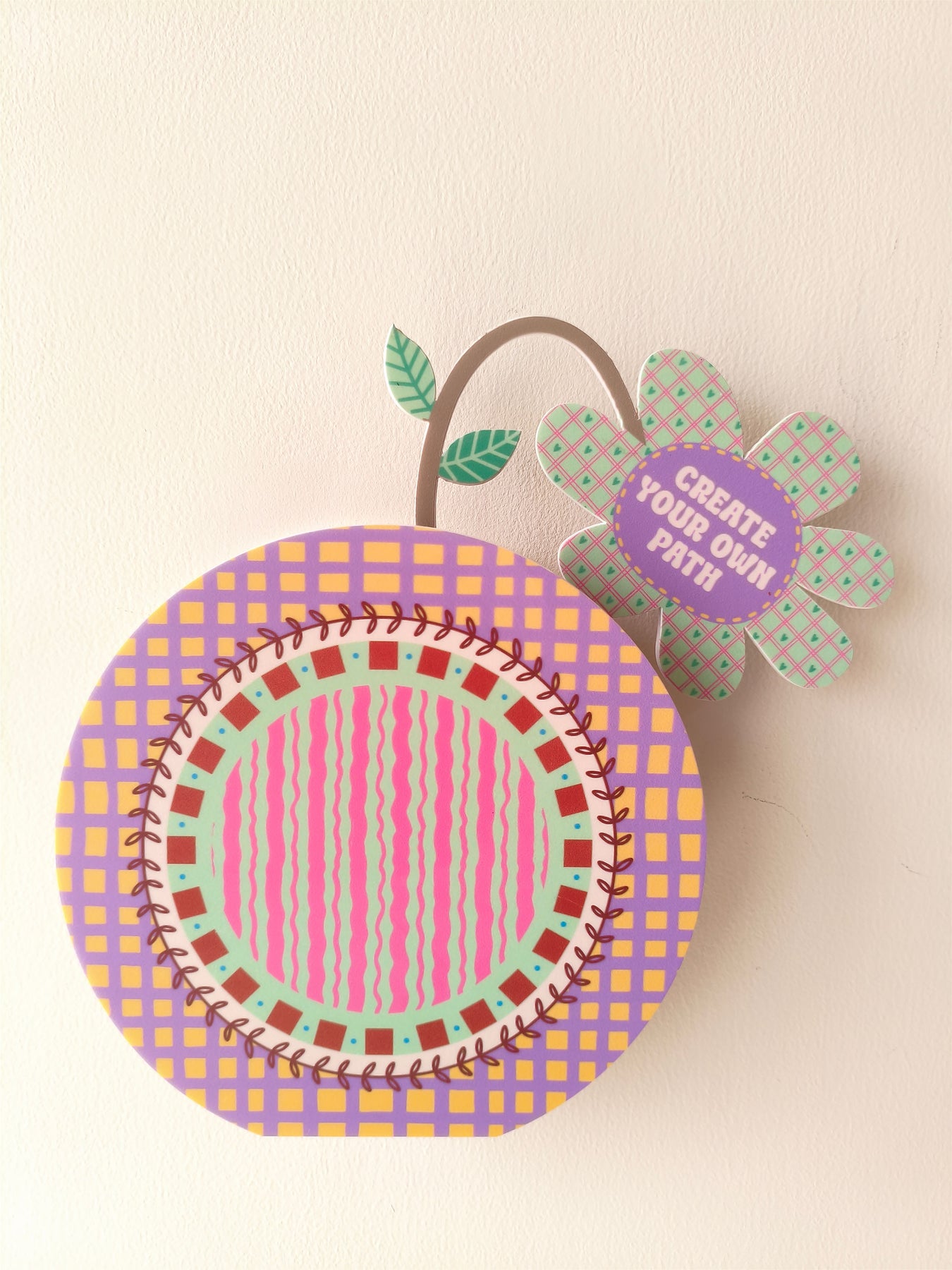 This circular vase features a checkered design paired with a subtle inner circle, creating a calm and balanced look. The quote “Create your own path” sits on the flower within the vase, gently encouraging independence, self-trust, and the freedom to move at your own pace.