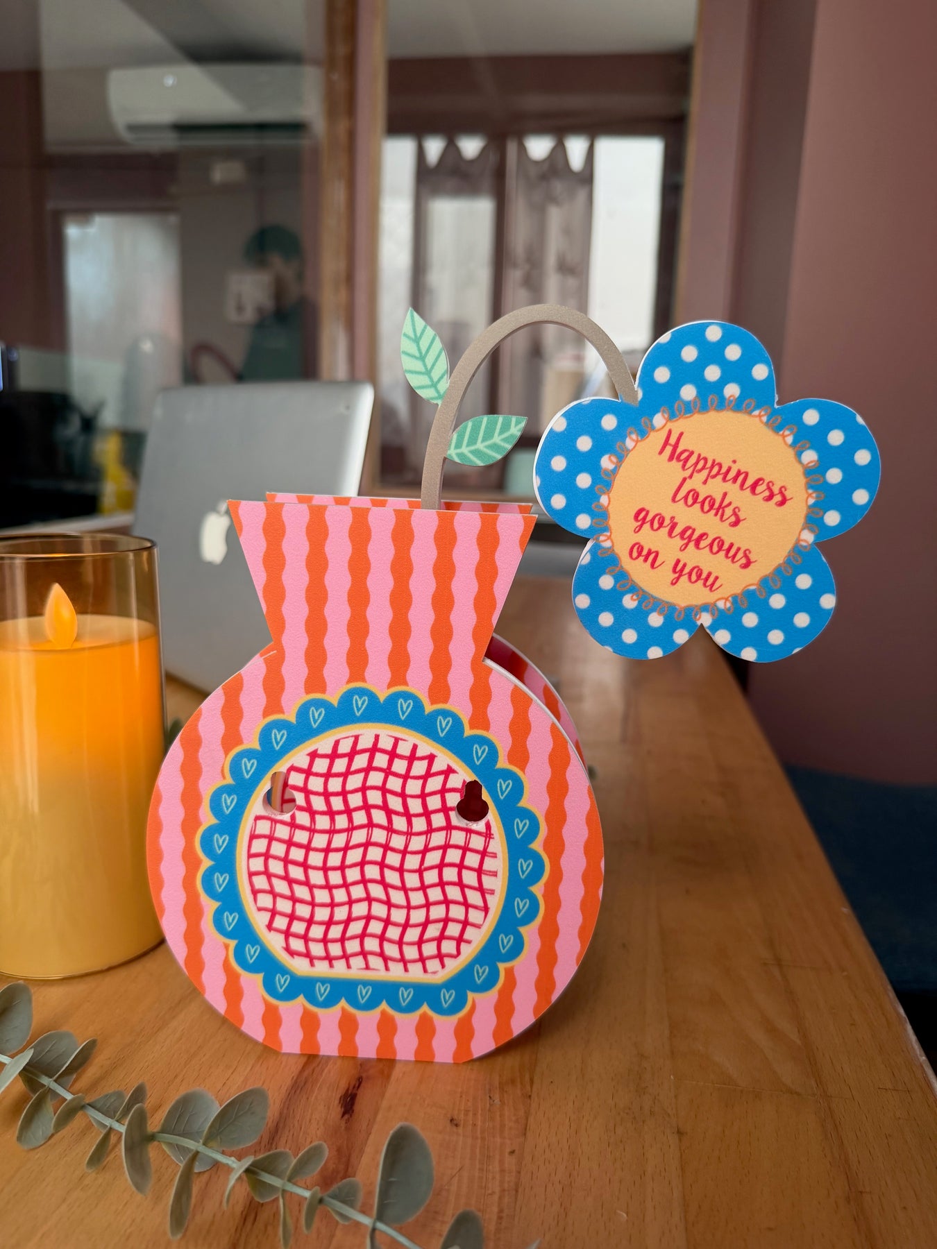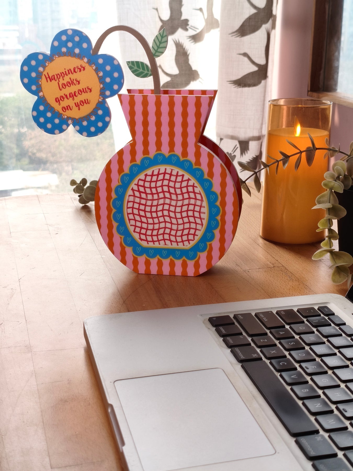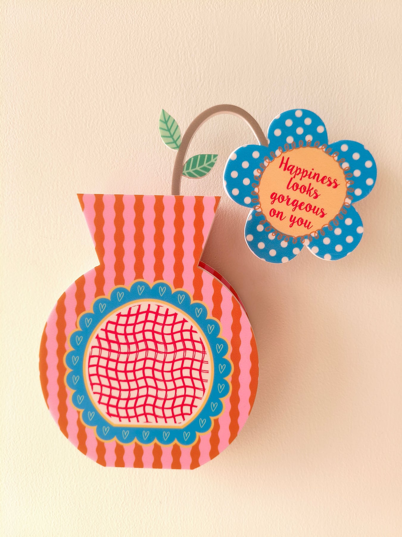 Shaped like a classic vase and finished in soft pink and warm orange tones, this piece feels calm and easy to live with. The quote “Happiness looks gorgeous on you” sits on the flower within the vase, offering a gentle reminder to embrace joy and let it show, just as you are. It brings a quiet sense of warmth and confidence to everyday spaces.