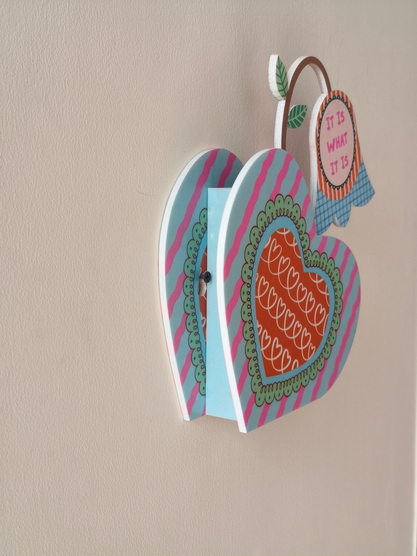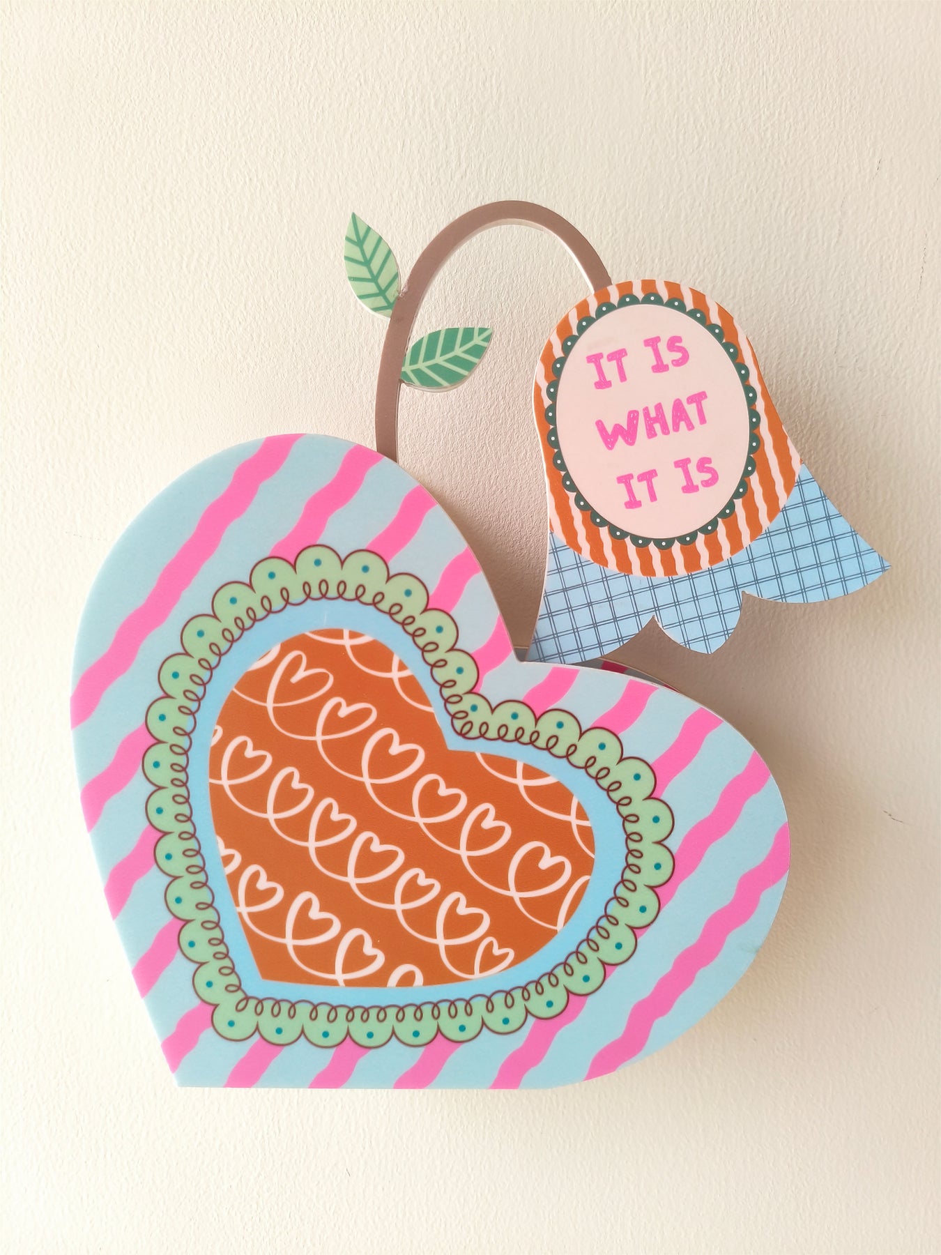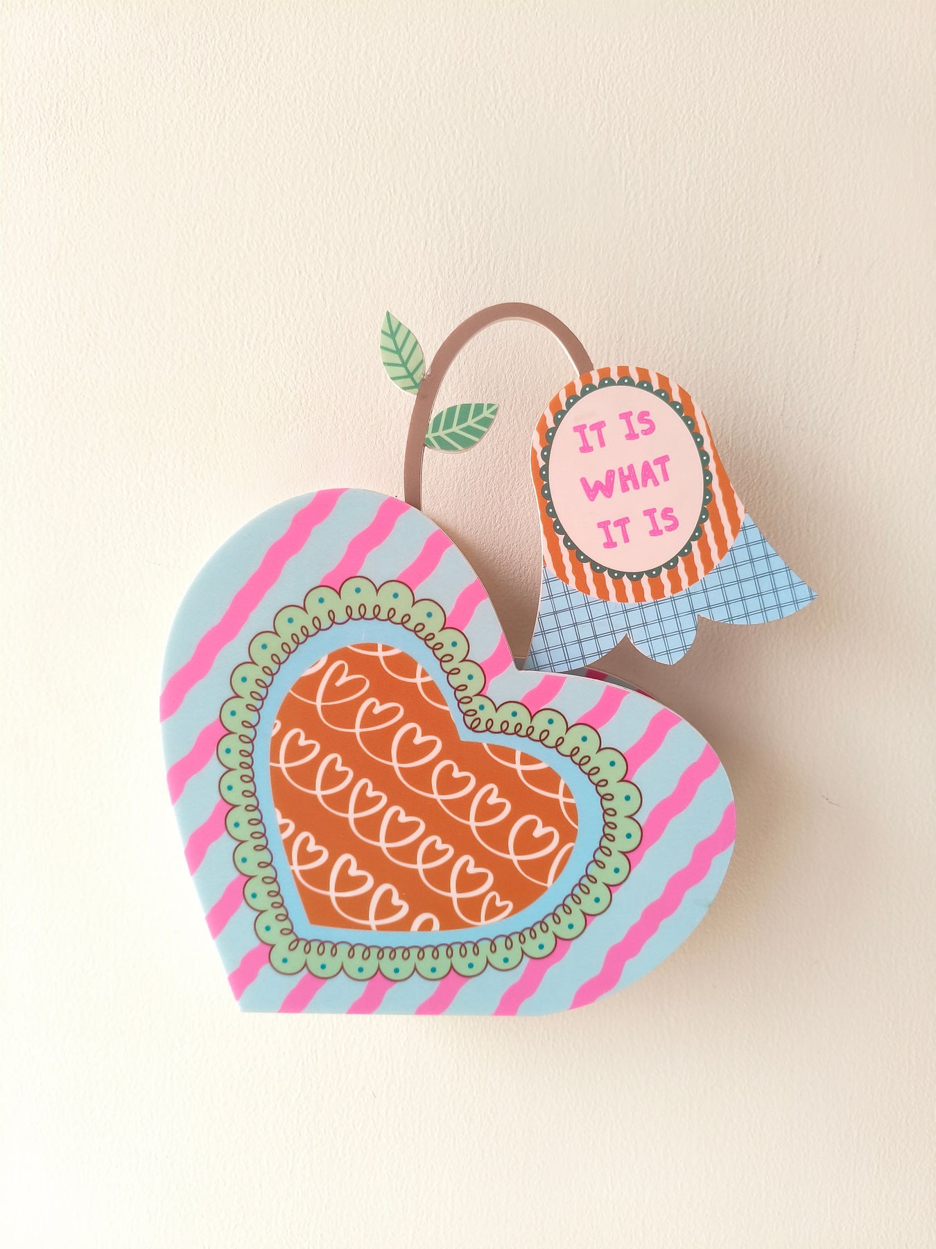 Shaped as a heart and finished in blue with soft pink wavy stripes, this vase feels calm and comforting. A gently designed inner heart adds warmth to the form. The quote “It is what it is” sits on the flower within the vase, offering a quiet reminder to let go of what you can’t change and find peace in accepting things as they are.