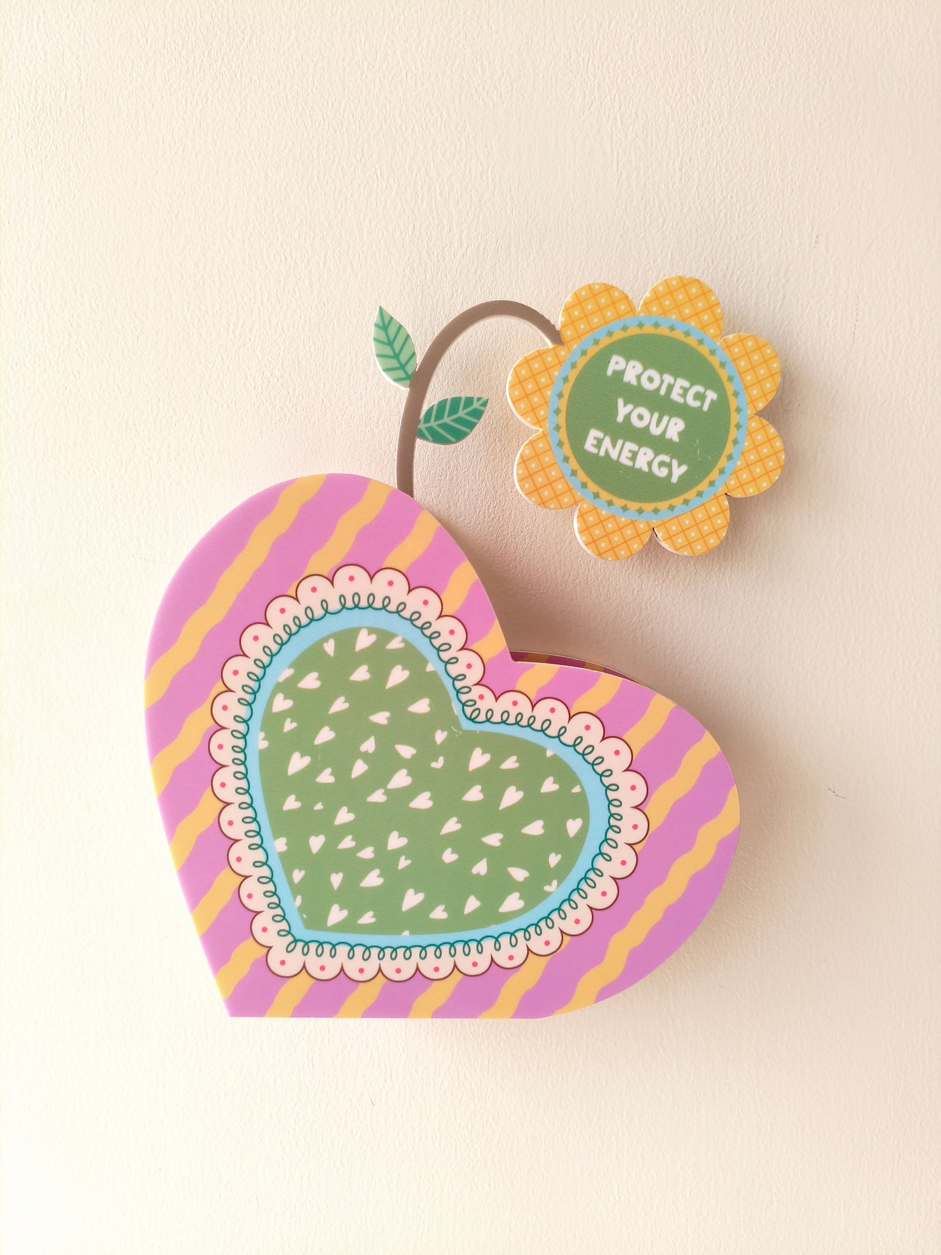 Shaped like a heart and finished in purple and yellow wavy stripes, this piece feels warm yet grounding. A soft inner heart design adds to its gentle presence, while the quote “Protect your energy” sits on the flower within the vase, offering a calm reminder to set boundaries, move with intention, and care for your inner peace.