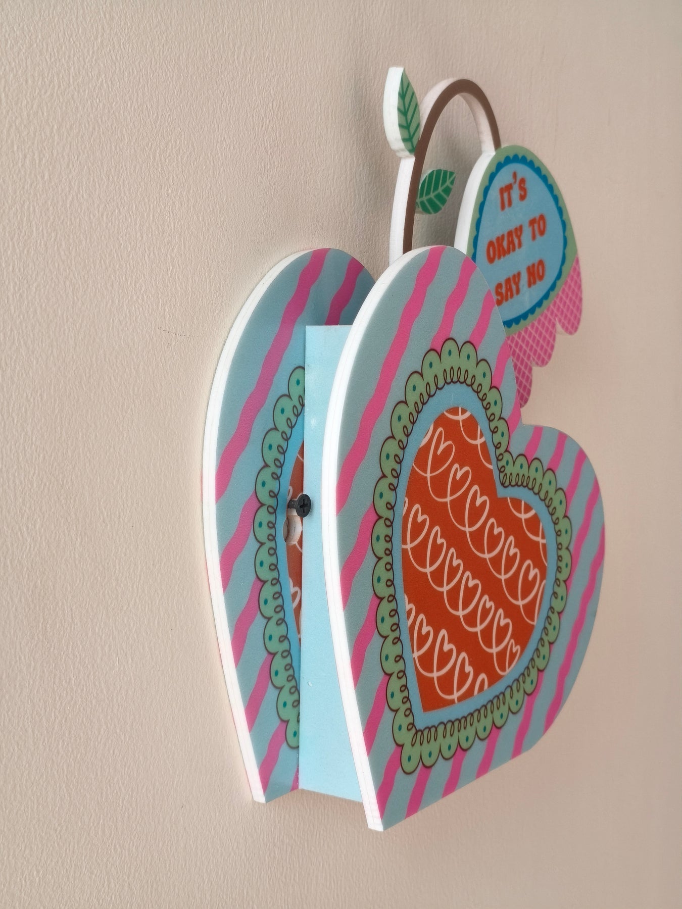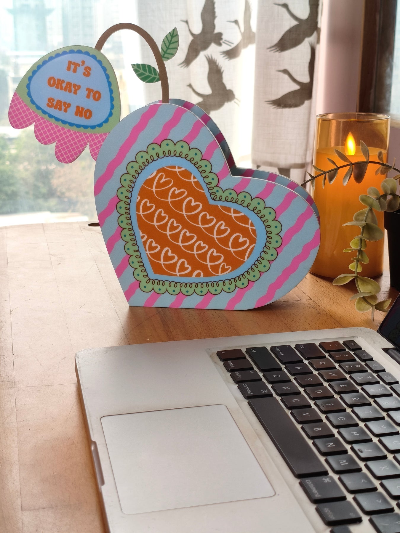 This heart-shaped vase features pink wavy stripes over a soft blue base, paired with a gently designed inner heart for a calm and comforting presence. The quote “It’s okay to say no” appears on the flower within the vase, gently encouraging healthy boundaries and reminding you that choosing yourself is always allowed.