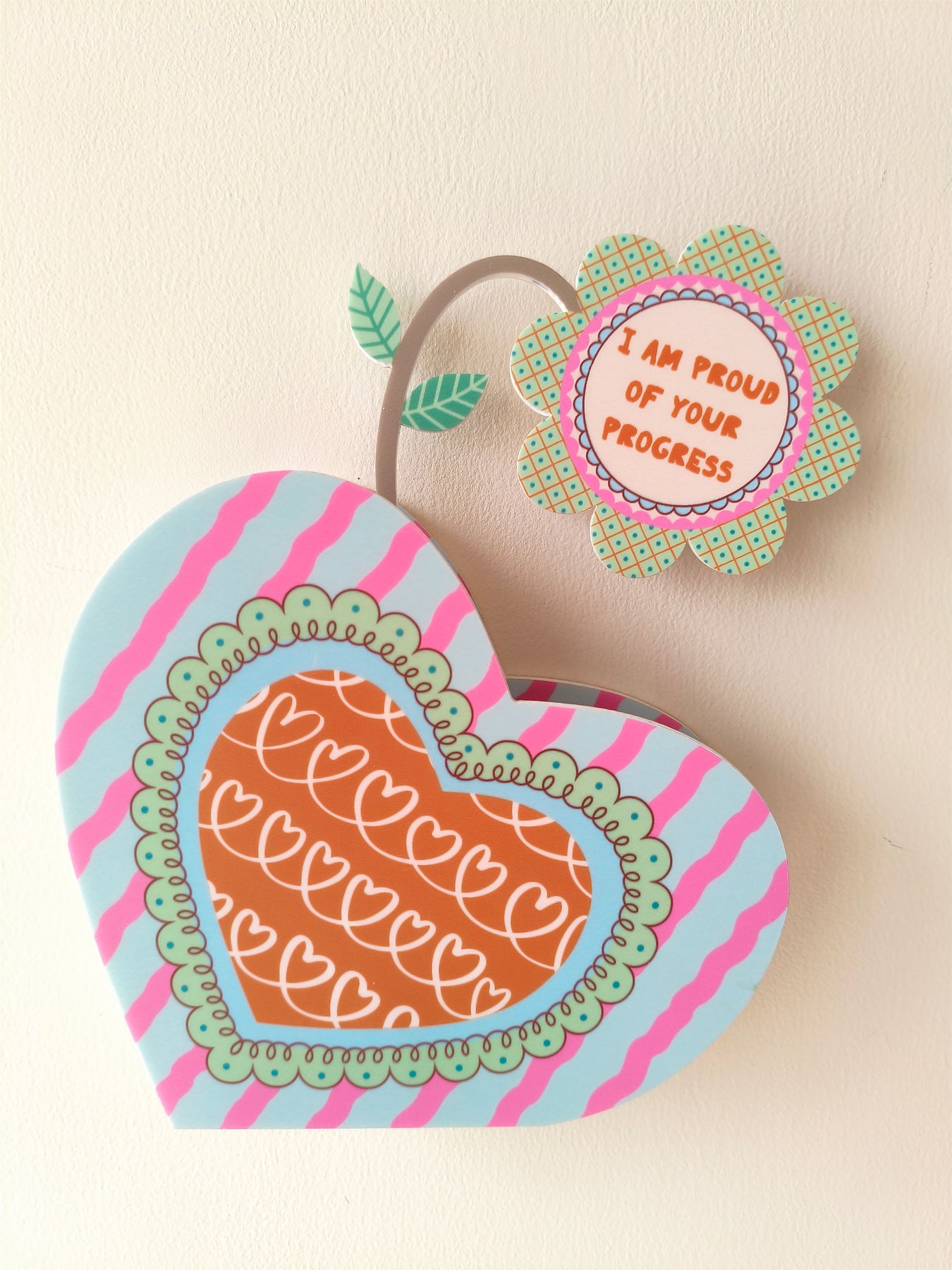 This heart-shaped vase features pink wavy stripes over a soft blue base, paired with a gently designed inner heart for a comforting, steady look. The quote “I am proud of your progress” appears on the flower within the vase, gently reminding you to acknowledge how far you’ve come and celebrate growth at your own pace.