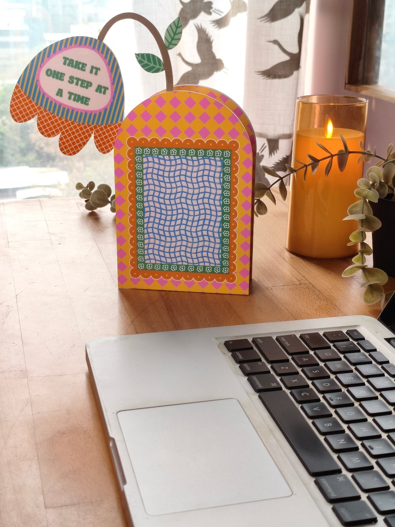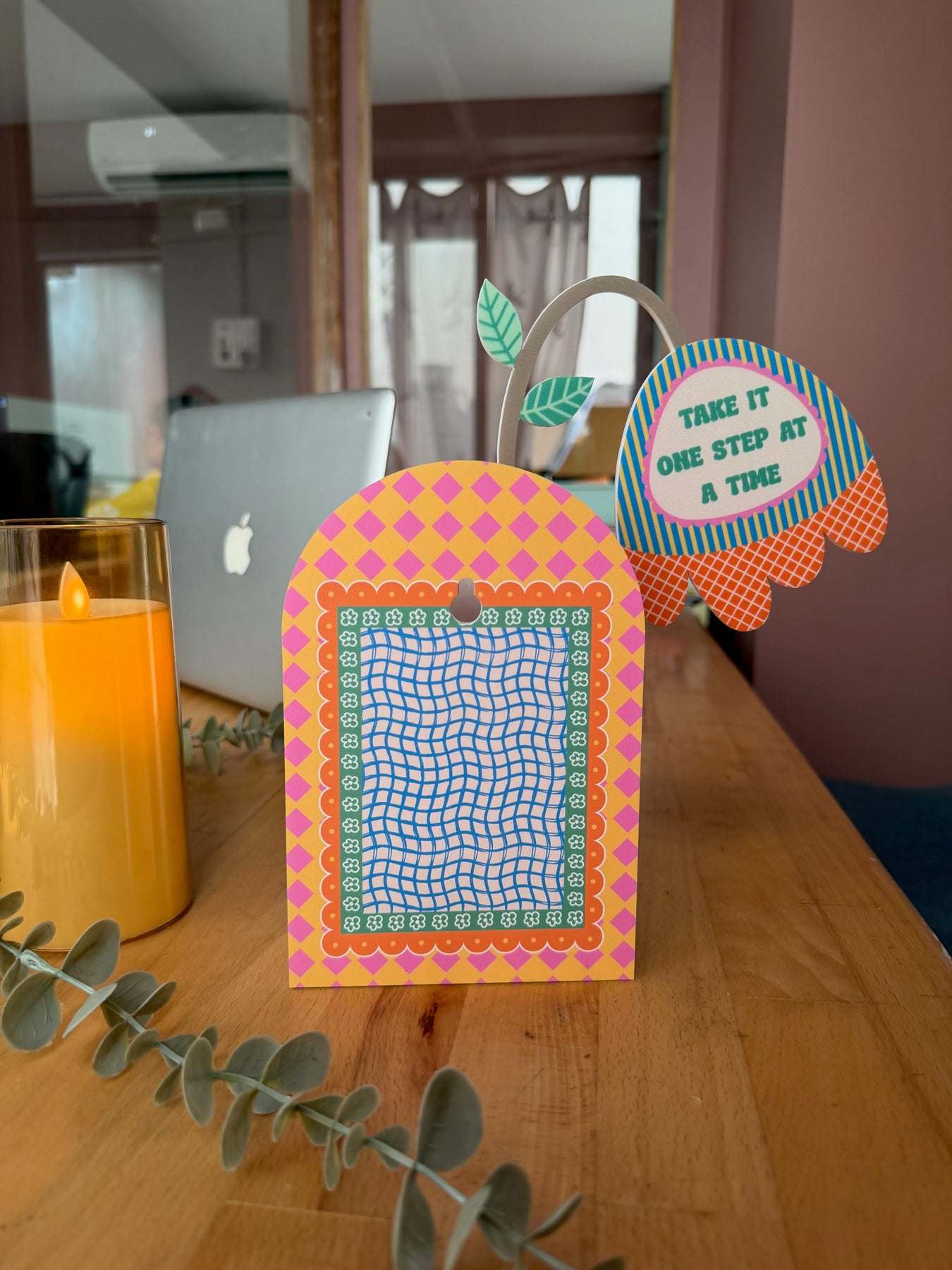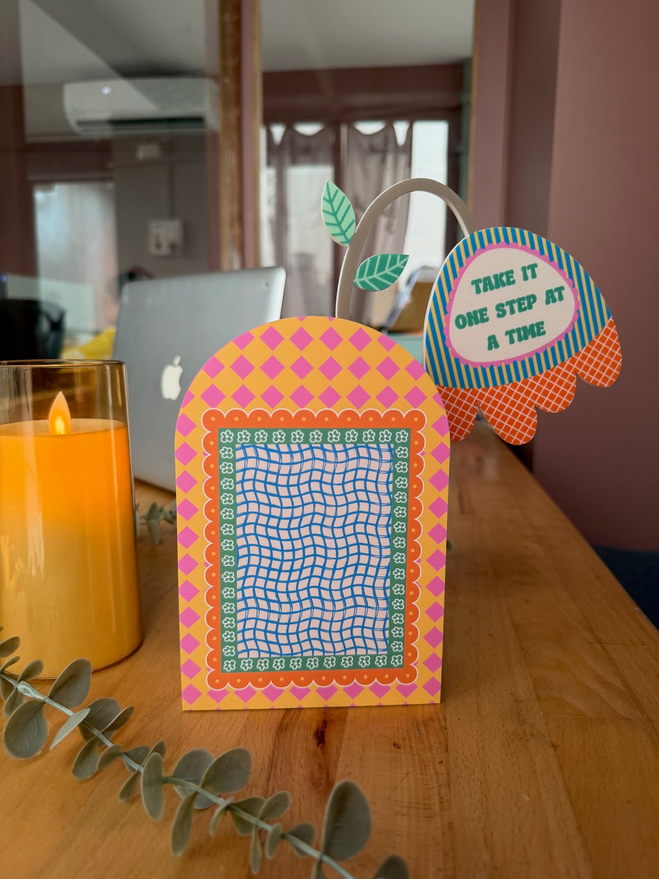 Shaped as a soft arch in cheerful yellow with delicate pink diamond details, this piece feels light and reassuring. The gentle inner rectangular form adds a sense of calm structure, while the quote “Take it one step at a time” appears on the flower, offering a comforting reminder to slow down, breathe, and move forward at your own pace.