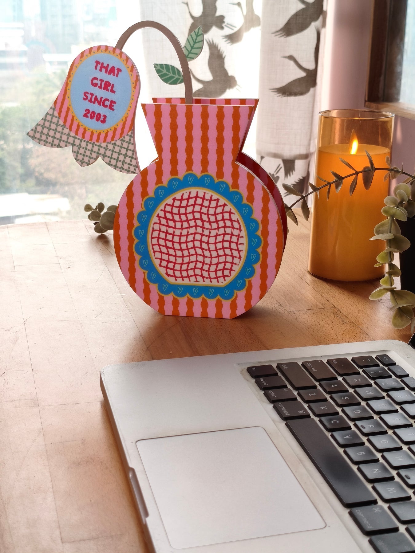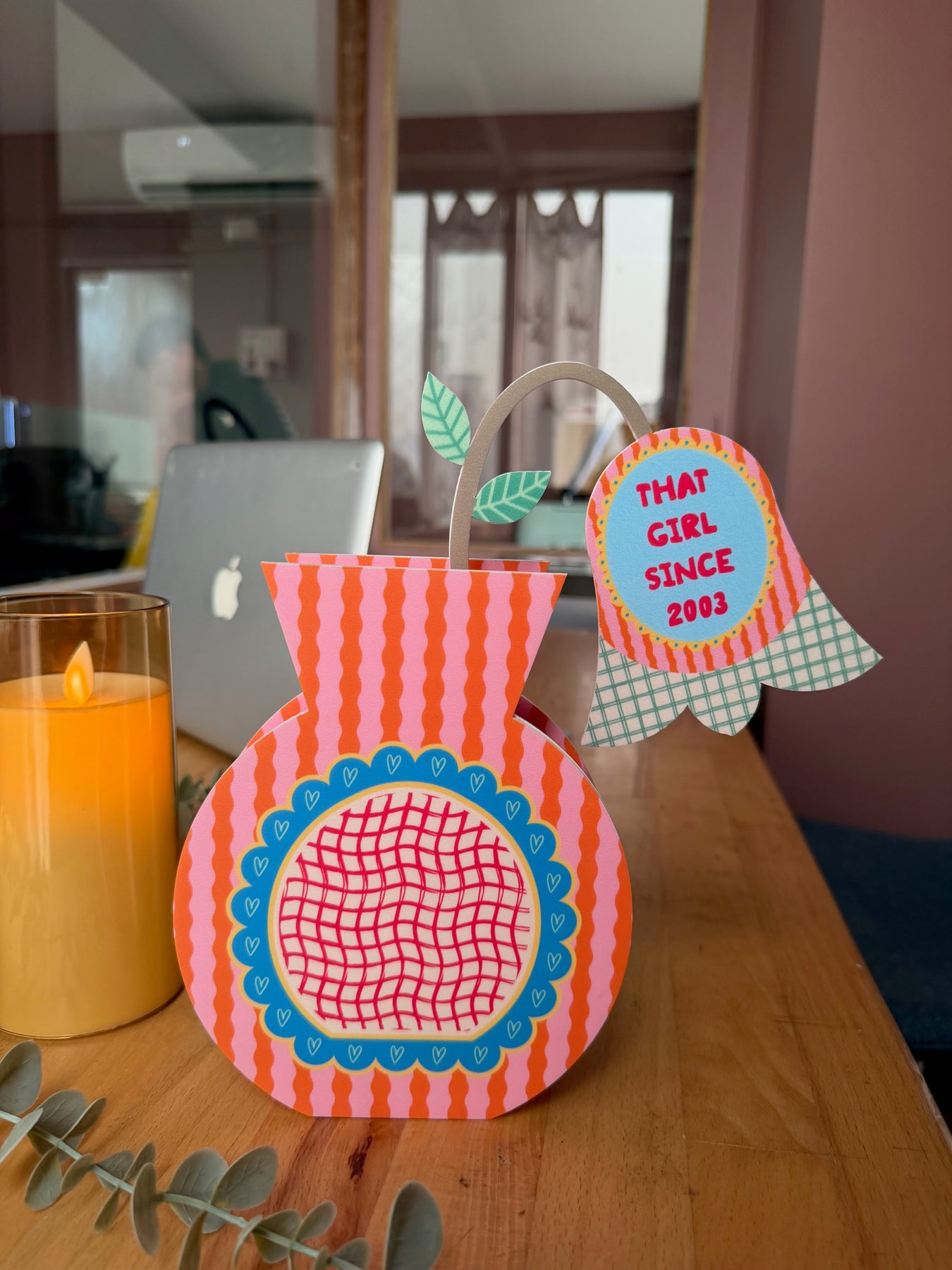 Shaped like a classic vase and finished in soft pink and warm orange tones, this piece feels calm and easy to live with. The quote “That Girl since 2003” sits on the flower within the vase, celebrating confidence, individuality, and owning who you are. It feels playful yet assured, adding a subtle reminder of self-belief to everyday spaces. This design is completely personalisable with your choice of year, making it uniquely yours.