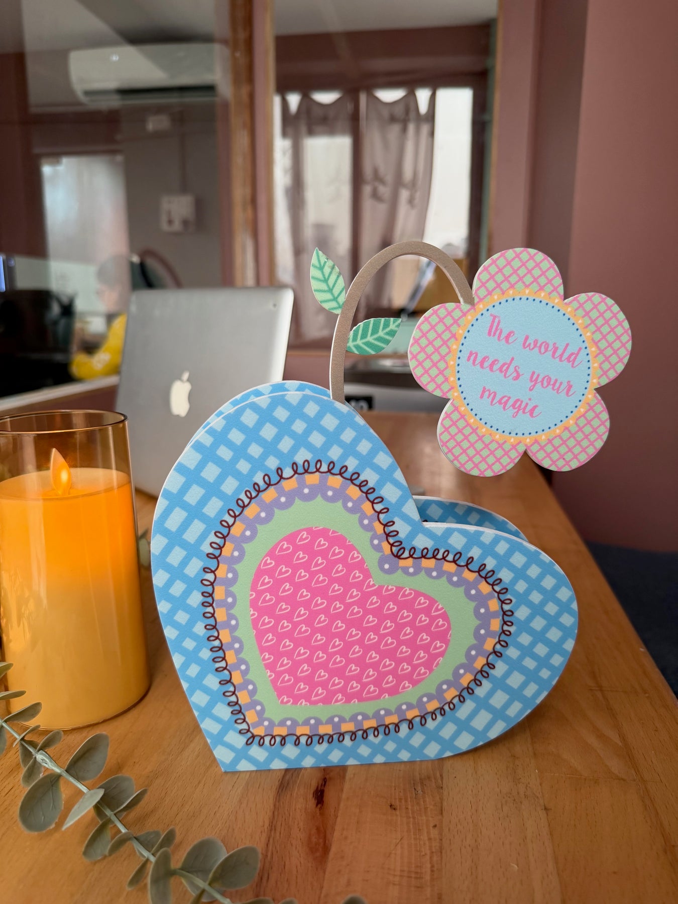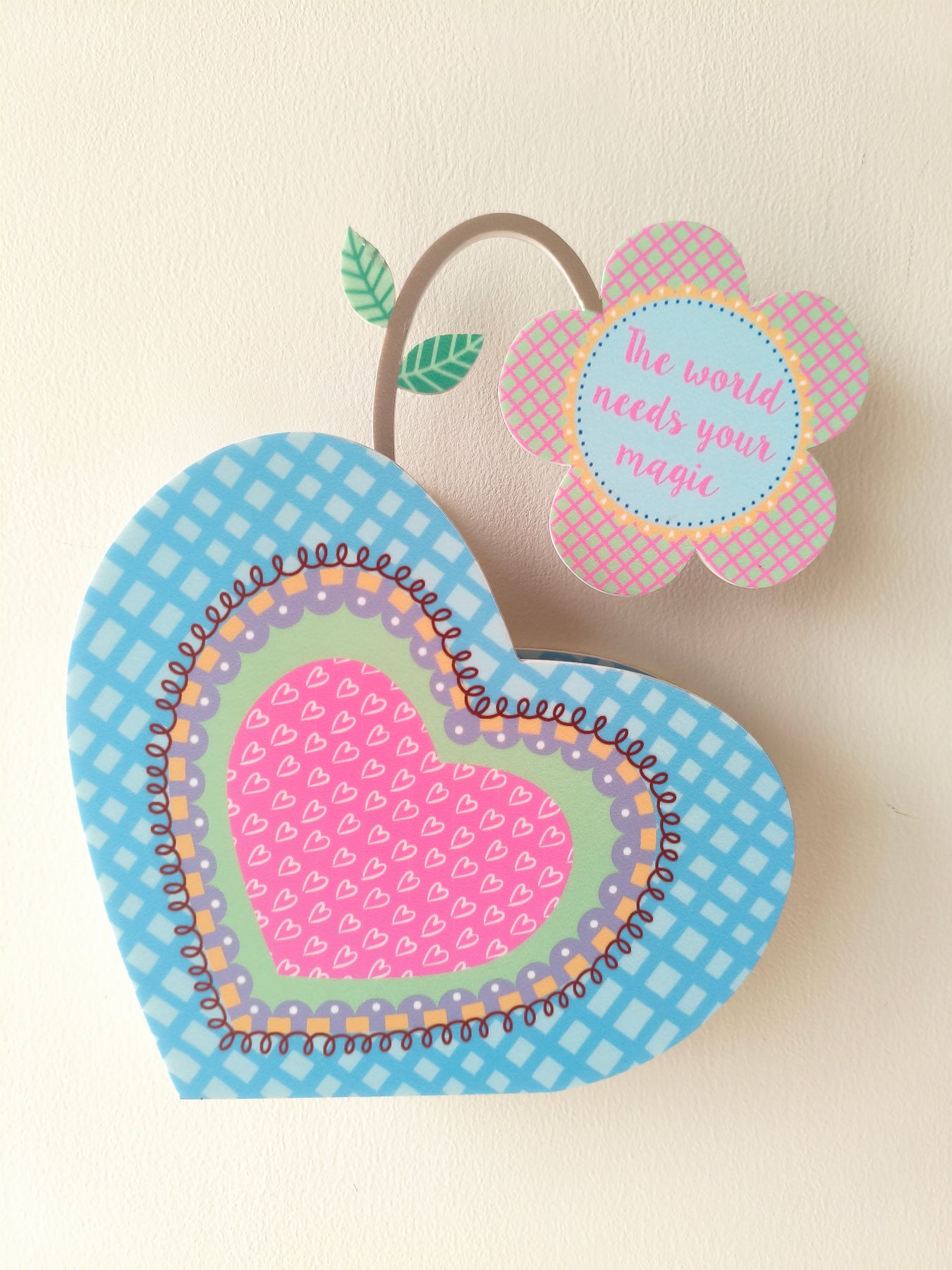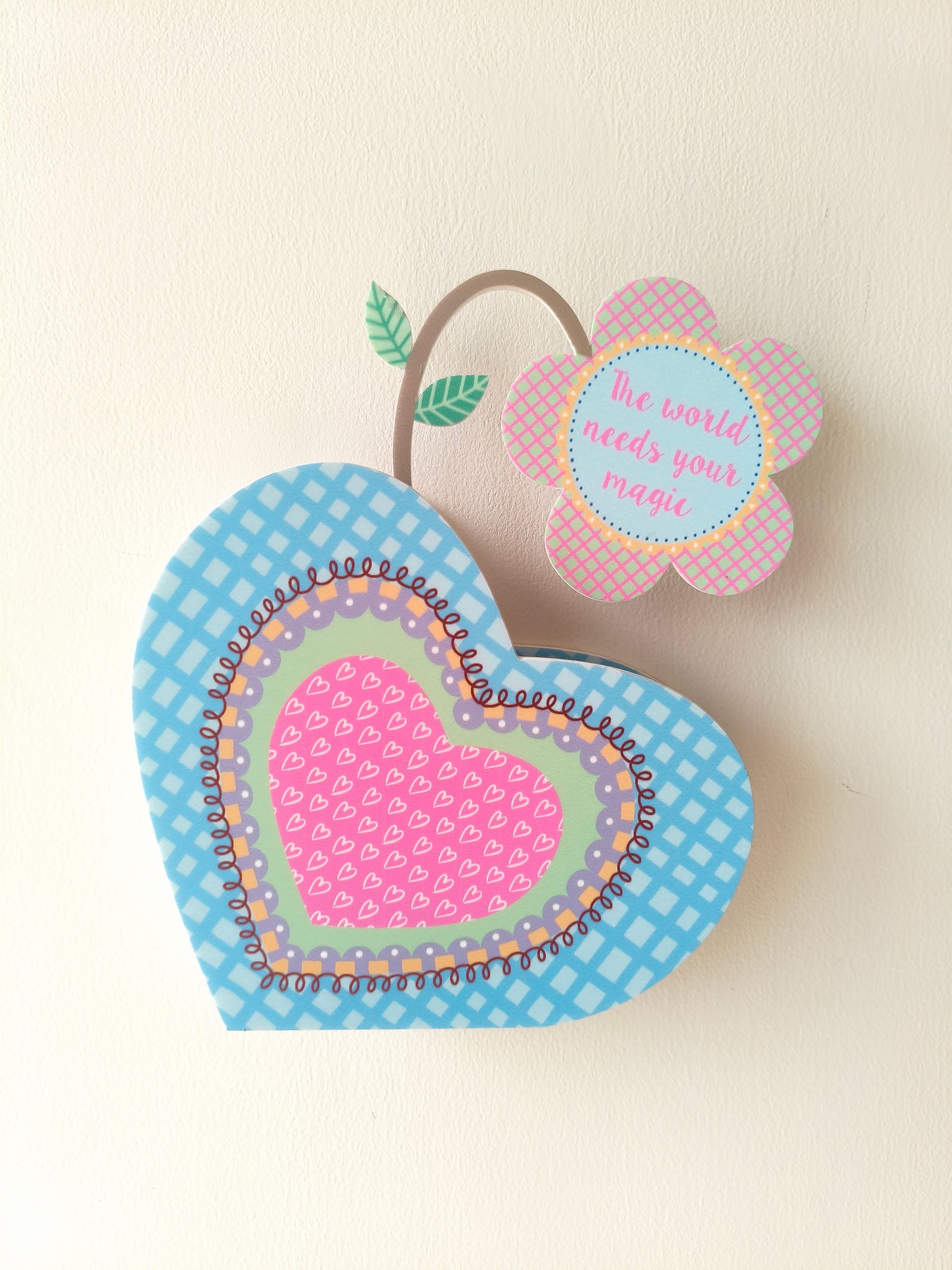 Shaped like a heart and finished in blue checkered tones, this piece feels calm and comforting. The softly designed inner heart adds warmth to the form, while the quote “The world needs your magic” appears on the flower, offering a gentle reminder that your presence and uniqueness truly matter.
