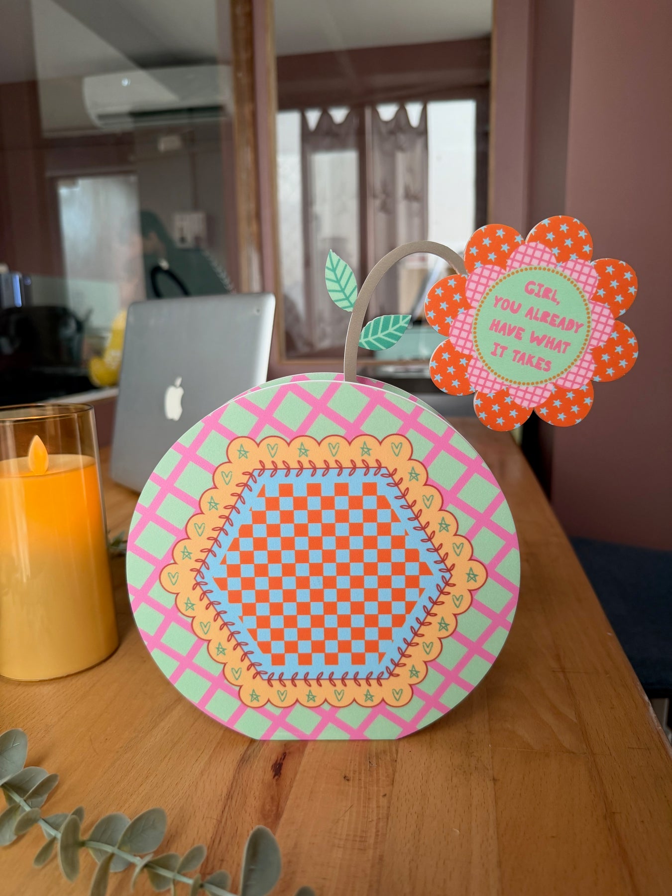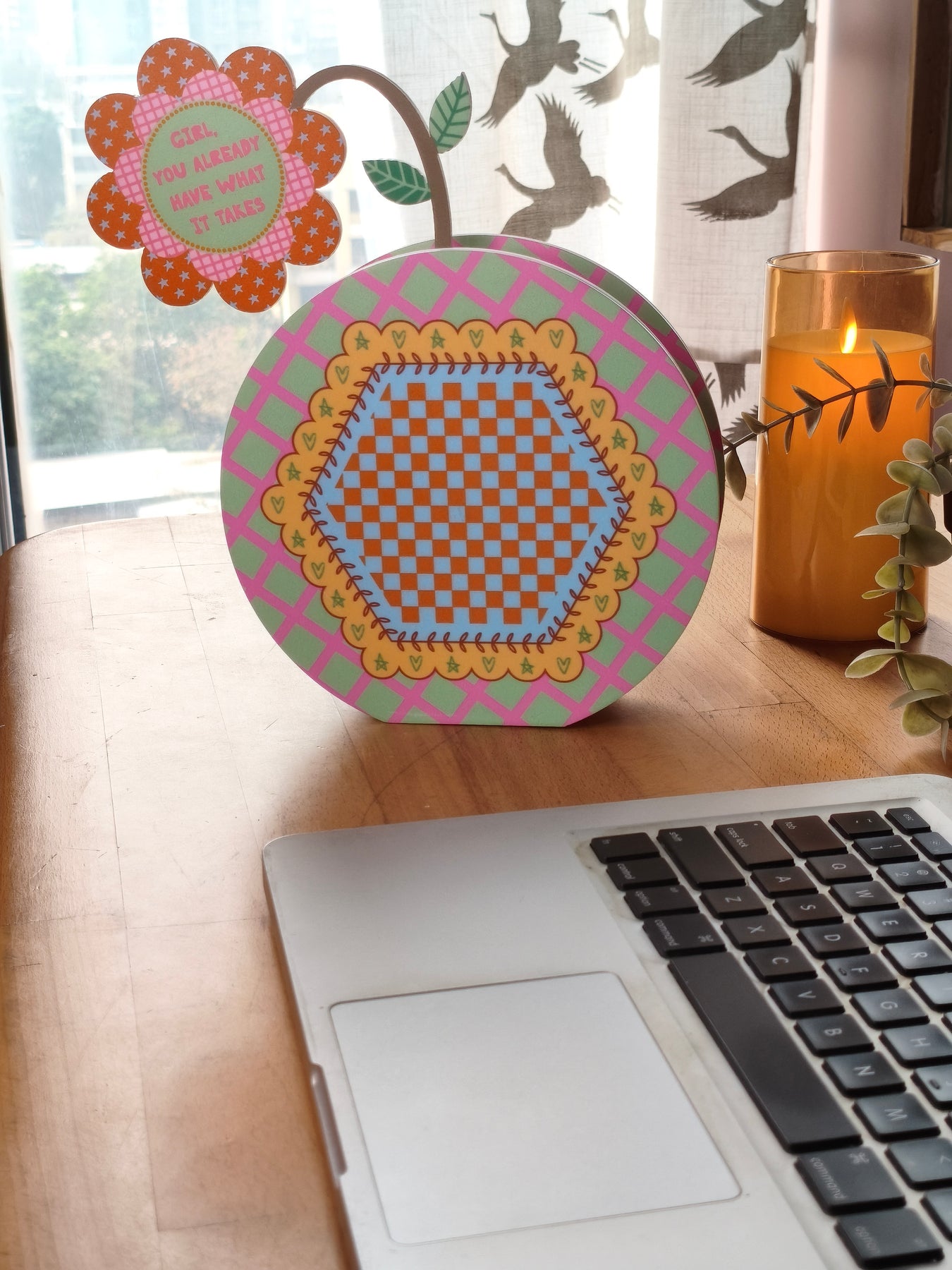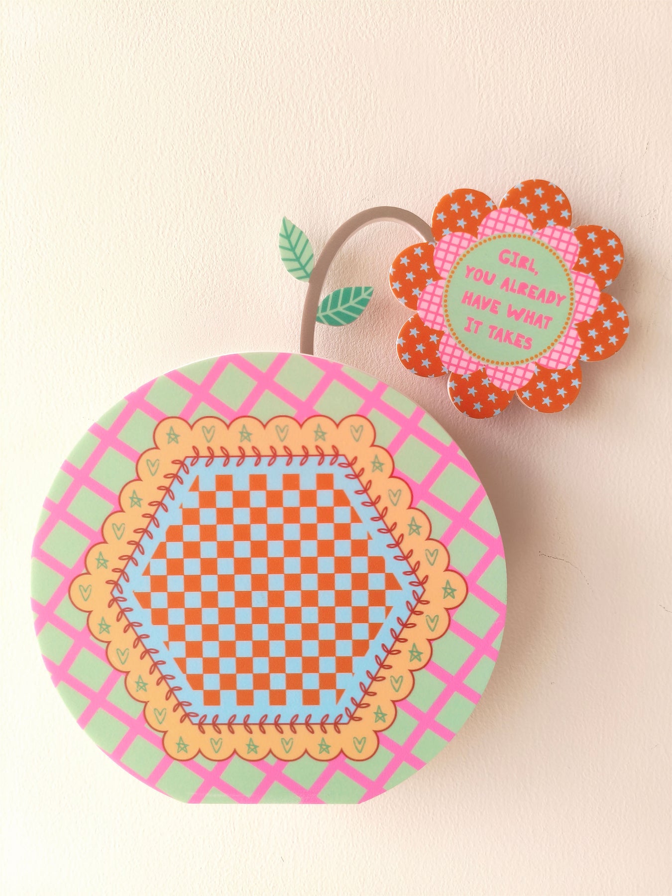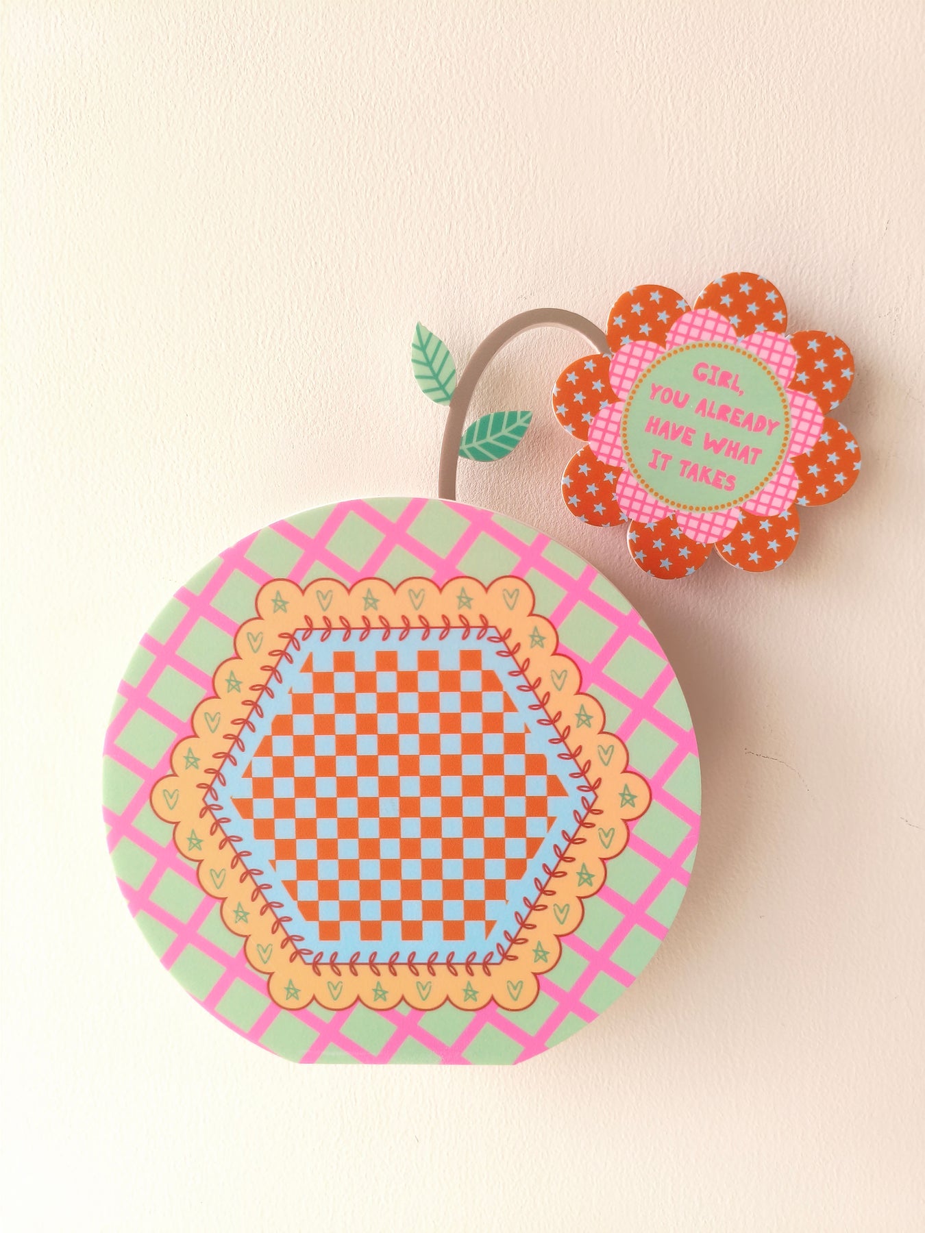 Finished in fresh green tilted checks, this vase feels steady and encouraging. A softly designed inner hexagon with a checkered pattern adds balance to the look. The quote “Girl, you already have what it takes” sits on the flower within the vase, offering a warm reminder to trust your abilities and step forward with confidence, just as you are.