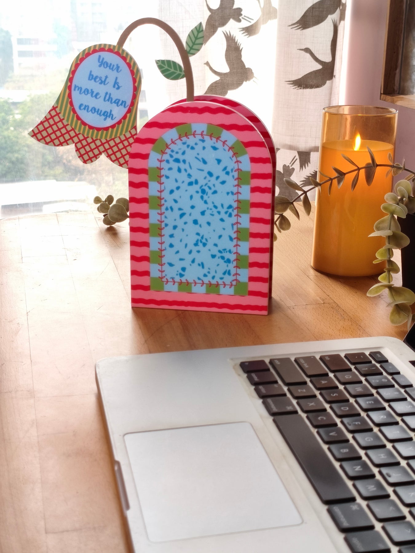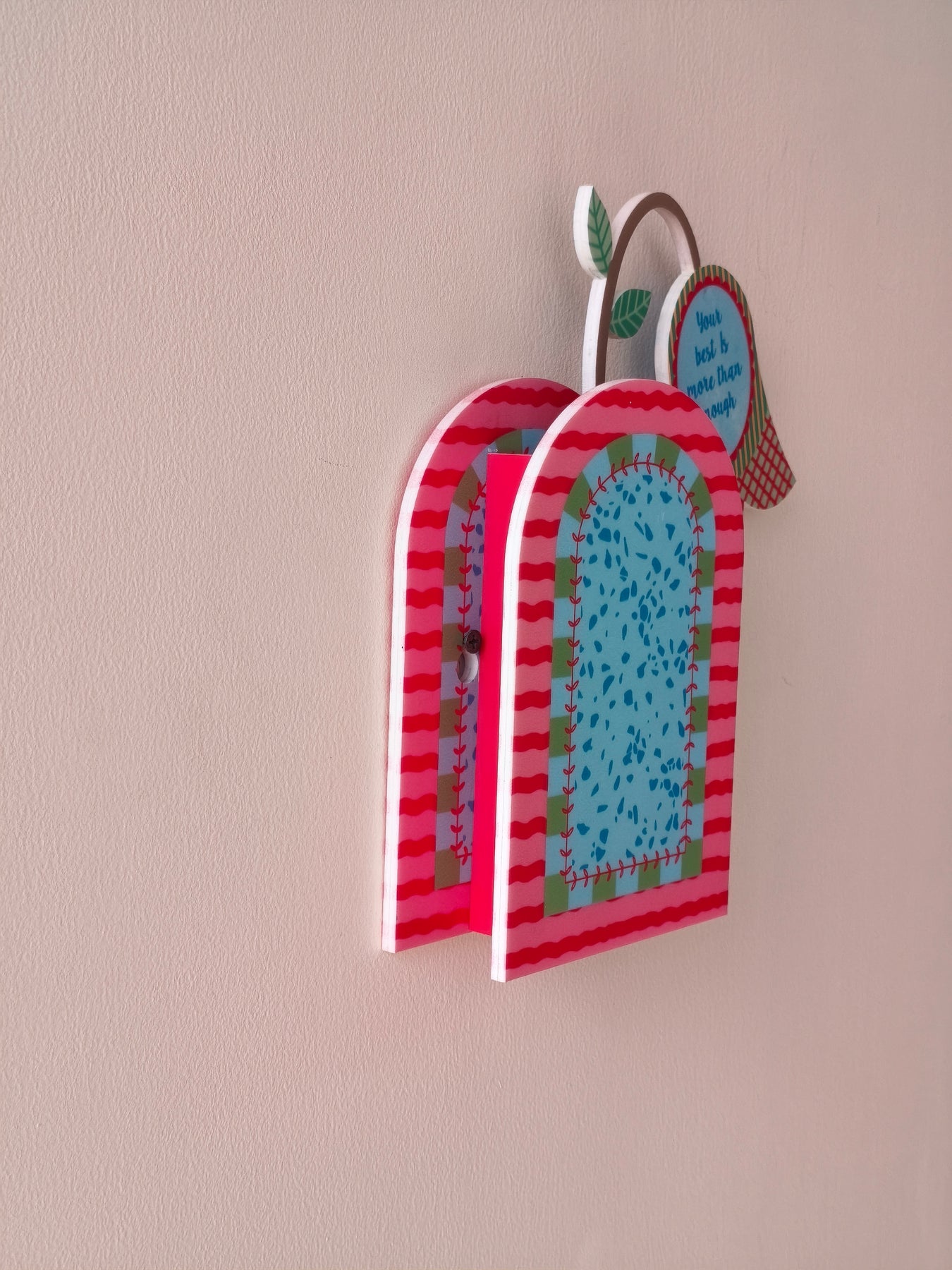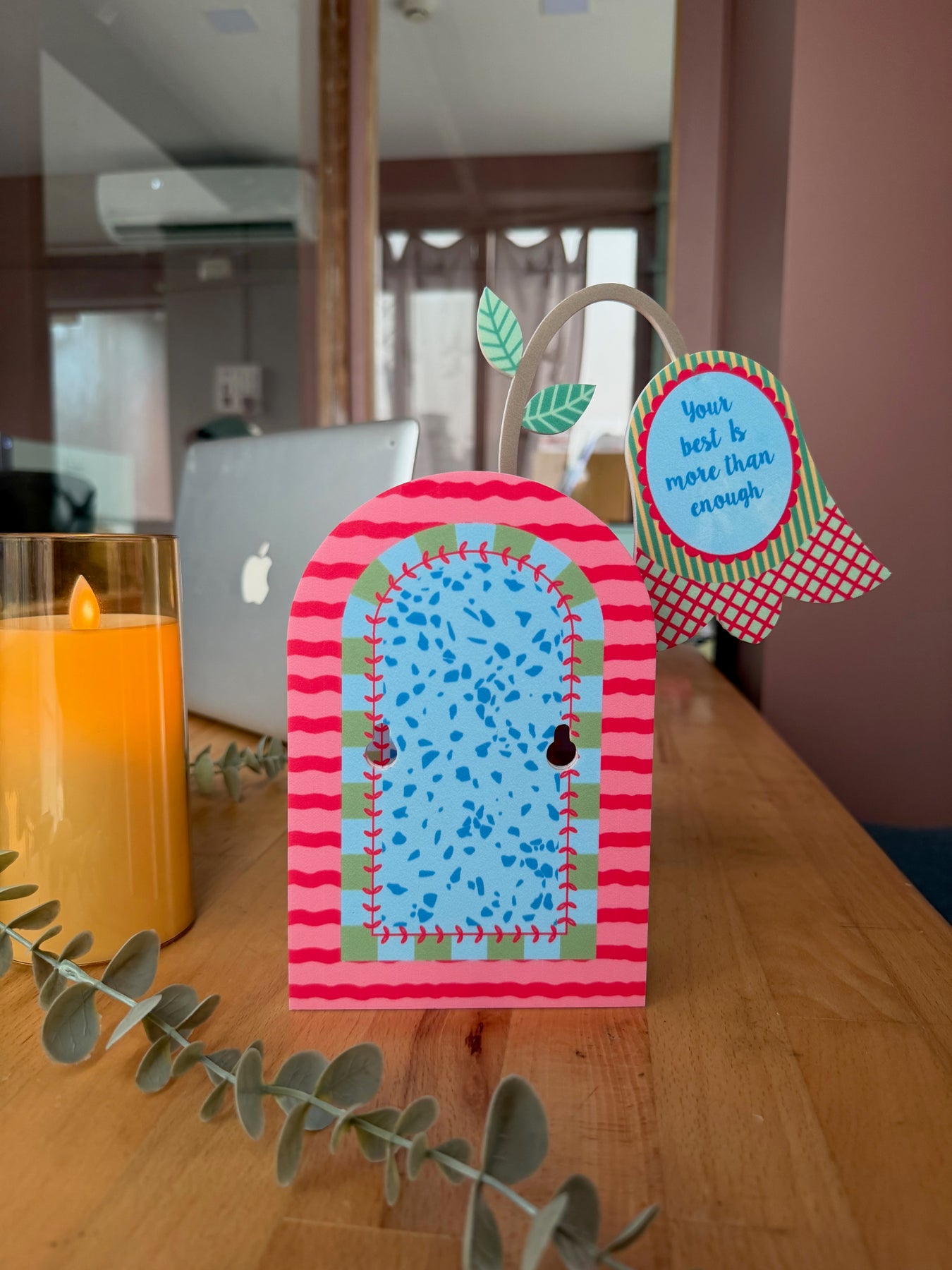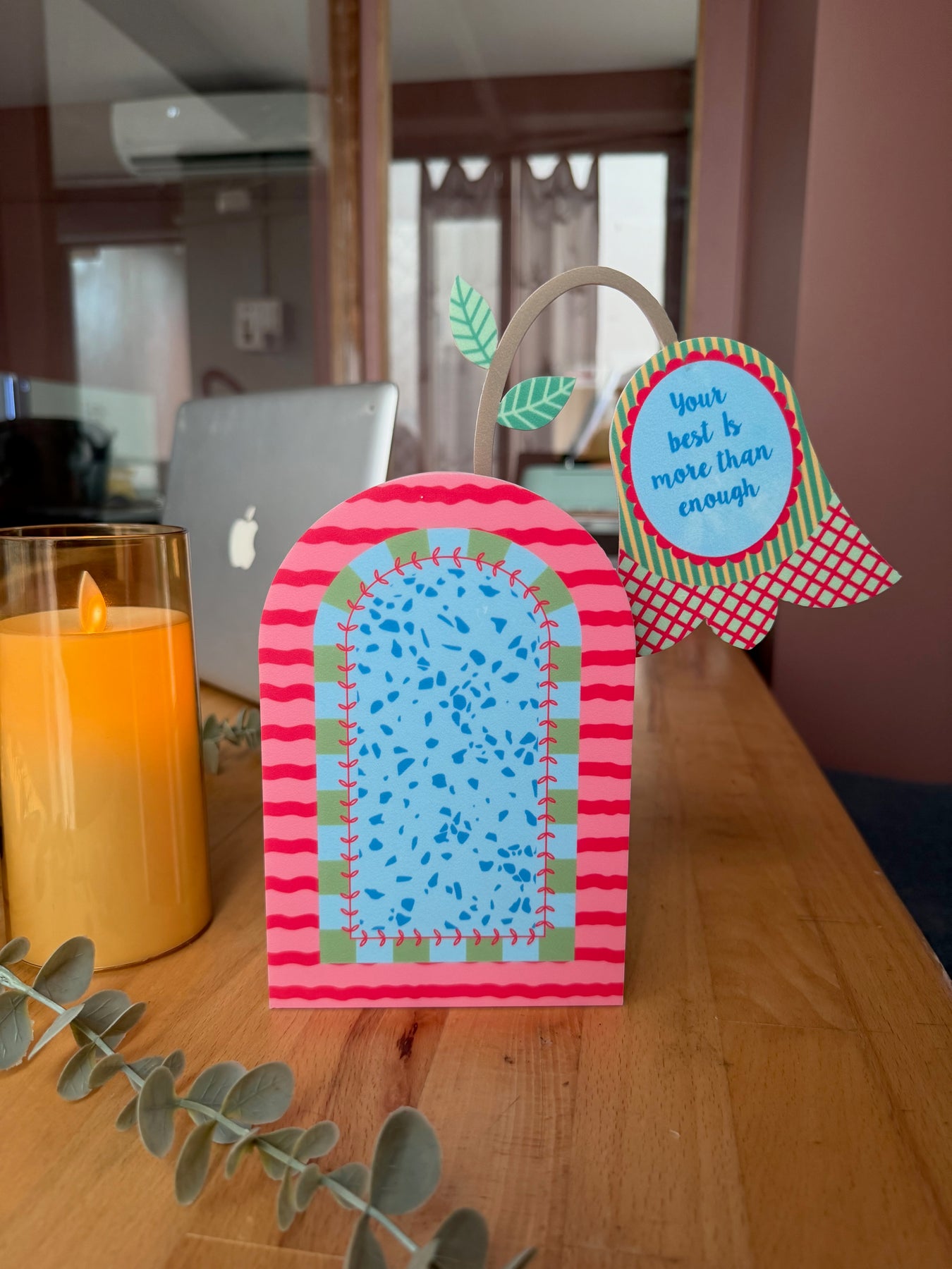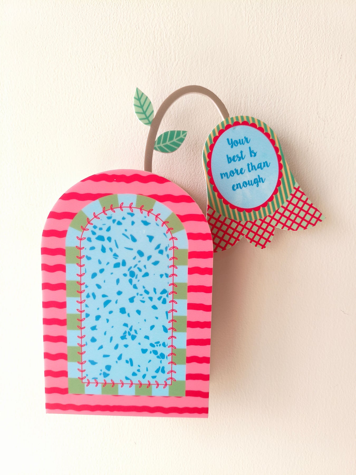 Shaped as an arch with flowing red and coral wavy stripes, this piece feels warm and reassuring. The softly detailed inner arch adds balance to the design, while the quote “Your best is more than enough” appears on the flower, offering comfort and reassurance on days when you need a little kindness toward yourself.