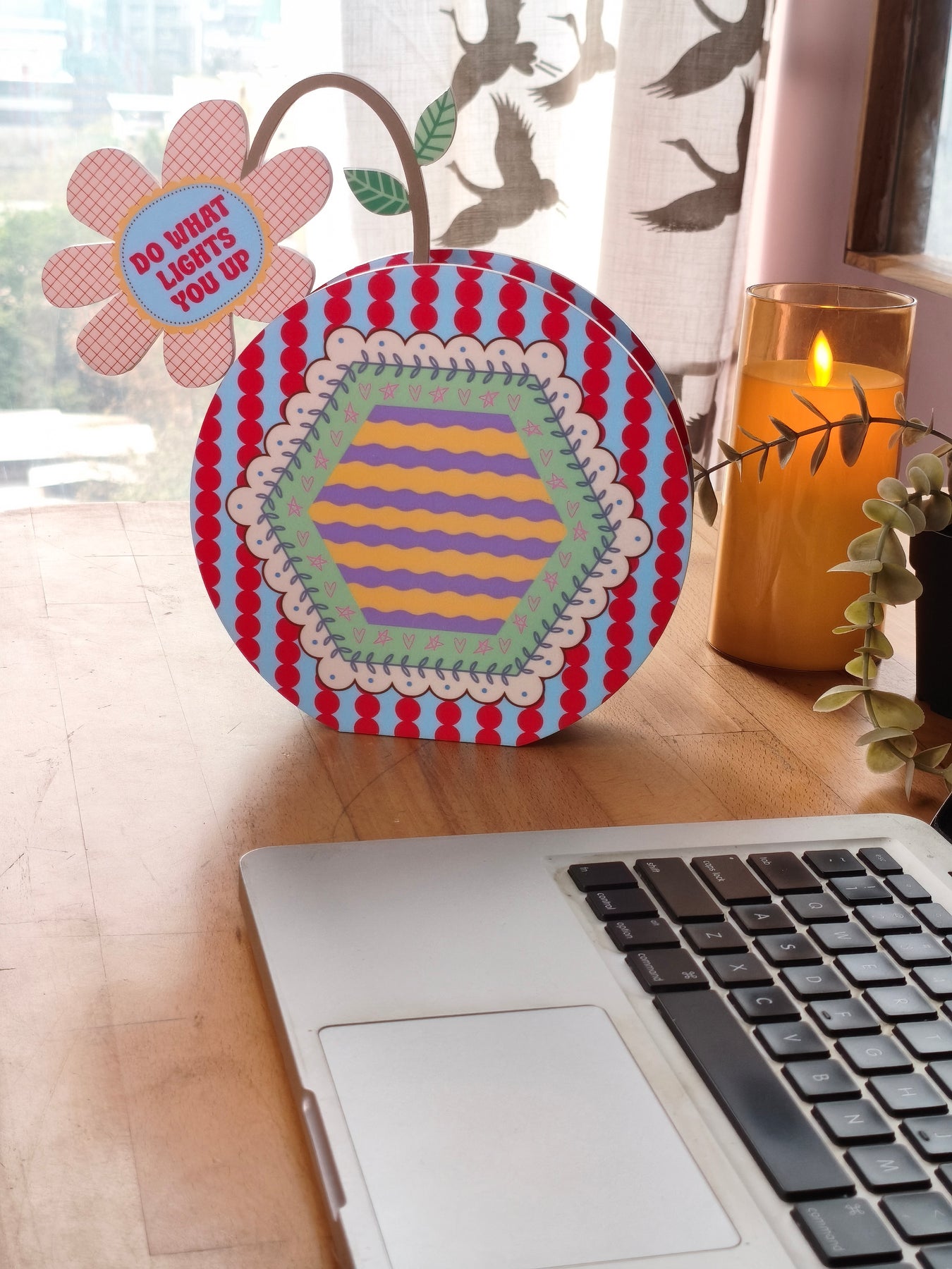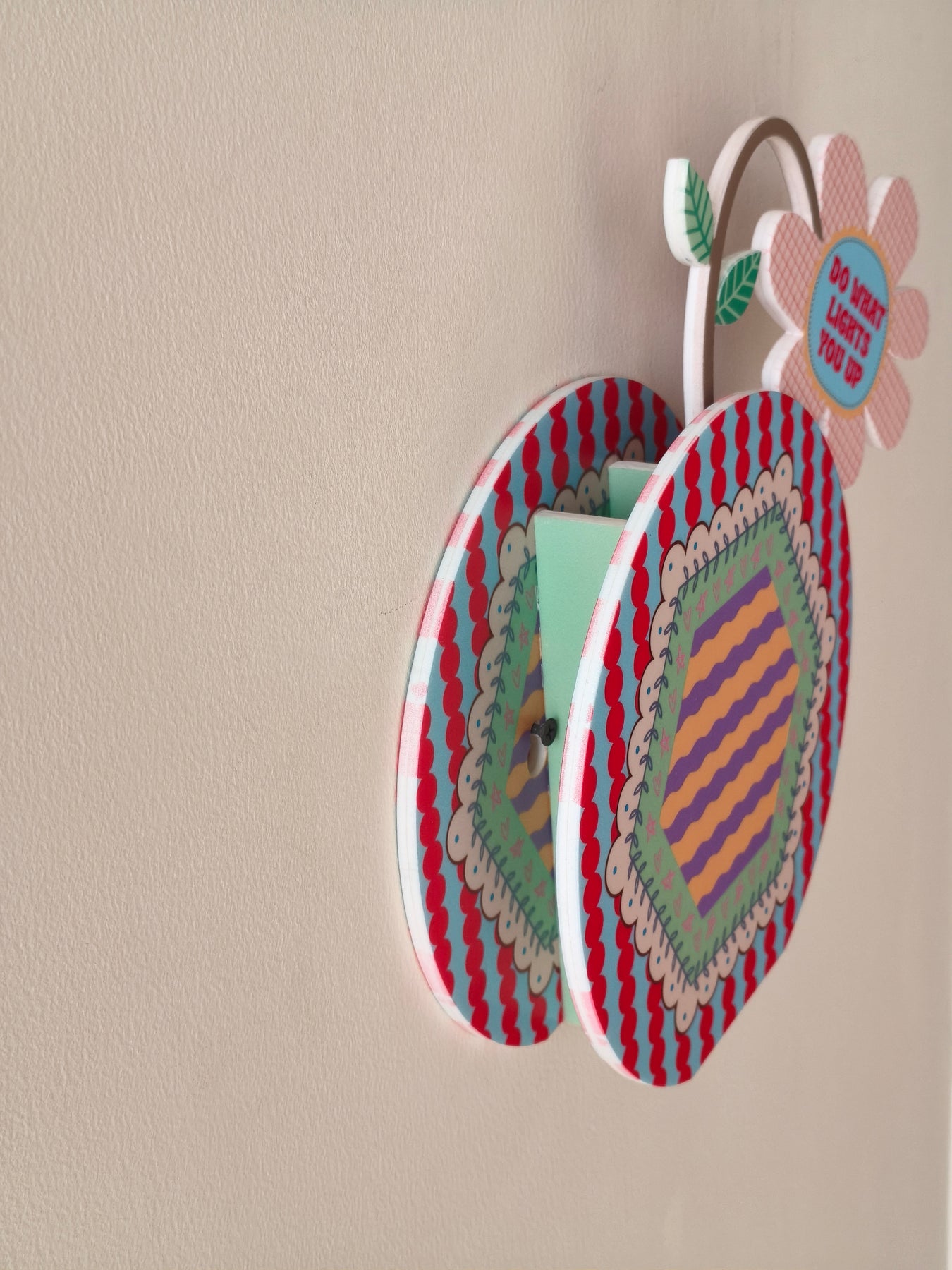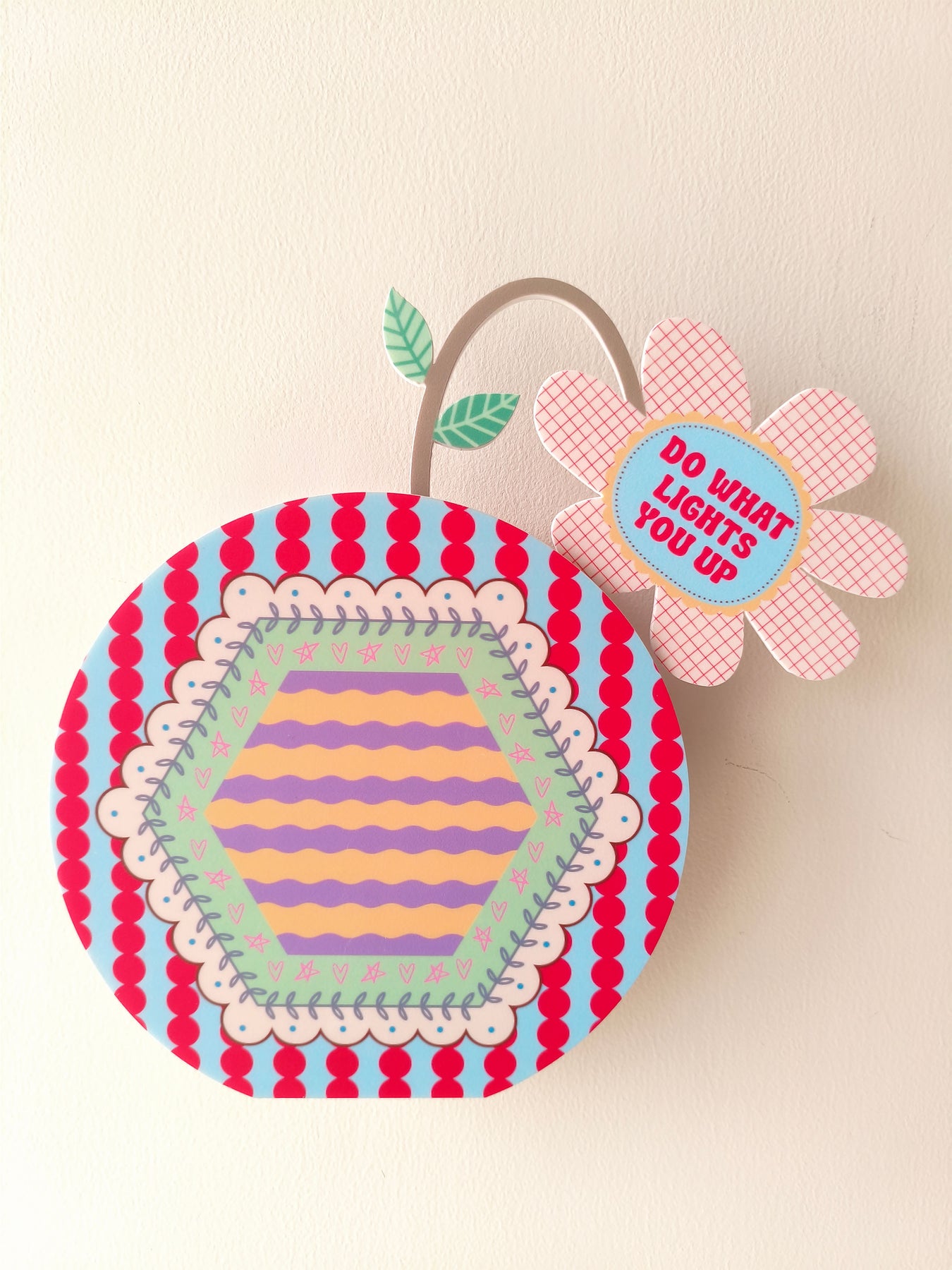 Shaped in a circular form with soft blue tones and red dotted stripe details, this piece feels fresh and uplifting. A gentle inner hexagon design adds balance, while the quote “Do what lights you up” sits on the flower within the vase, offering a quiet reminder to follow what brings you joy and energy.