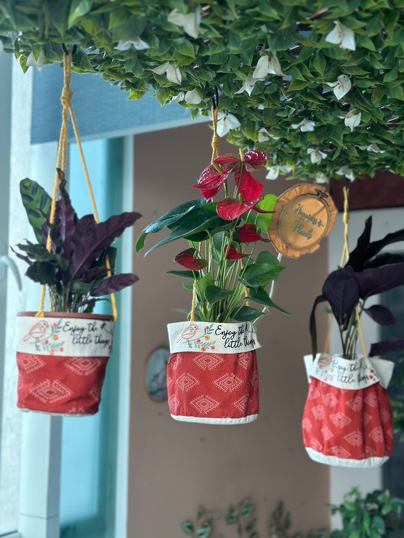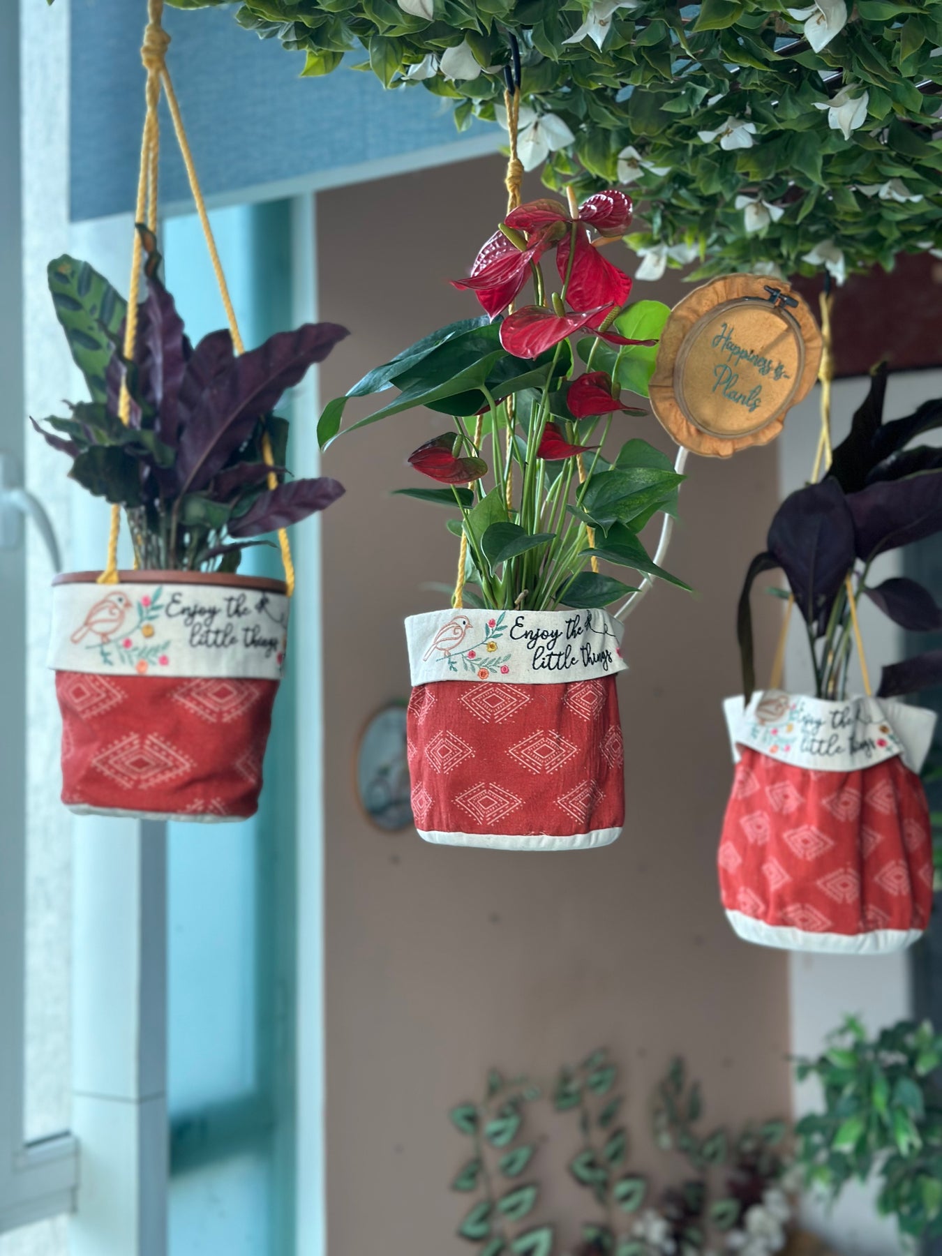 Planter baskets are a wonderful way to elevate your plants and hide those plain plastic pots. We're excited to introduce our handmade, eco-friendly planters, crafted from 100% recycled textiles. As part of our clothing production, we often have fabric scraps, and we love finding creative ways to repurpose them. This is how our beautiful boho planters came to life.