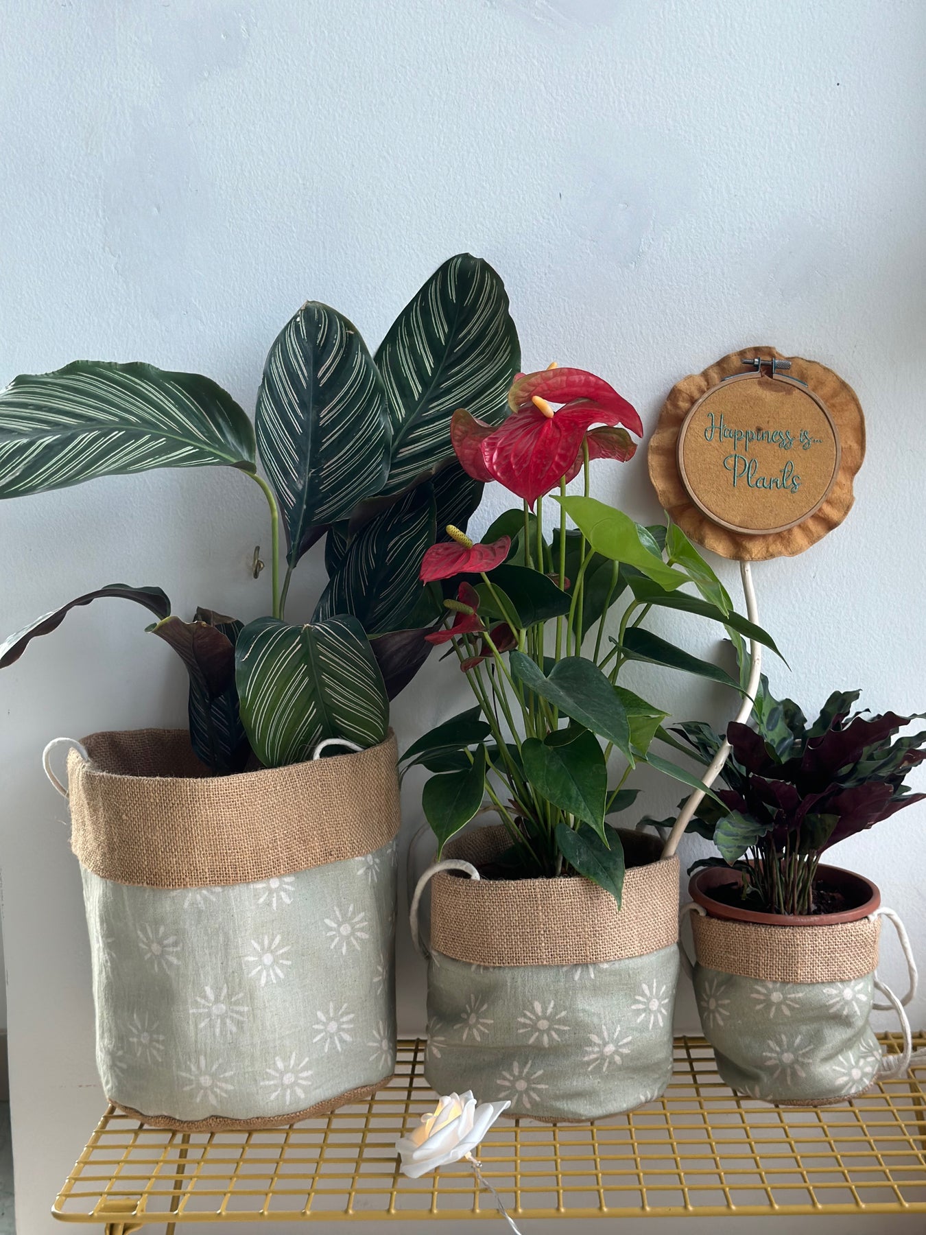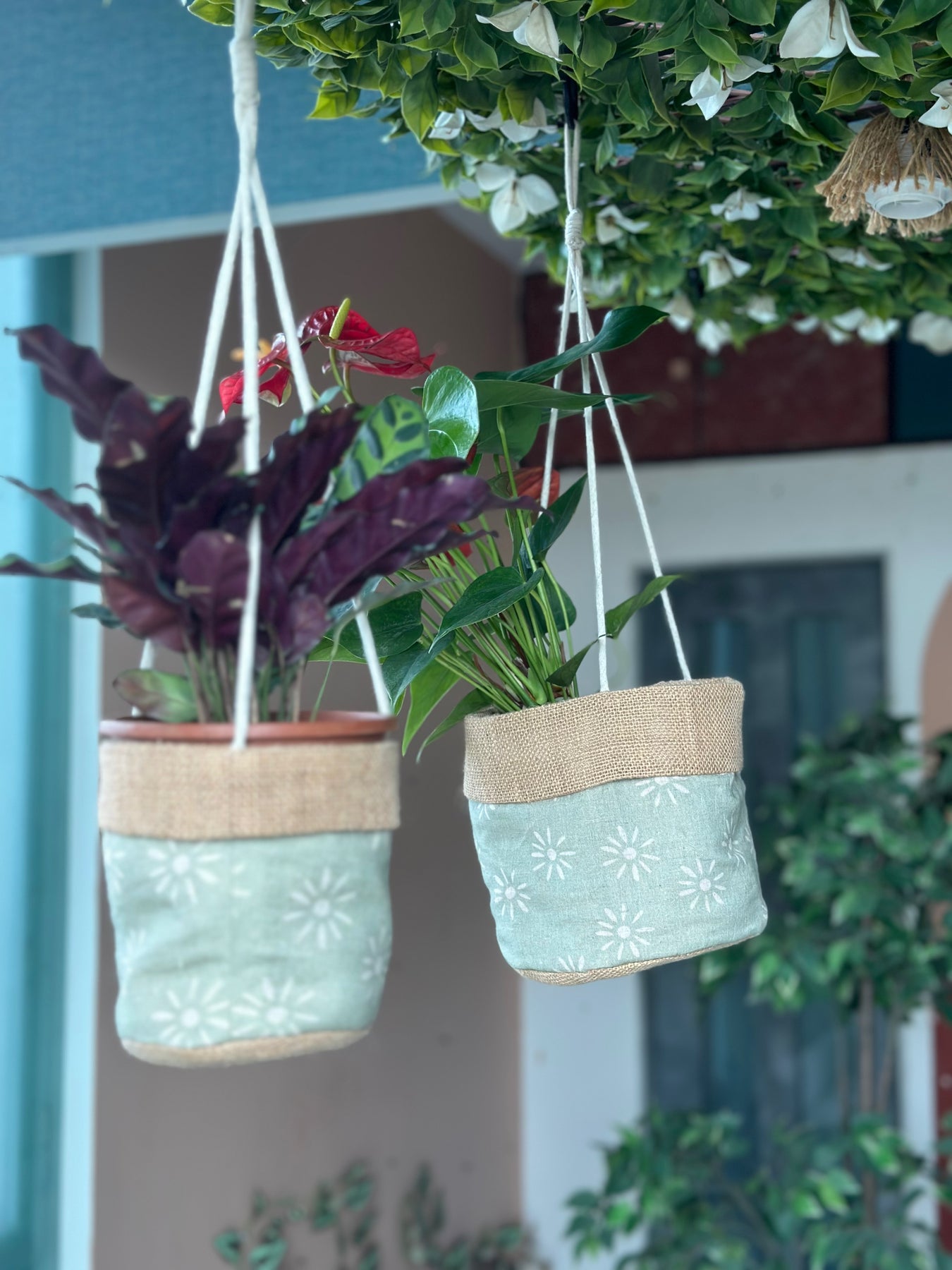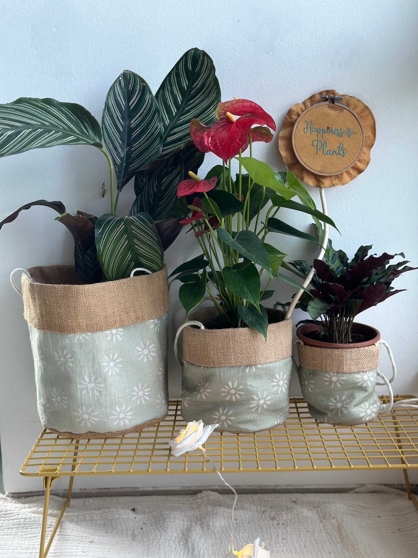 To ensure sturdiness, we've used two layers. The inner layer is made of burlap jute, while the top is covered with printed cotton fabric, finished off with a burlap border for a stylish touch. Each planter is handmade and unique, making every piece one of a kind.