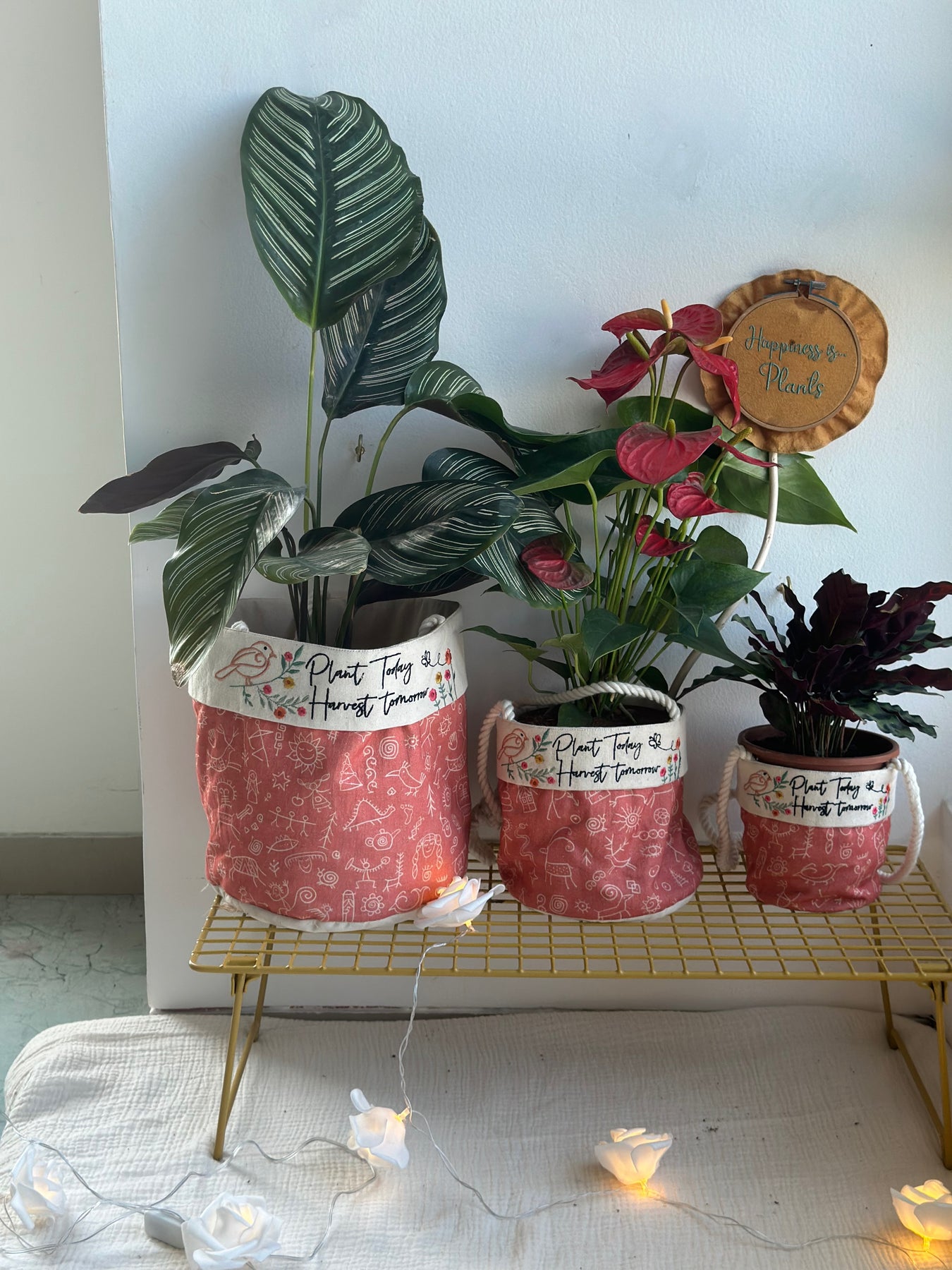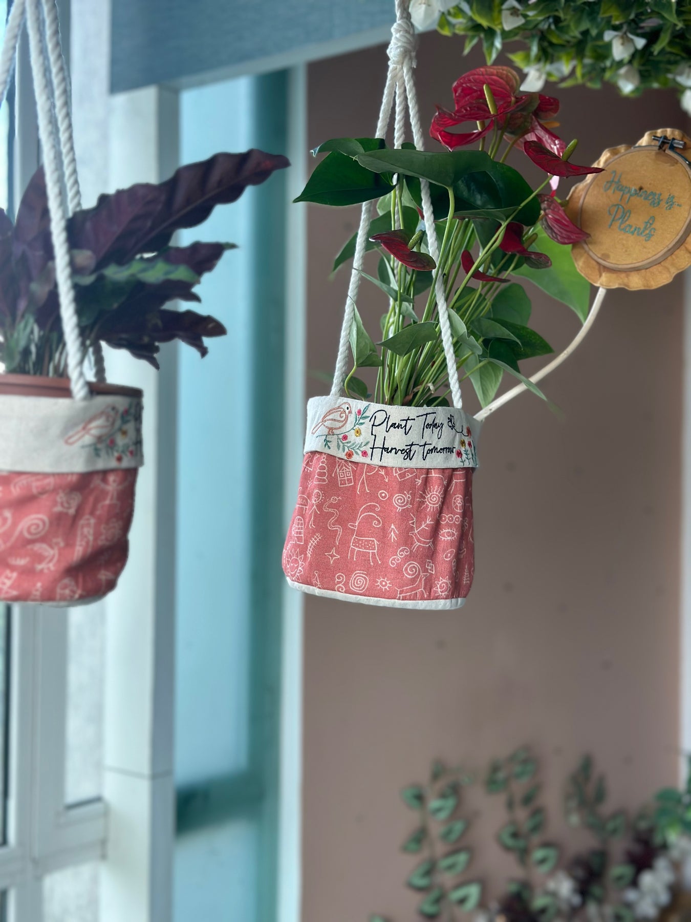 For durability, we've used two layers: the inner layer is made from ivory cotton jute, while the outer layer features printed cotton fabric, finished with an ivory border showcasing an enchanted garden design along with an empowering message. Each planter is handmade and one of a kind.