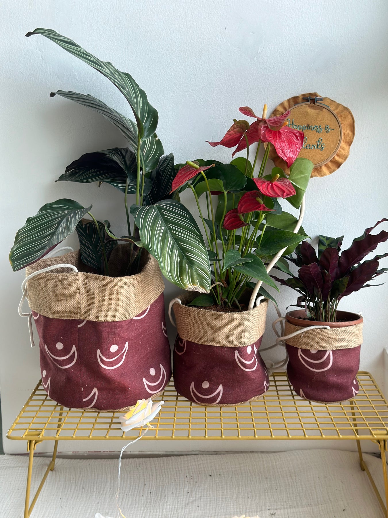 To ensure sturdiness, we've used two layers. The inner layer is made of burlap jute, while the top is covered with printed cotton fabric, finished off with a burlap border for a stylish touch. Each planter is handmade and unique, making every piece one of a kind.