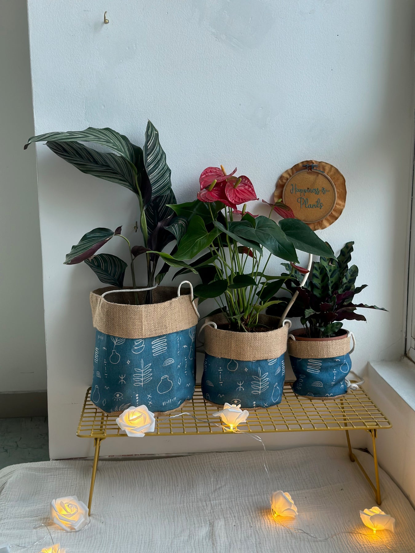To ensure sturdiness, we've used two layers. The inner layer is made of burlap jute, while the top is covered with printed cotton fabric, finished off with a burlap border for a stylish touch. Each planter is handmade and unique, making every piece one of a kind.