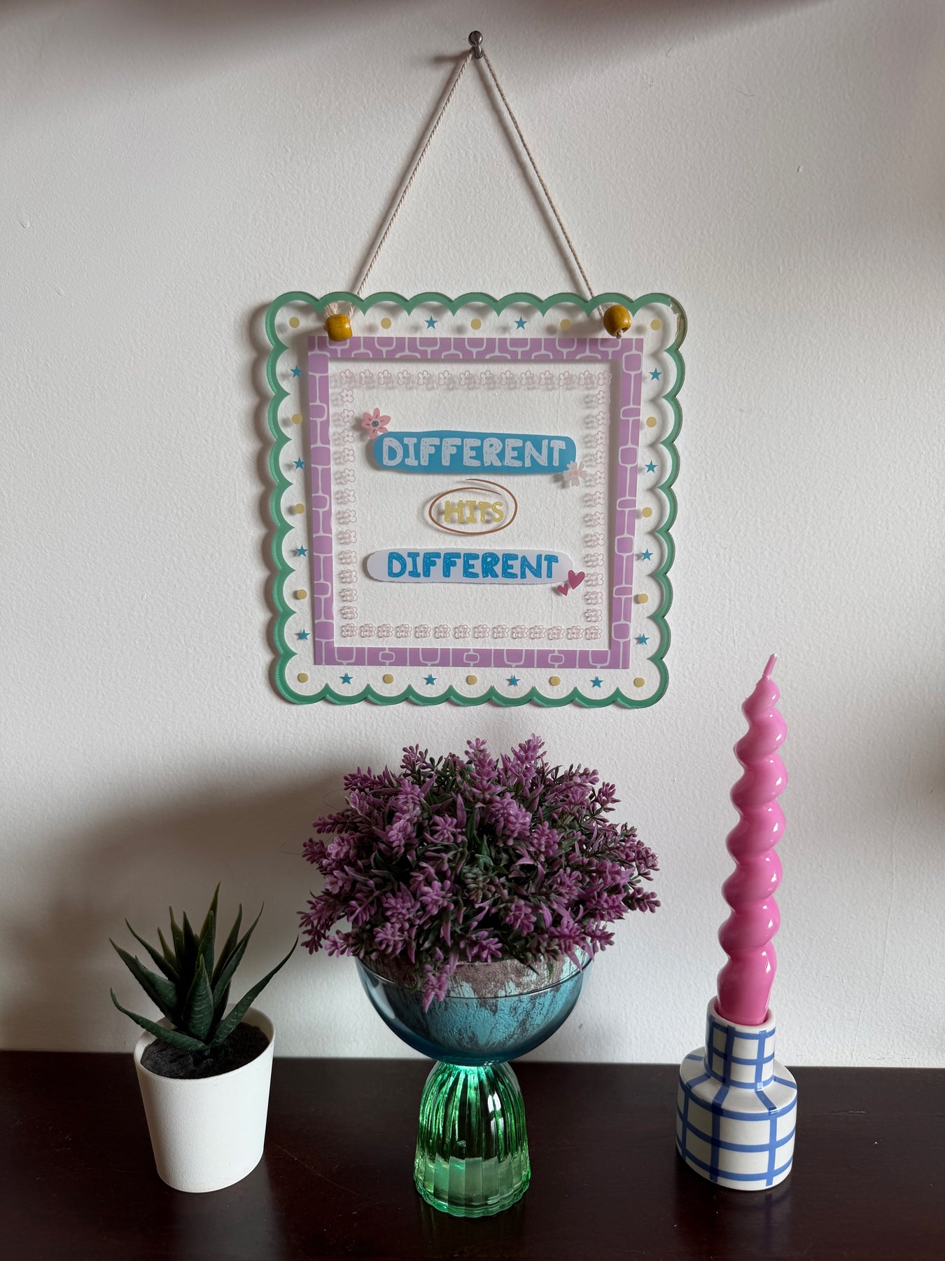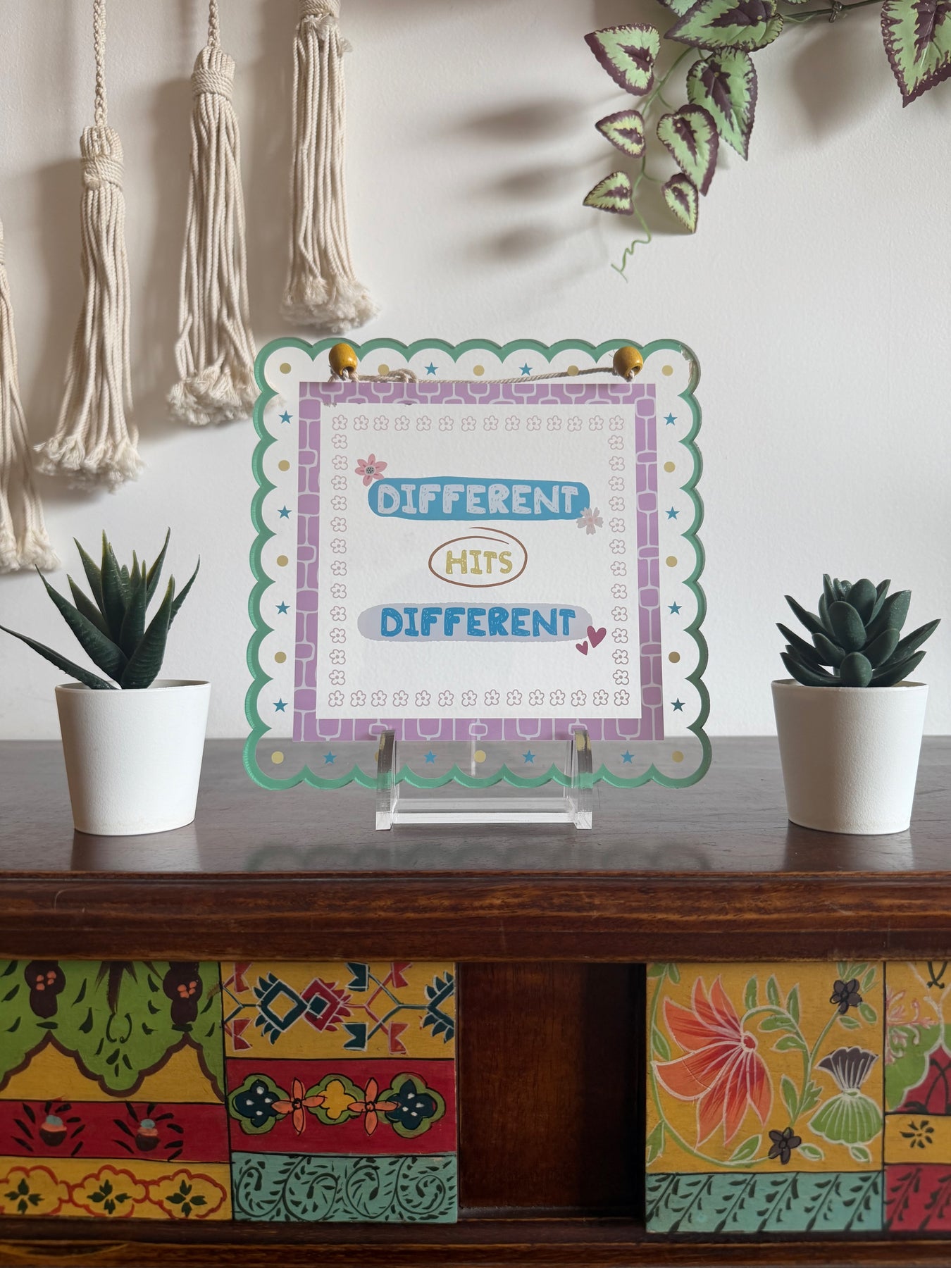 This square design is framed with a green scalloped border adorned with tiny stars and dots, featuring softly designed edges with floral and heart illustrations that make it feel full of life. The quote “Different hits different” is a lighthearted reminder that standing out and staying true to yourself always brings its own kind of magic.