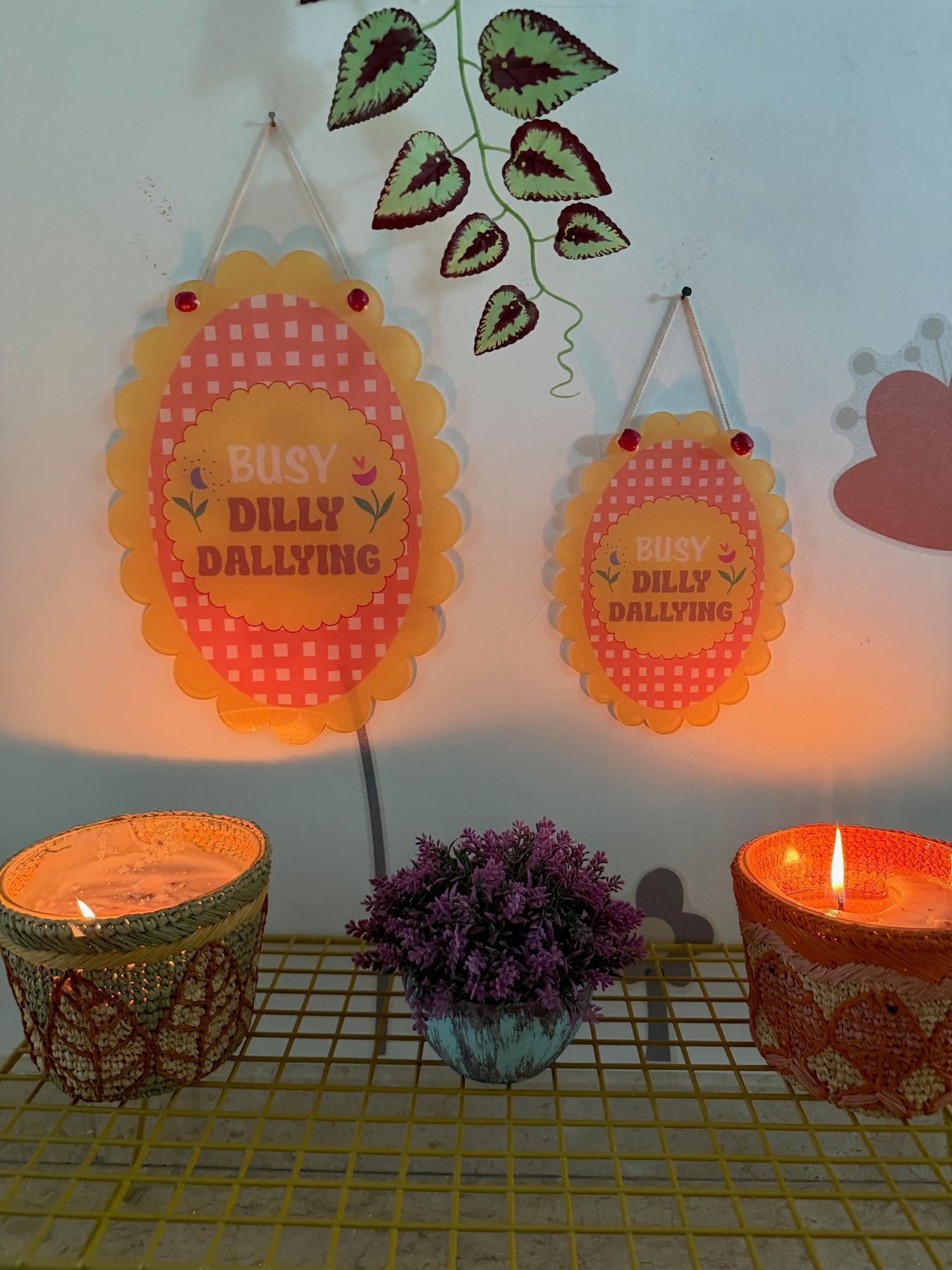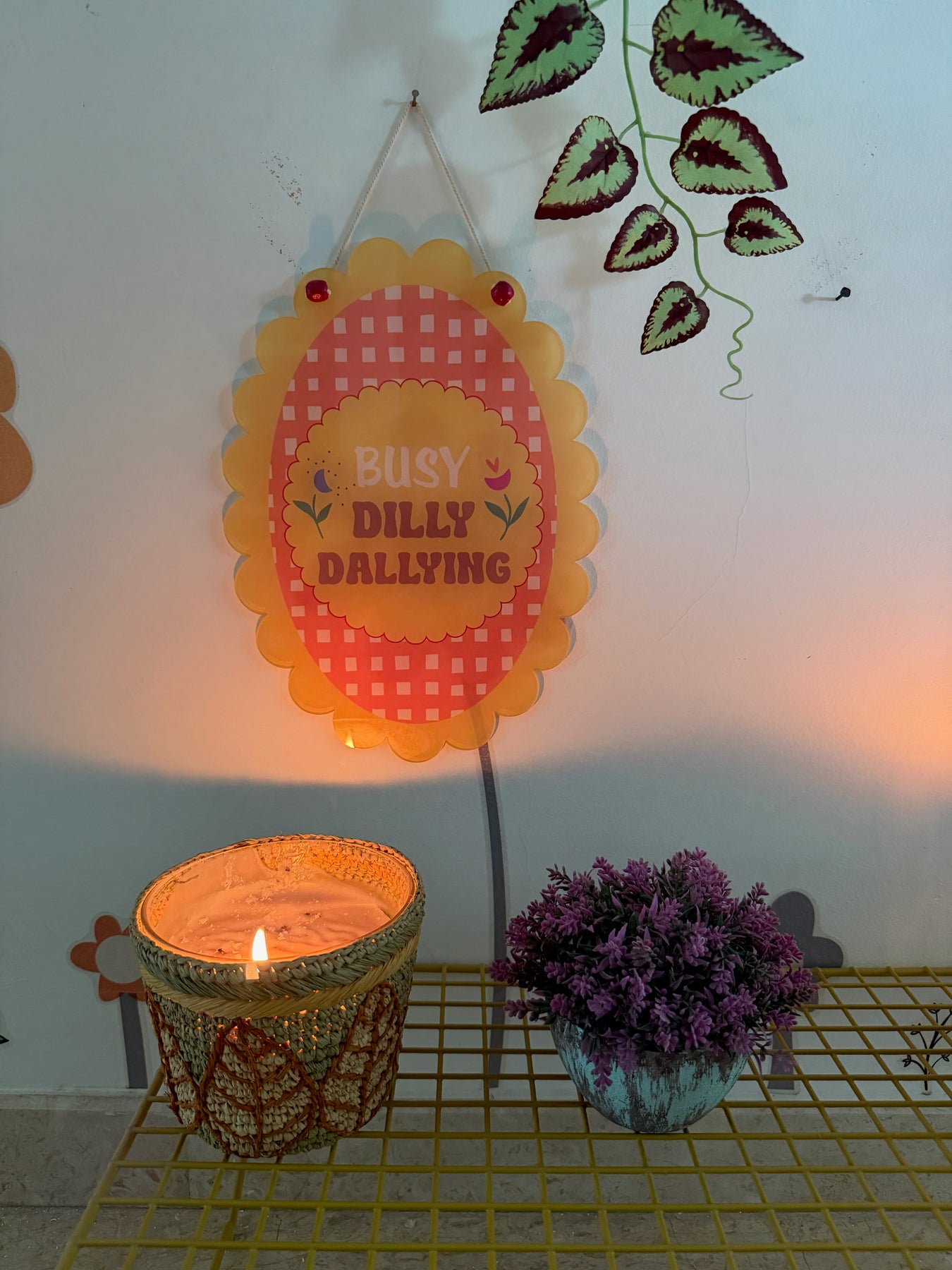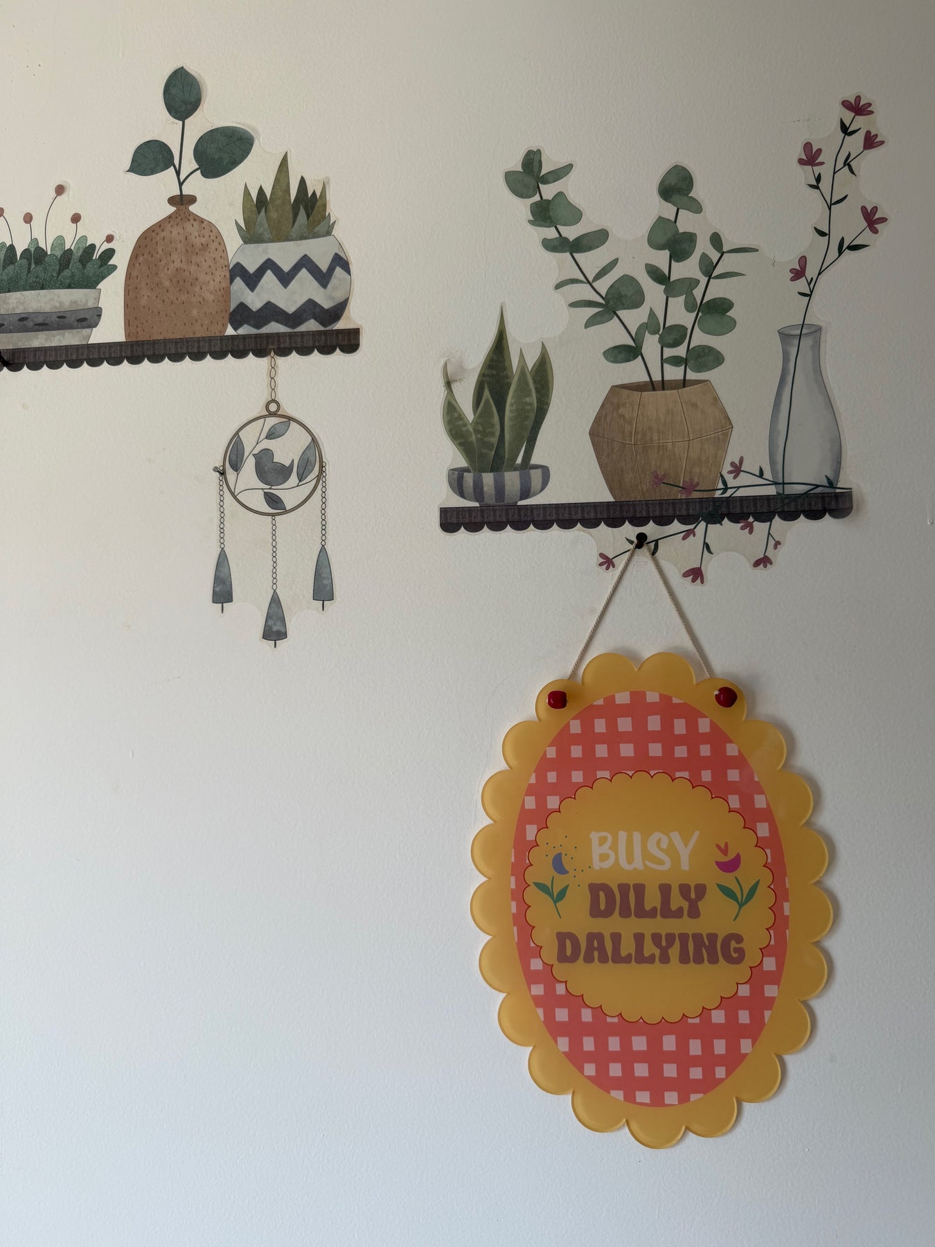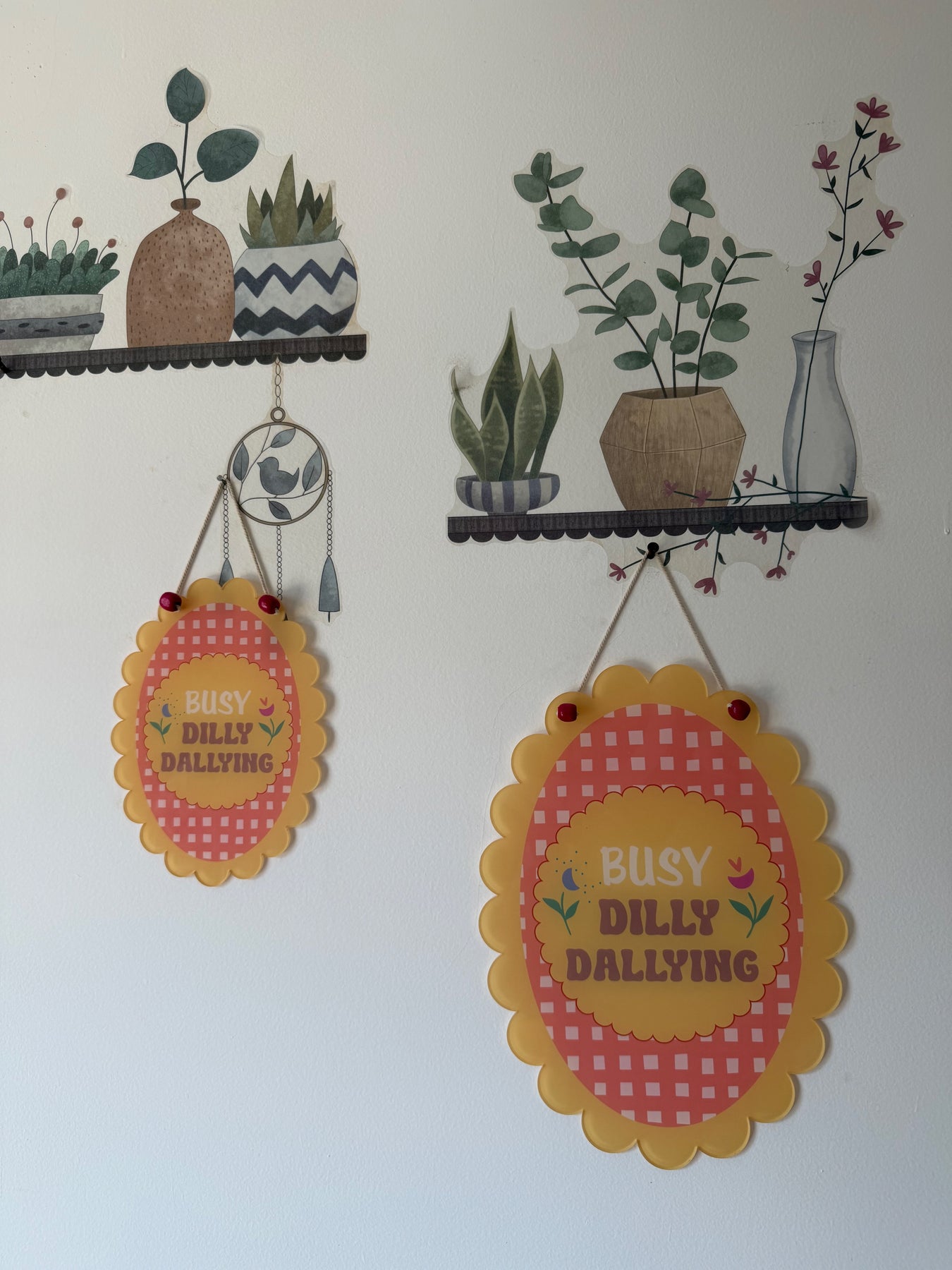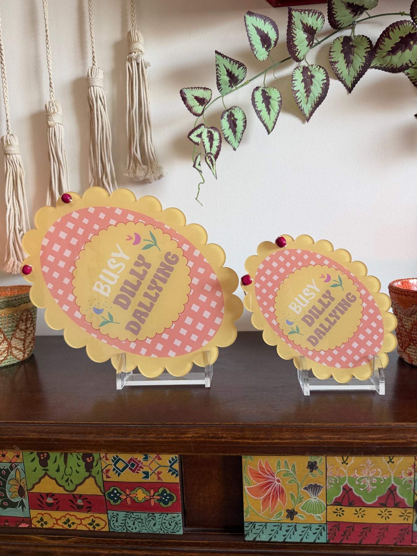 This piece features an oval with yellow scalloped borders and a soft coral-and-white pattern that gives it a warm, textured feel. In the center, a circular shape with curved borders displays the quirky and carefree message “Busy Dilly Dallying.” A reminder that it’s okay to take your time and simply be.