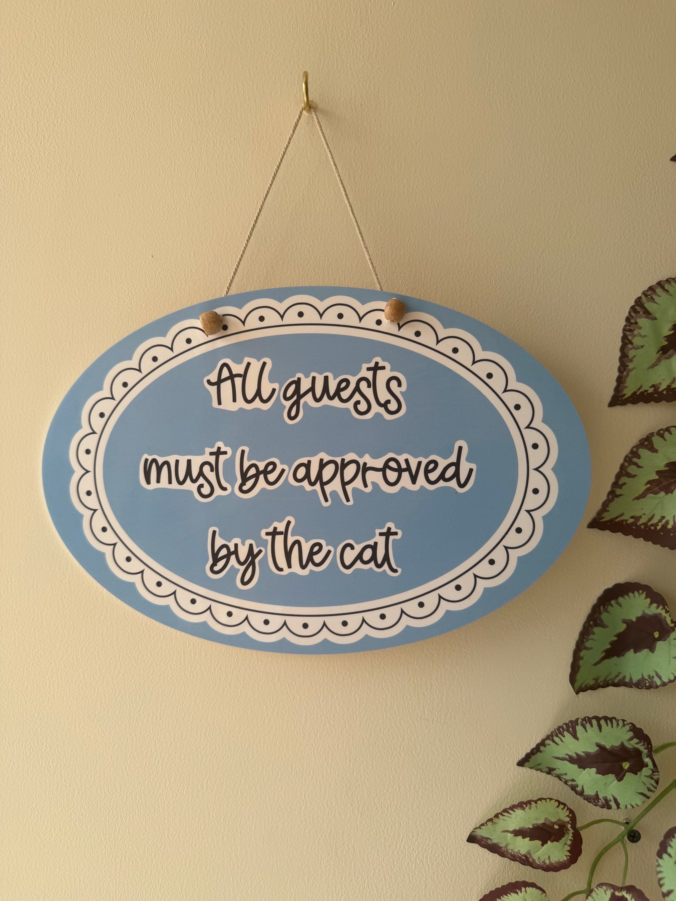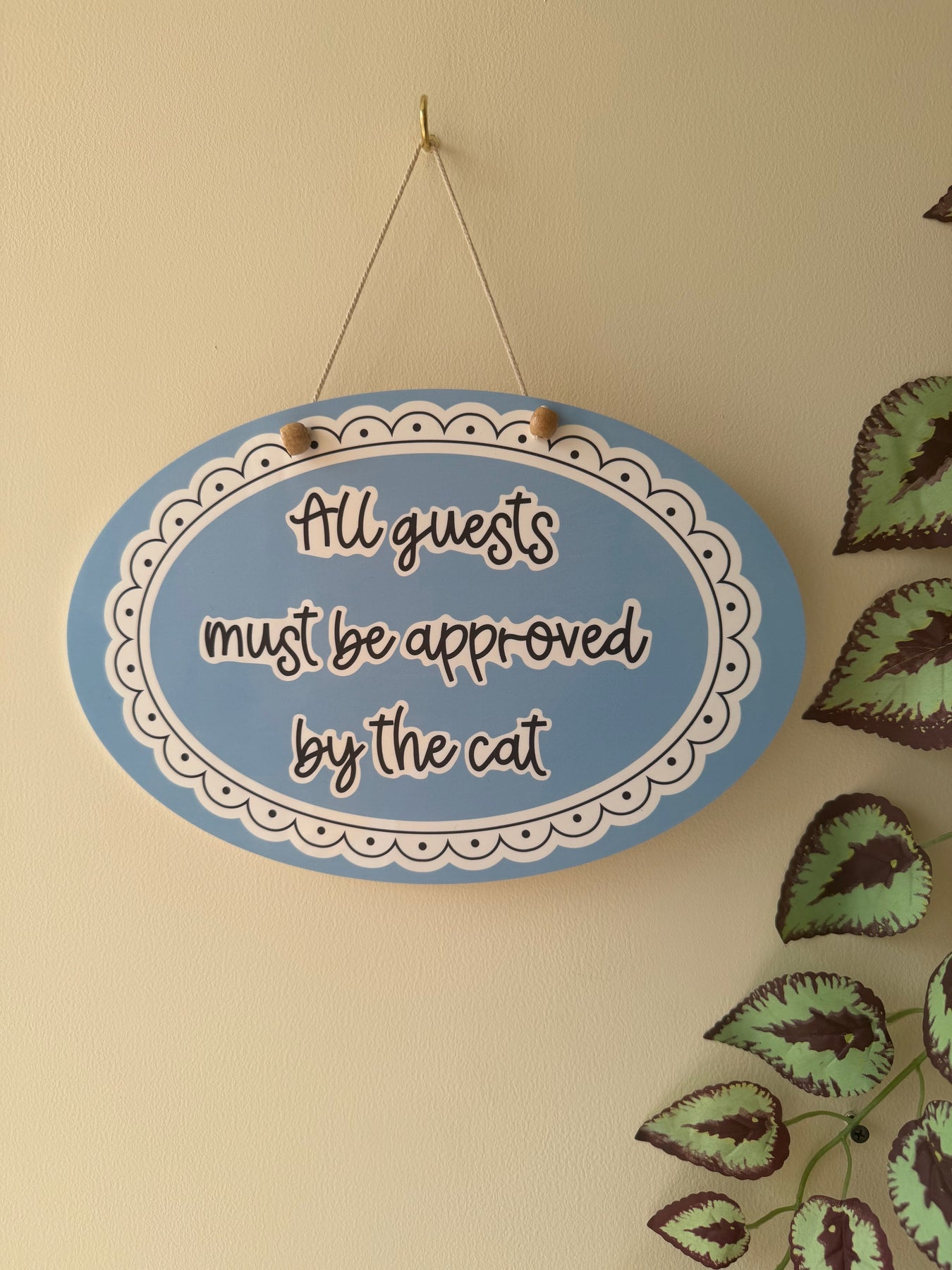 This blue horizontal oval features soft inner borders that frame the quote in a clean, playful way. The quote “All guests must be approved by the cat.” adds a fun, relatable touch — perfect for anyone whose home is lovingly ruled by their feline friend.
