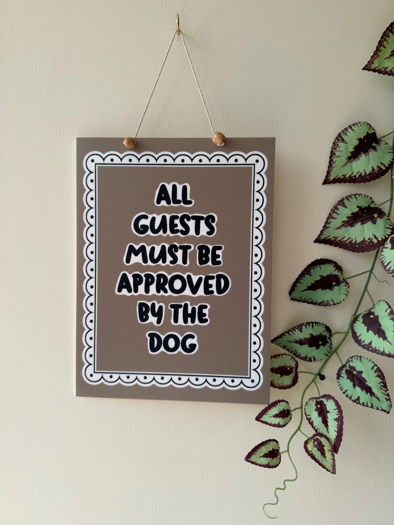This rectangle comes in a soft light brown tone with gently crafted inner borders that give it a neat, refined look. The quote “All guests must be approved by the dog.” captures that affectionate, funny truth of pet households — perfect for entryways, kitchens, or anywhere your dog likes to supervise visitors.