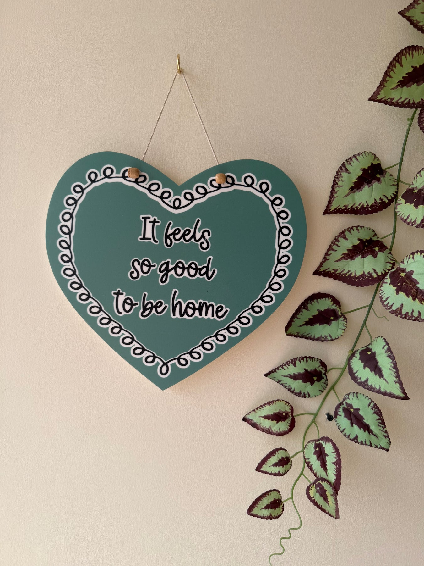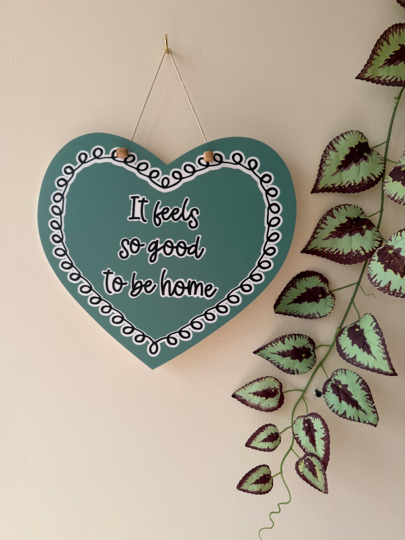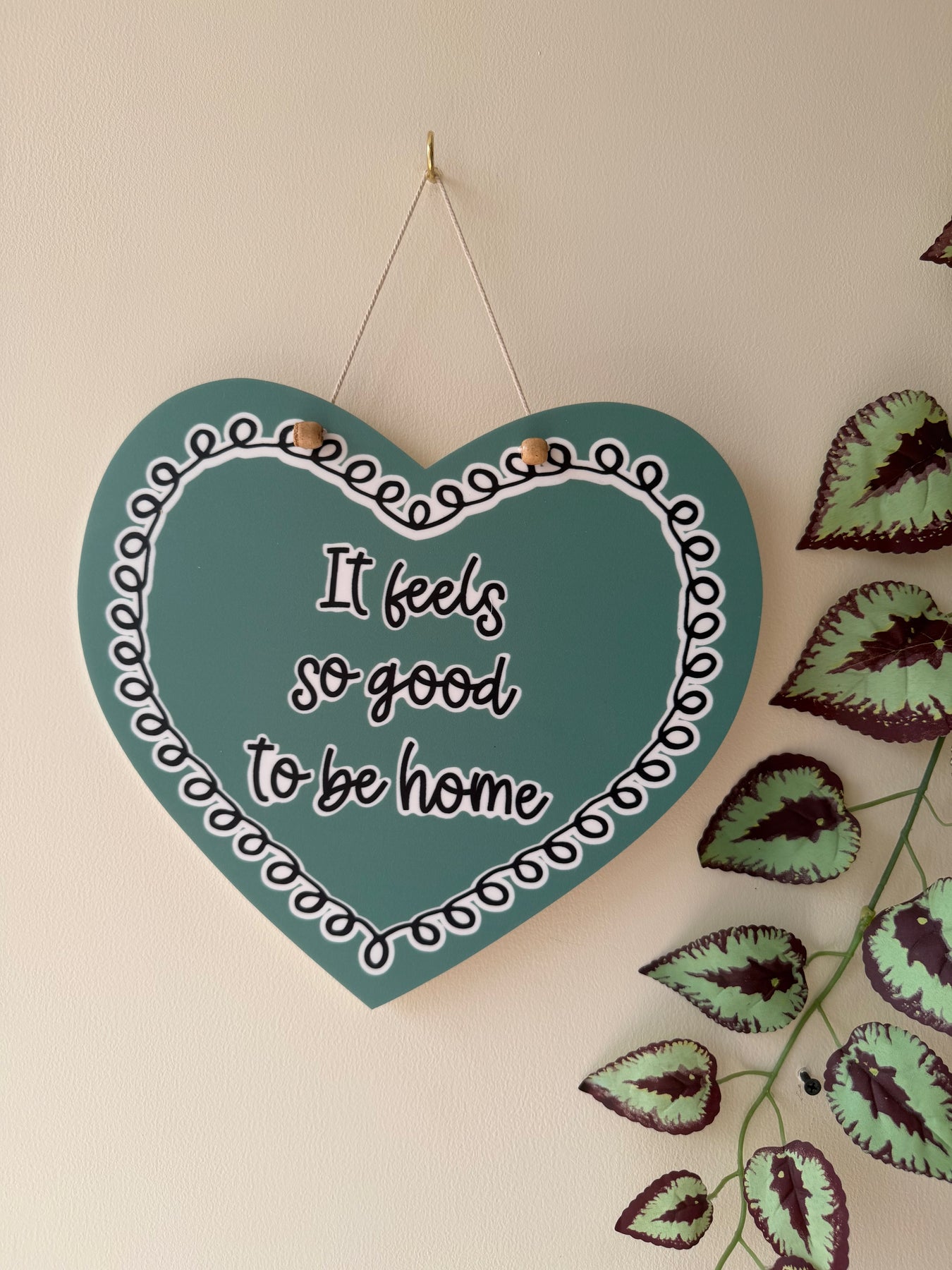 This soft green heart is designed with subtle spiral borders that wrap gently around the quote “It feels so good to be home.” It captures that familiar sense of comfort and calm — the kind that hits the moment you walk through your door.
