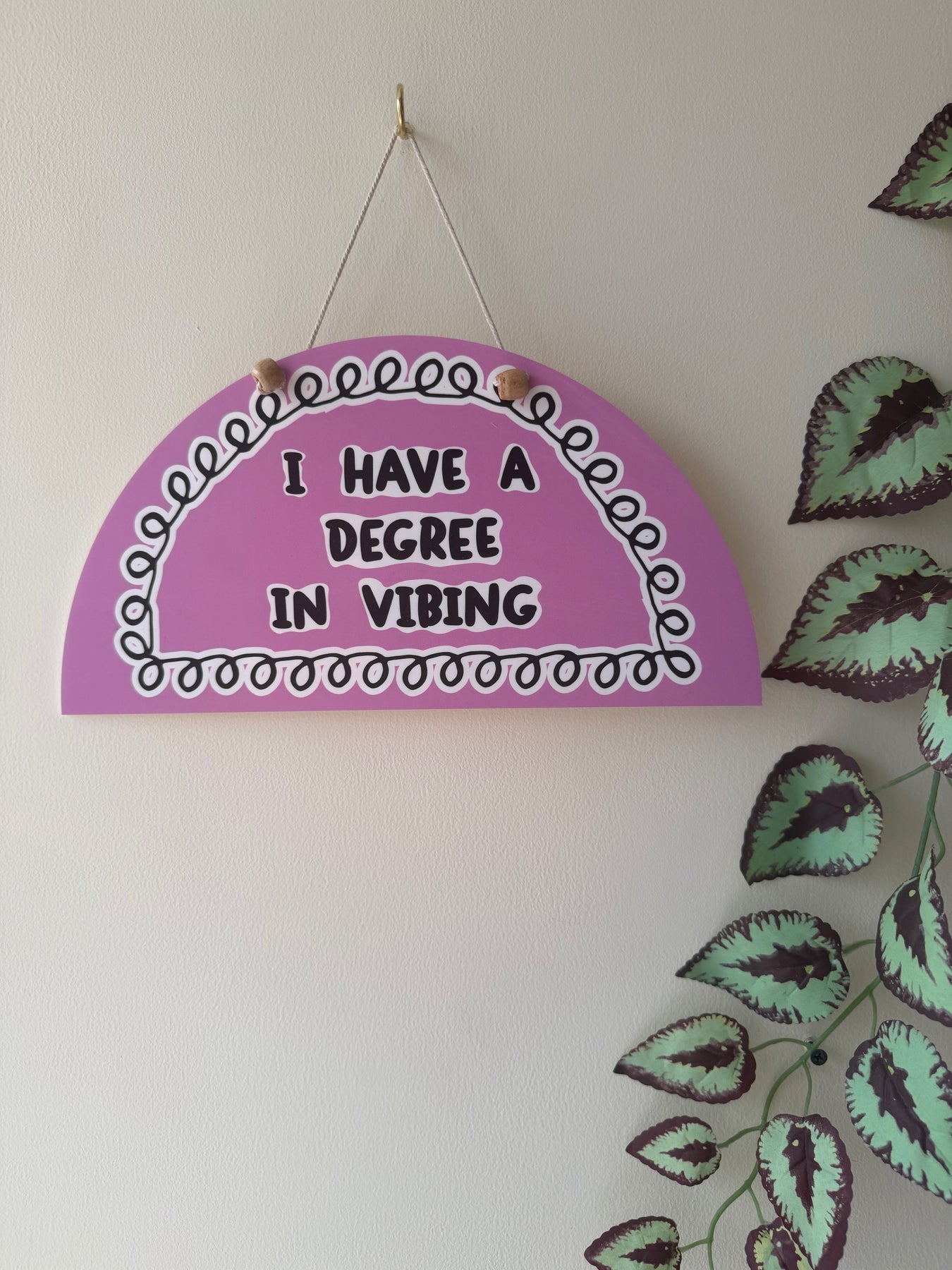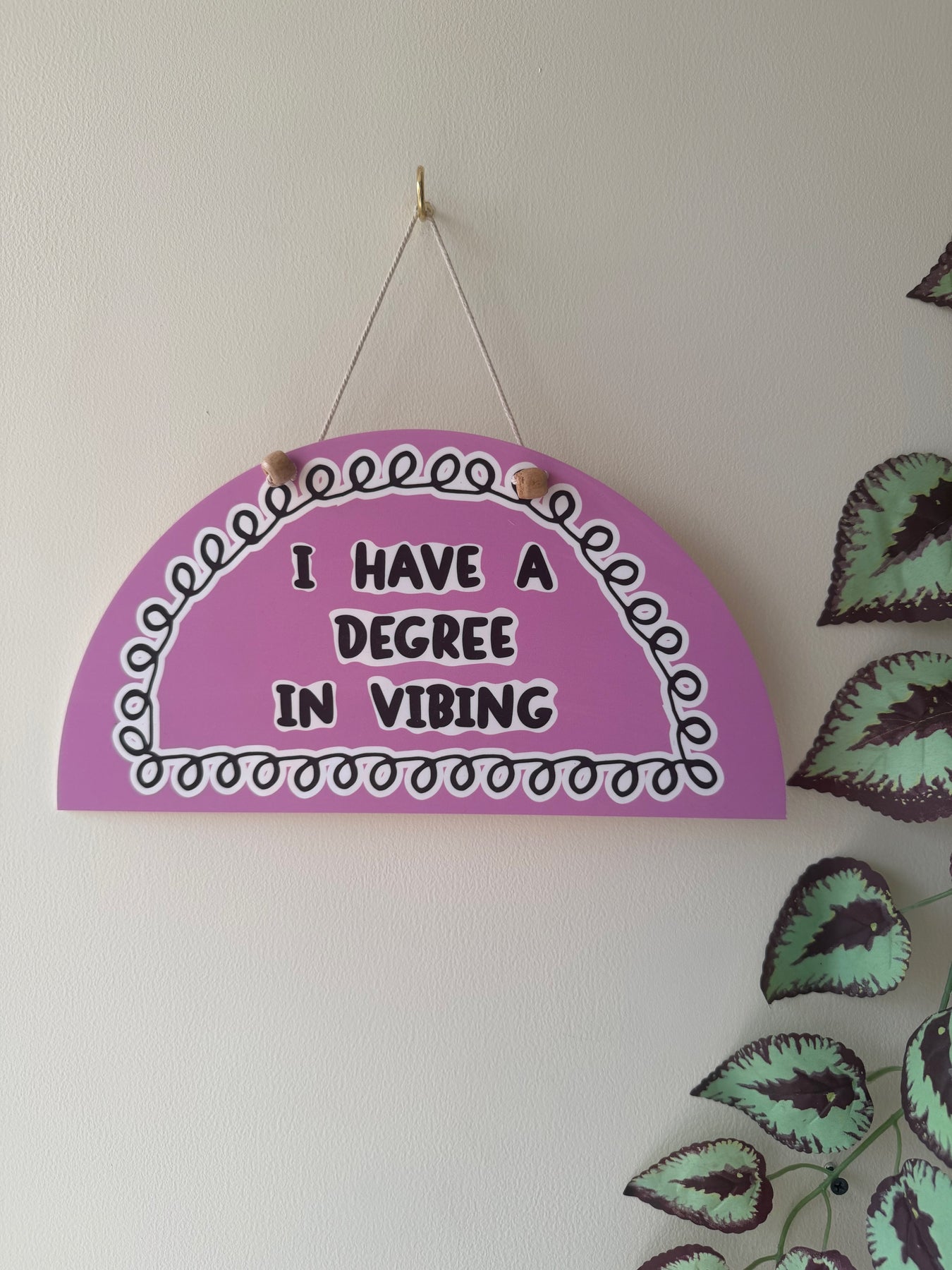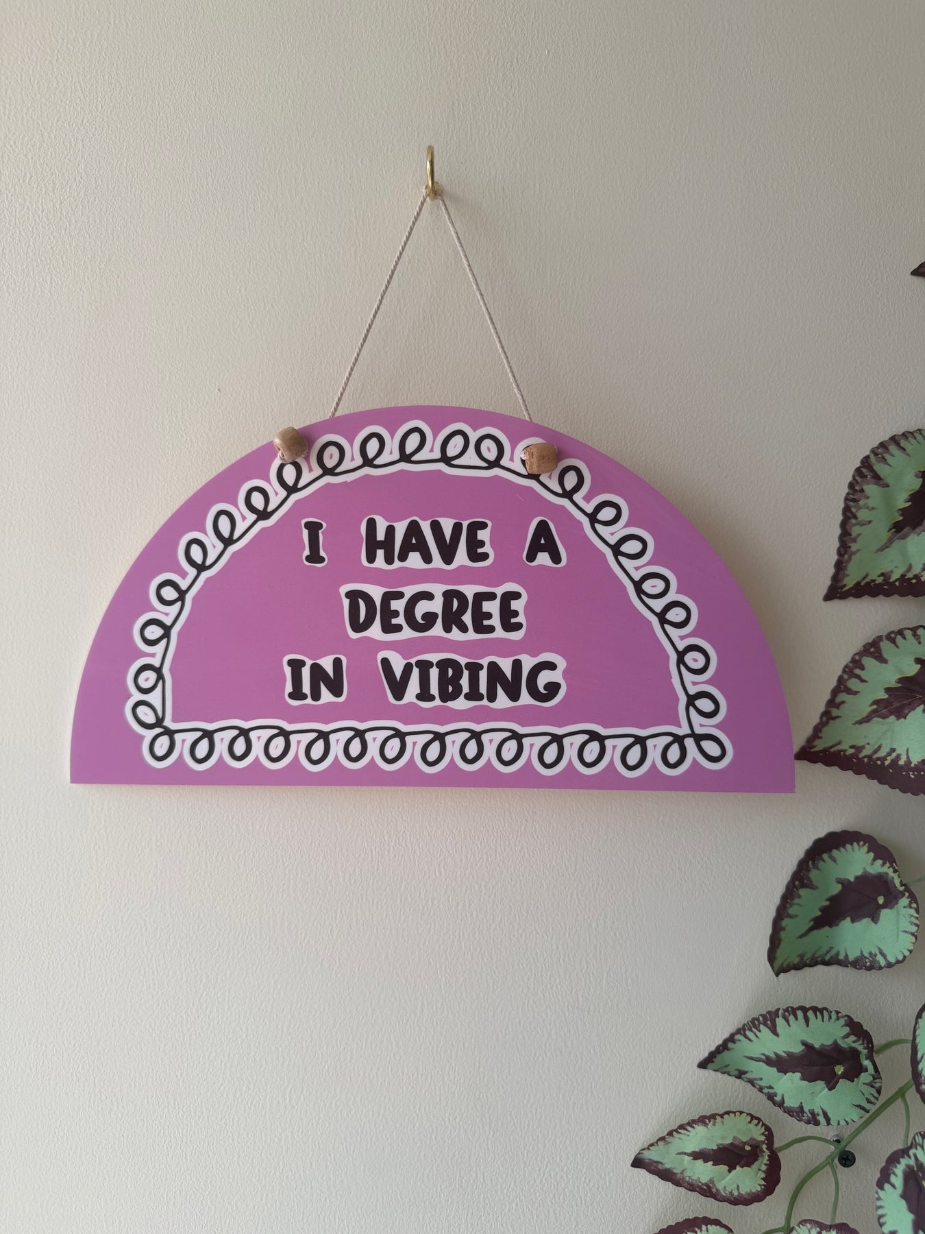 This lilac semicircle wall art features soft inner detailing that gently frames the quote, “I have a degree in vibing”. Light-hearted and carefree, the message adds a fun, relaxed energy to your space — perfect for those who appreciate good vibes, calm moments, and effortless style.