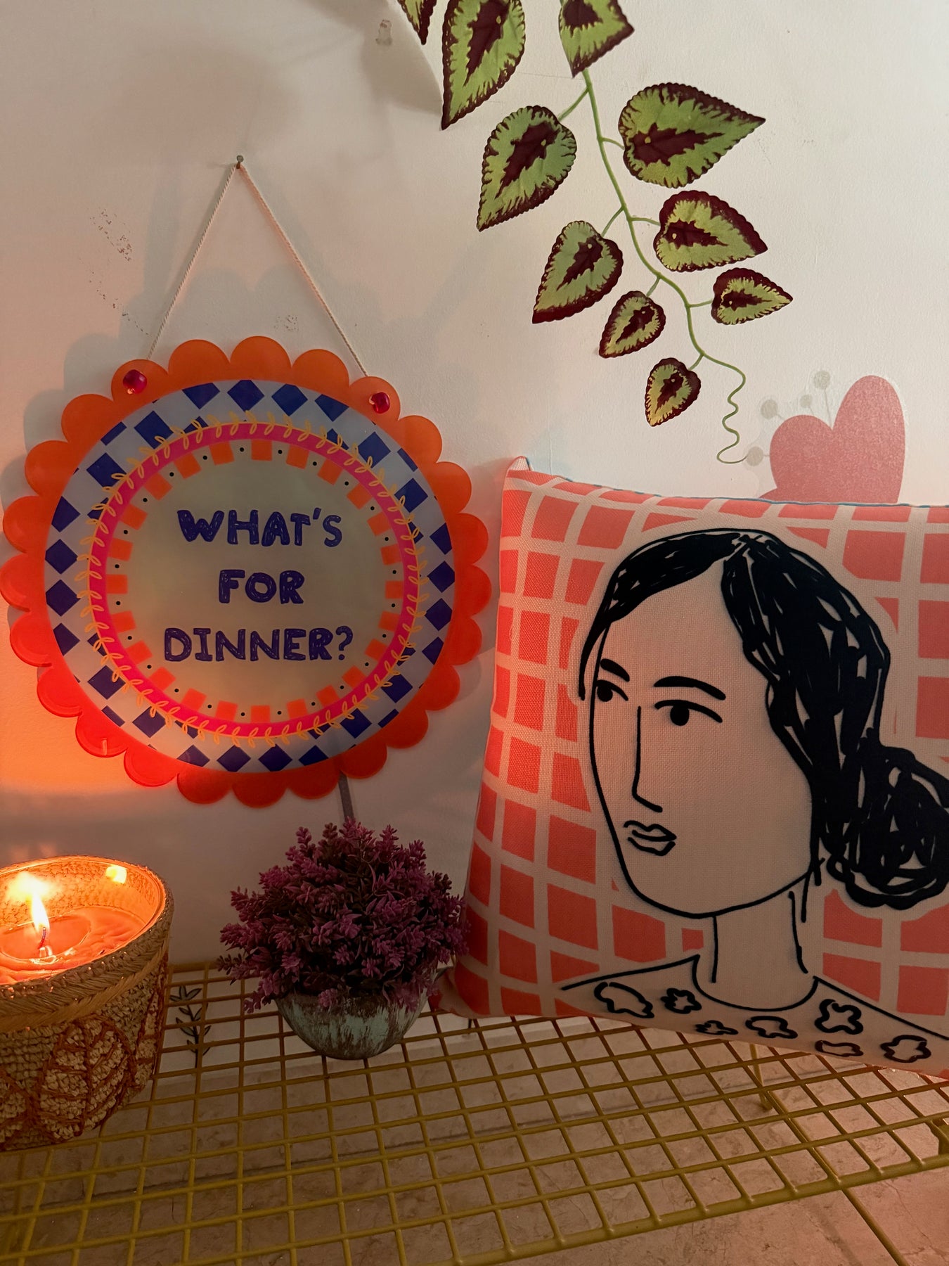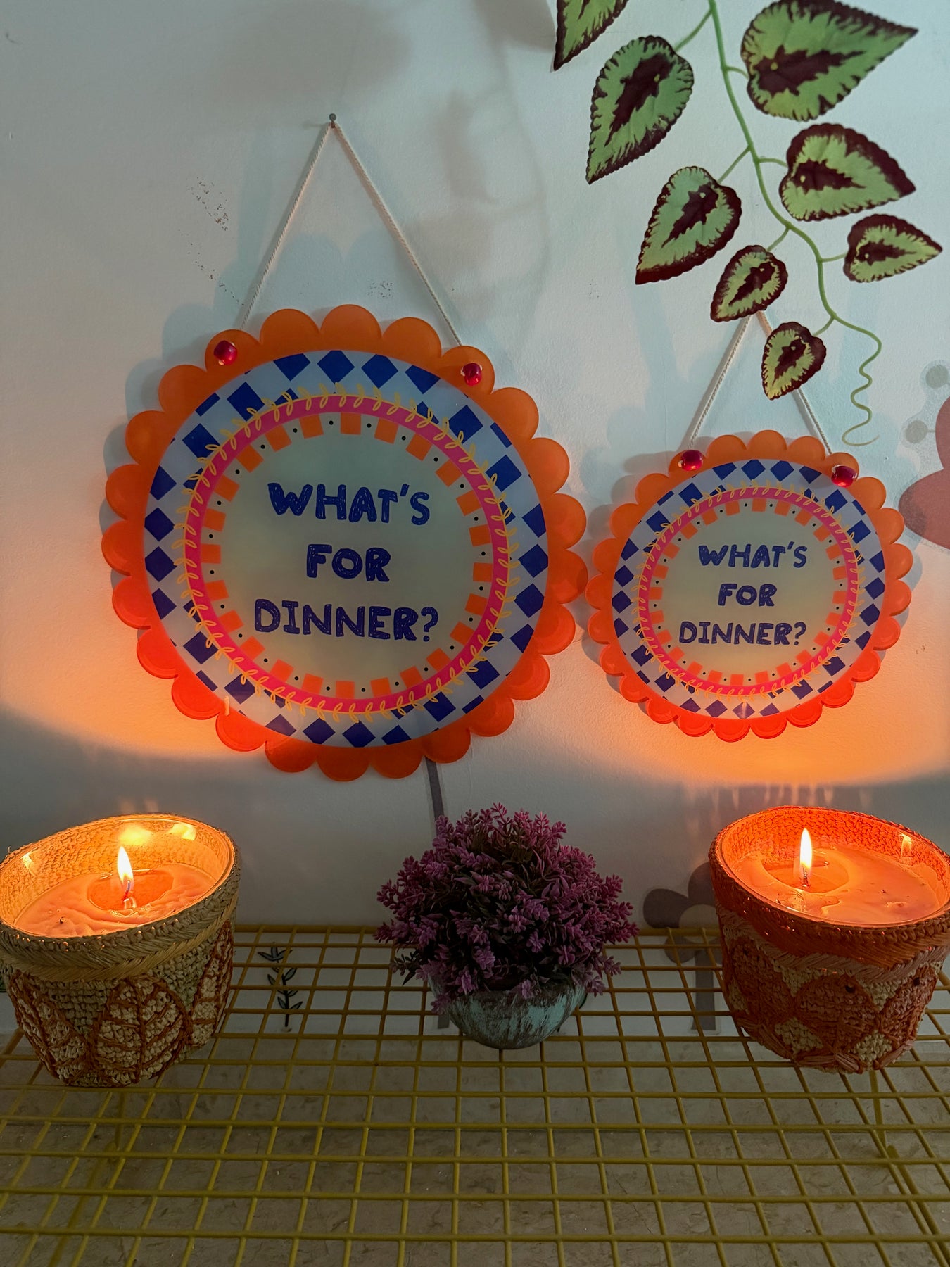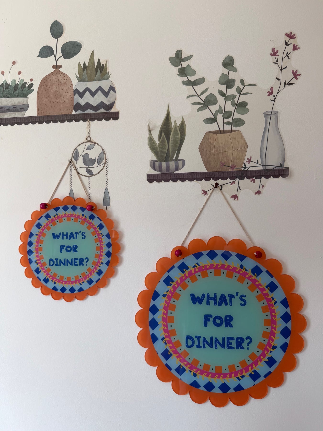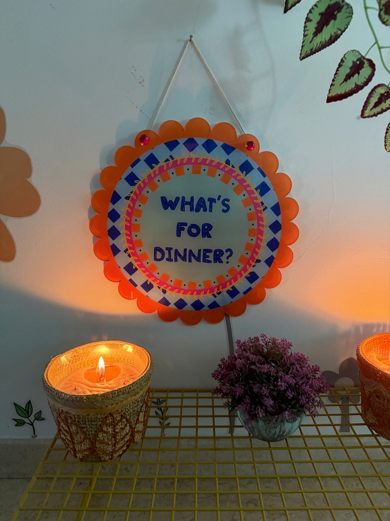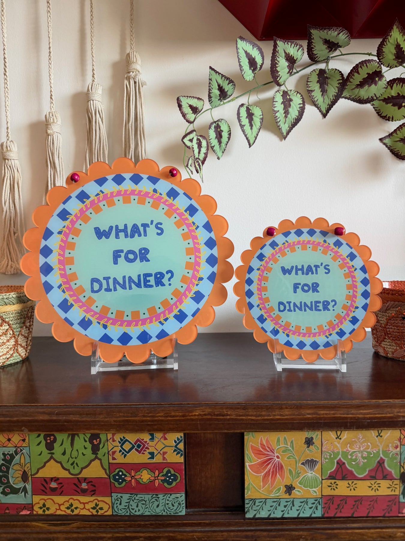 This design features a blue circle with orange scalloped edges that bring a soft, floral touch. At the center, a smaller circle with gently patterned borders holds the phrase “What’s for dinner?” — a cheerful nod to cozy kitchen moments and shared meals.