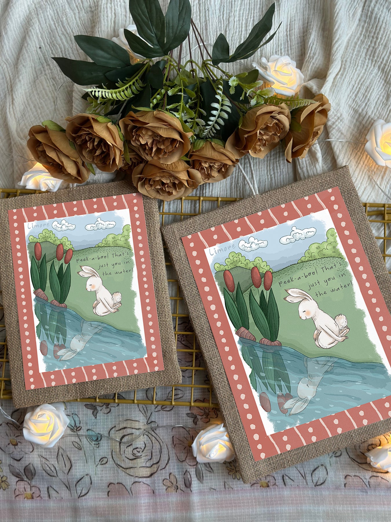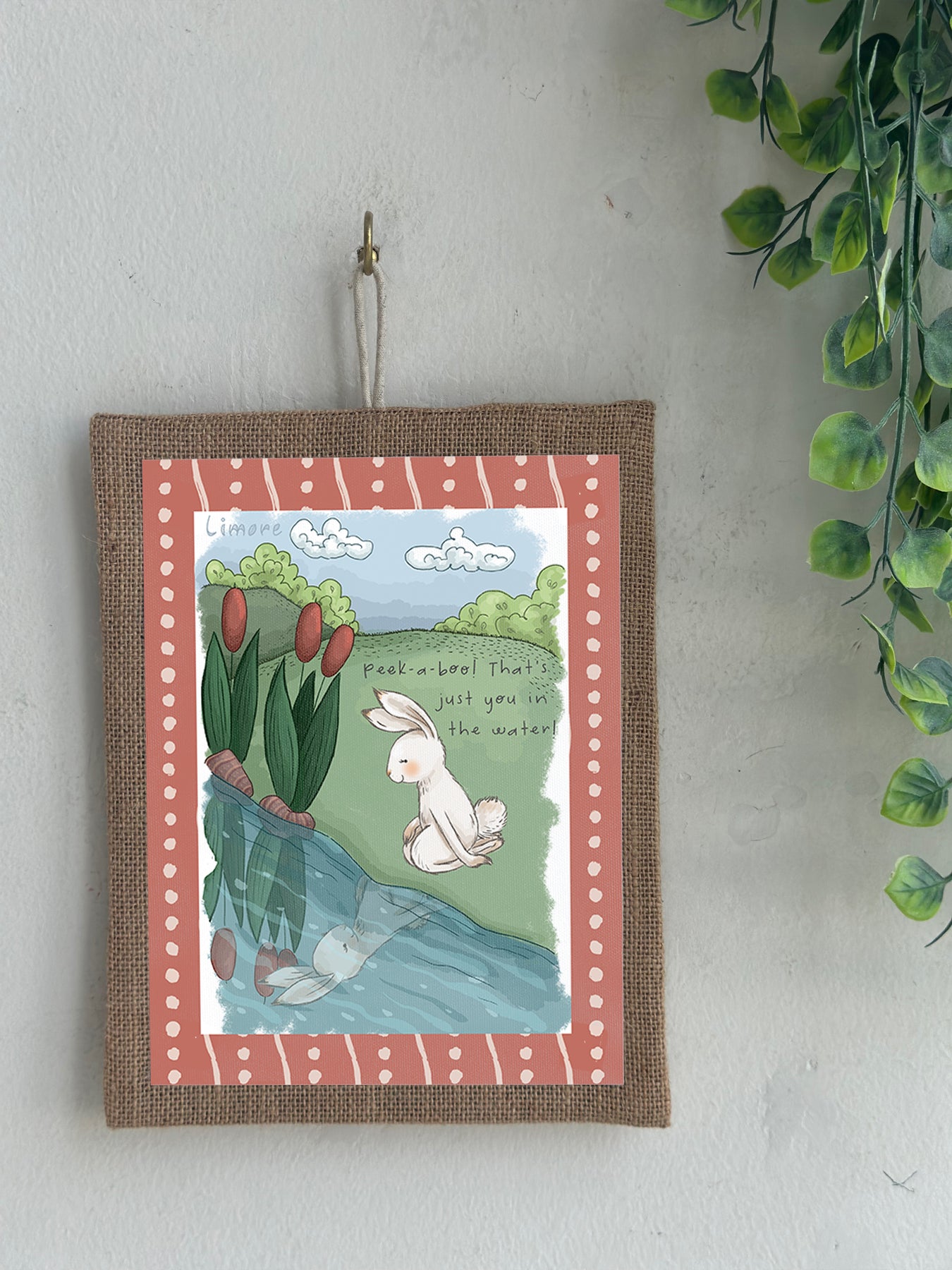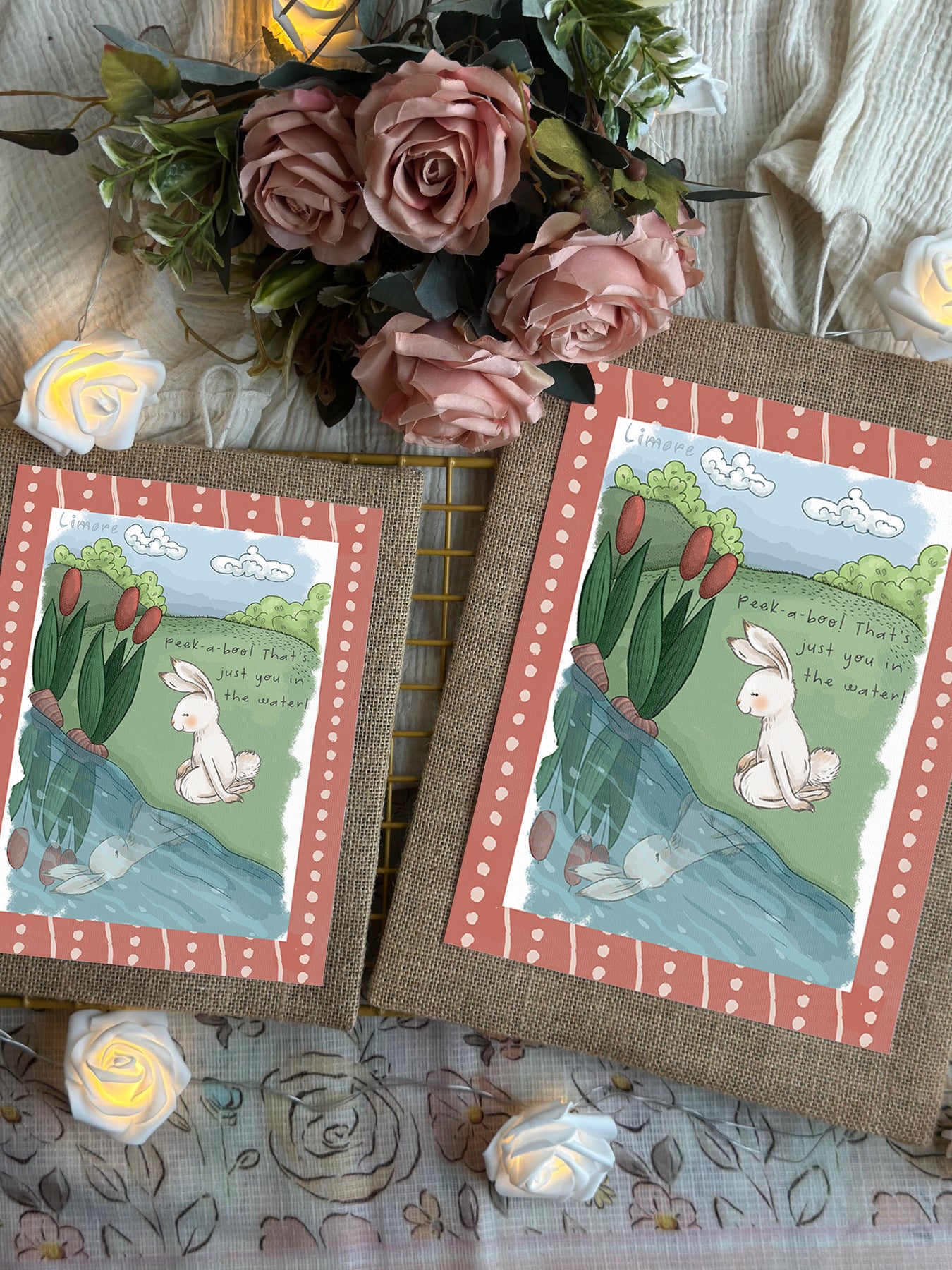This charming piece from our Bunny Tales collection shows Bunny discovering its reflection in the water, turning a simple moment into a playful lesson. The quote reads: “Peek-a-boo, that’s just you in the water.”