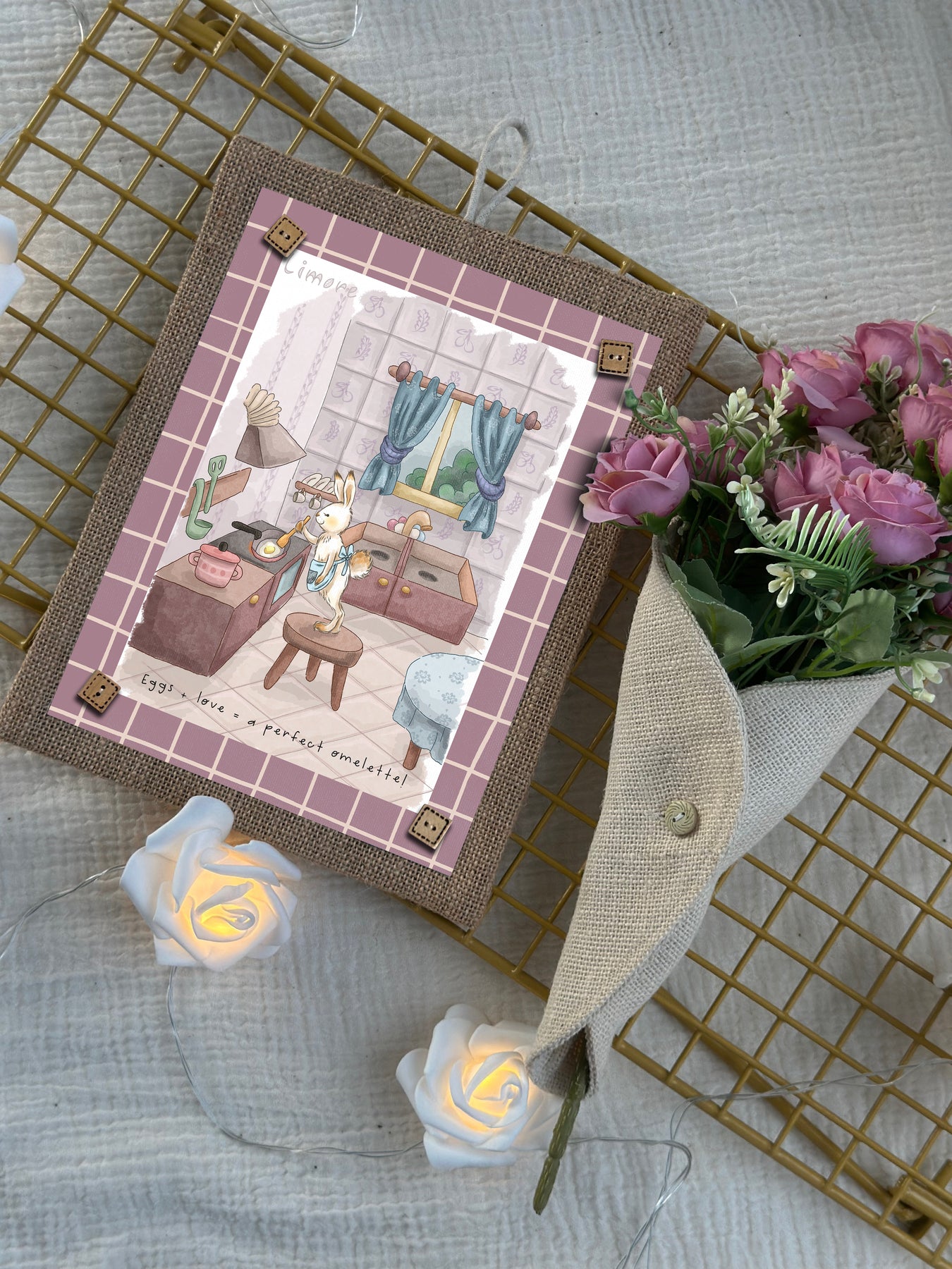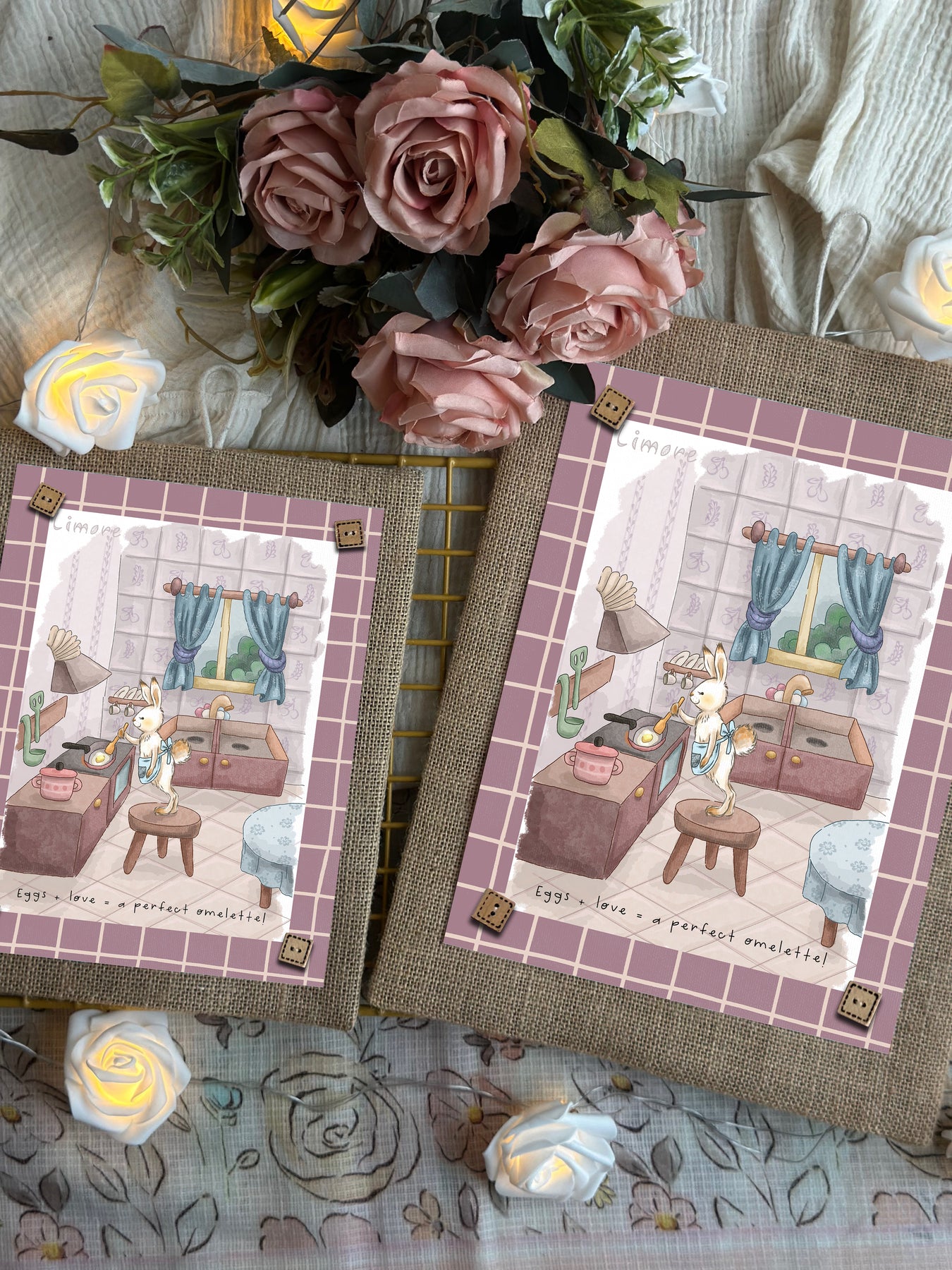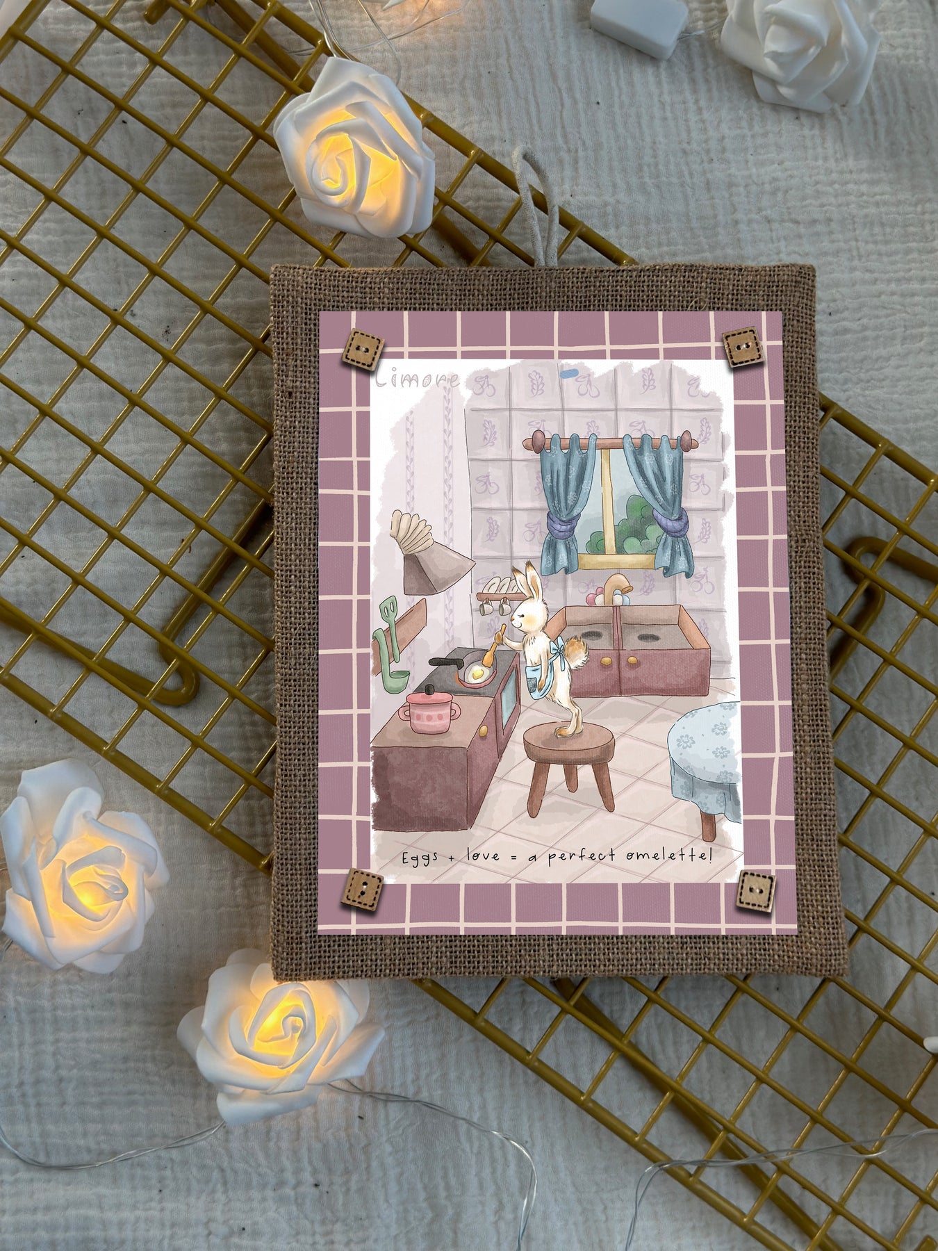 This cheerful piece from our Bunny’s Fun Food Journal collection features Bunny carefully making a fluffy omelette. The quote reads: “Eggs + love = a perfect omelette.”