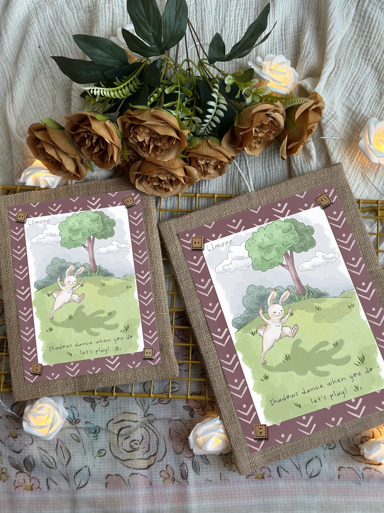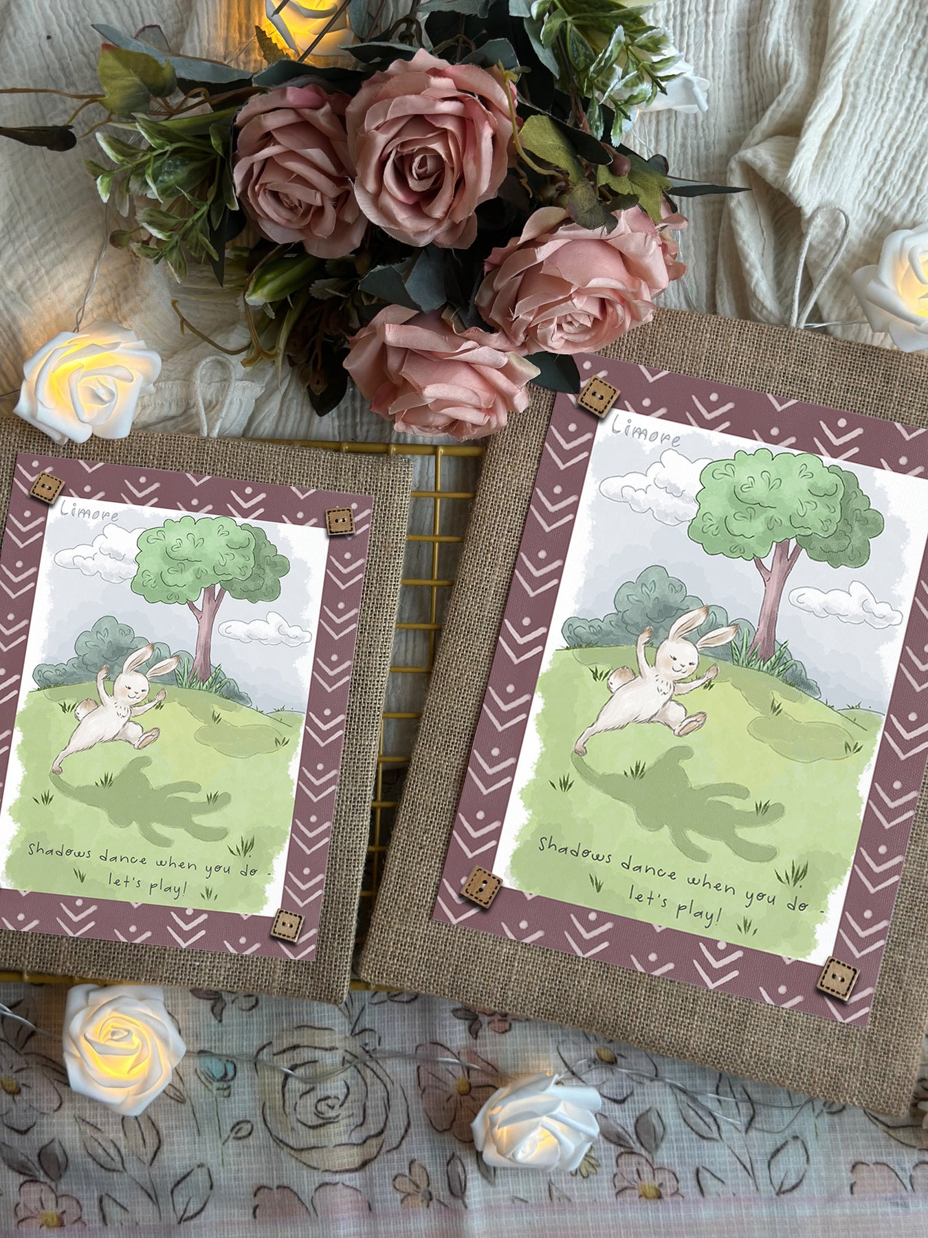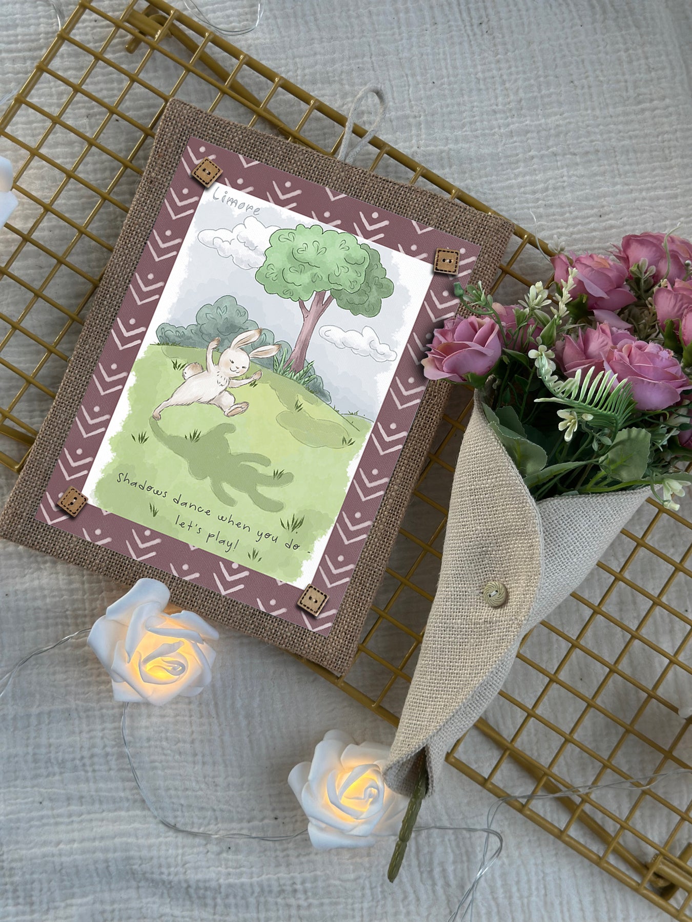 This joyful piece from our Bunny Tales collection shows Bunny discovering the magic of shadows dancing along in the grass. The quote reads: “Shadows dance when you do, let’s play.”