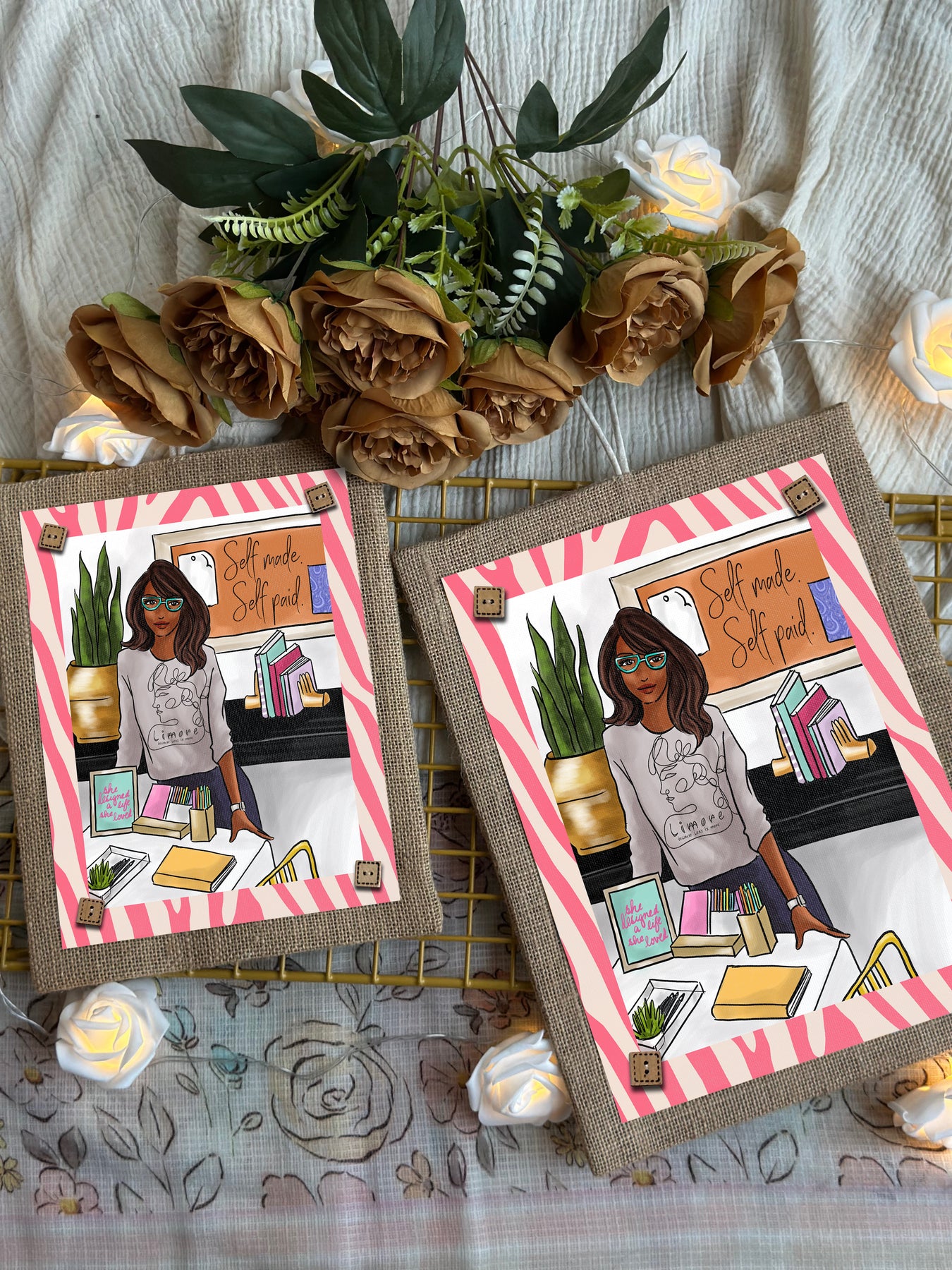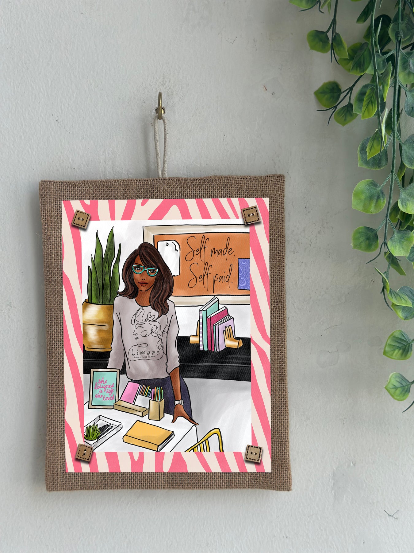 This artwork celebrates independence and accomplishment, featuring a woman standing confidently with the quote “Self-Made. Self-Paid.” highlighted behind her. A framed message on her desk reads, “She designed a life she loved,” reinforcing the joy and pride that comes from creating your own path.